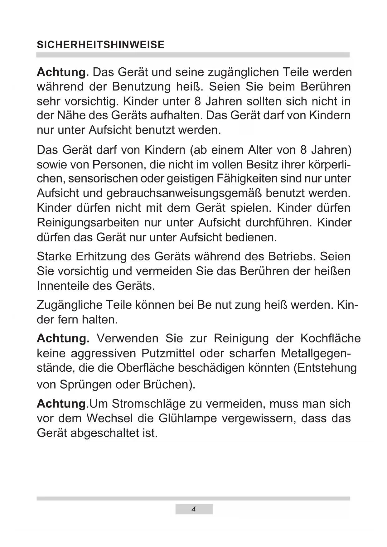 - Technische Daten SICHERHEITSHINWEISE Achtung. Das Gerät und seine zugänglichen Teile werden während der Benutzung heiß. Seien Sie beim Berühren sehr vorsichtig. Kinder unter 8 Jahren sollten sich nicht in der Nähe des Geräts aufhalten. Das Gerät darf von Kindern nur unter Aufsicht benutzt werden. Das Gerät darf von Kindern (ab einem Alter von 8 Jahren) sowie von Personen, die nicht im vollen Besitz ihrer körperli- chen, sensorischen oder geistigen Fähigkeiten sind nur unter Aufsicht und gebrauchsanweisungsgemäß benutzt werden. Kinder dürfen nicht mit dem Gerät spielen. Kinder dürfen Reinigungsarbeiten nur unter Aufsicht durchführen. Kinder dürfen das Gerät nur unter Aufsicht bedienen. Starke Erhitzung des Geräts während des Betriebs. Seien Sie vorsichtig und vermeiden Sie das Berühren der heißen Innenteile des Geräts. Zugängliche Teile können bei Be nut zung heiß werden. Kin- der fern halten. Achtung. Verwenden Sie zur Reinigung der Kochäche keine aggressiven Putzmittel oder scharfen Metallgegen- stände, die die Oberäche beschädigen könnten (Entstehung von Sprüngen oder Brüchen). Achtung.Um Stromschläge zu vermeiden, muss man sich vor dem Wechsel die Glühlampe vergewissern, dass das Gerät abgeschaltet ist.5 SICHERHEITSHINWEISE ● Andere Haushaltsgeräte samt ihren Anschlusskabeln dürfen den Backofen nicht berühren auiegen, da deren Isolierung nicht hitzebeständig ist. ● Beim Braten den Herd nicht ohne Aufsicht lassen! Öl und Fett können sich durch Überhitzen oder Überlaufen selbst entzünden. ● Kochgeschirr mit einem Gewicht über 15 kg darf nicht auf die geönete Backofen- tür. ● In nicht betriebsfähigem Zustand darf der Gerät nicht benutzt werden. Sämtliche Mängel dürfen nur von einer autorisierten Fachkraft beseitigt werden. ● Bei Betriebsstörungen, die durch technische Mängel verursacht sind, muss unbe- dingt die Stromzufuhr unterbrochen und eine Reparatur veranlasst werden. ● Die Grundsätze und Bestimmungen dieser Bedienungsanleitung sind unbedingt zu beachten. Personen, die mit dem Inhalt der Bedienungsanleitung nicht vertraut sind, dürfen den Gerät nicht bedienen. ● Das Gerät ist ausschließlich zum Kochen im haushaltsüblichen Rahmen ausgelegt. Ein anderweitiger Gebrauch jeder Art (z.B. zur Raumbeheizung) ist nicht bestim- mungsgemäß und kann gefährlich sein. Zur Reinigung des Geräts keine Dampfreiniger verwenden. Verbrühungsgefahr! Heißer Dampf kann beim Önen der Gerätetür entweichen. Während oder nach dem Garbetrieb die Gerätetür vorsichtig önen. Beim Önen nicht über die Gerätetür beugen. Beachten Sie, dass Dampf je nach Tem- peratur nicht sichtbar ist.6 UNSERE ENERGIESPARTIPPS Wer Energie verantwort- lich verbraucht, der schont nicht nur die Haushaltskas- se, sondern handelt auch umweltbewusst. Seien Sie dabei! Sparen Sie Elektro- energie! Folgendes können Sie tun: ● Unnötiges „Topfgucken” vermeiden. Auch die Backofentür nicht unnötig oft ö- nen. ● Backofen nur bei größeren Mengen einsetzen. Fleisch mit einem Gewicht bis zu 1 kg lässt sich sparsamer im Topf auf dem Herd ga- ren. ● Nachwärme des Backofens nutzen. Bei Garzeiten von mehr als 40 Minuten den Backofen unbedingt 10 Minuten vor dem Ende der Garzeit ausschalten. Wichtig!Bei Betrieb mit Zeitschalt- uhr entsprechend kürzere Garzeiten einstellen. ● Backofentür gut geschlossen halten. Durch Verschmutzungen an den Türdich- tungen geht Wärme verloren. Deshalb: Am besten sofort beseitigen! ● Herd nicht direkt neben Kühl- oder Ge- frieranlagen einbauen. Deren Stromverbrauch steigt dadurch un- nötig.7 AUSPACKEN Für den Transport haben wir das Gerät durch die Verpak- kung gegen Beschädigung gesichert. Nach dem Aus- packen entsorgen Sie bitte umweltfreundlich die Verpak- kungsteile. Alle Verpackungsmaterialien sind umweltver- träglich, hundertprozentig wieder zu verwer- ten und wurden mit einem entsprechenden Symbol gekennzeichnet. Achtung! Die Verpackungsmaterialien (Polyäthylenbeutel, Polystyrolstücke etc.) sind beim Auspacken von Kindern fern zu halten. AUSSERBETRIEBNAHME Nach Beendigung der Benut- zung des Geräts darf es nicht zusammen mit dem gewöhnli- chen Hausmüll entsorgt werden, sondern ist an eine Sammel- und Recyclingstelle für Elektro- und elektronische Geräte abzuge- ben. Darüber werden Sie durch ein Symbol auf dem Gerät, auf der Bedienungsanleitung oder der Verpackung informiert. Die bei der Herstellung dieses Geräts ein- gesetzten Materialien sind ihrer Kennzeich- nung entsprechend zur Wiederverwendung geeignet. Dank der Wiederverwendung, der Verwertung von Wertstoen oder anderer Formen der Verwertung von gebrauchten Geräten leisten Sie einen wesentlichen Bei- trag zum Umweltschutz. Über die zuständige Recyclingstelle für die gebrauchten Geräte werden Sie von Ihrer Gemeindeverwaltung informiert.8 BEDIENELEMENTE P Elektronisches Programmierer p. 344