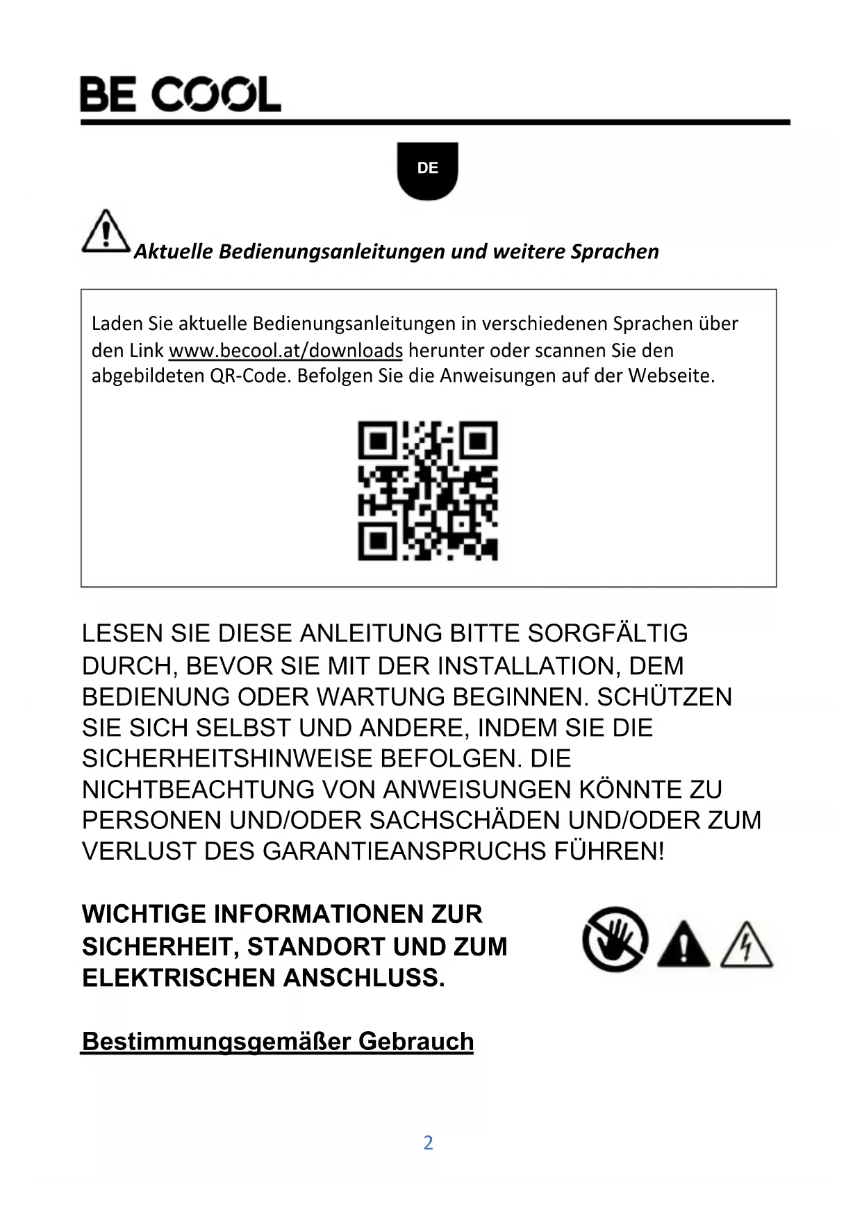 Laden Sie aktuelle Bedienungsanleitungen in verschiedene Sprachen über den Link www.becool.at/downloads herunter oder scannen Sie den abgebildeten QR-Code. Befolgen Sie die Anweisungen auf der Website.