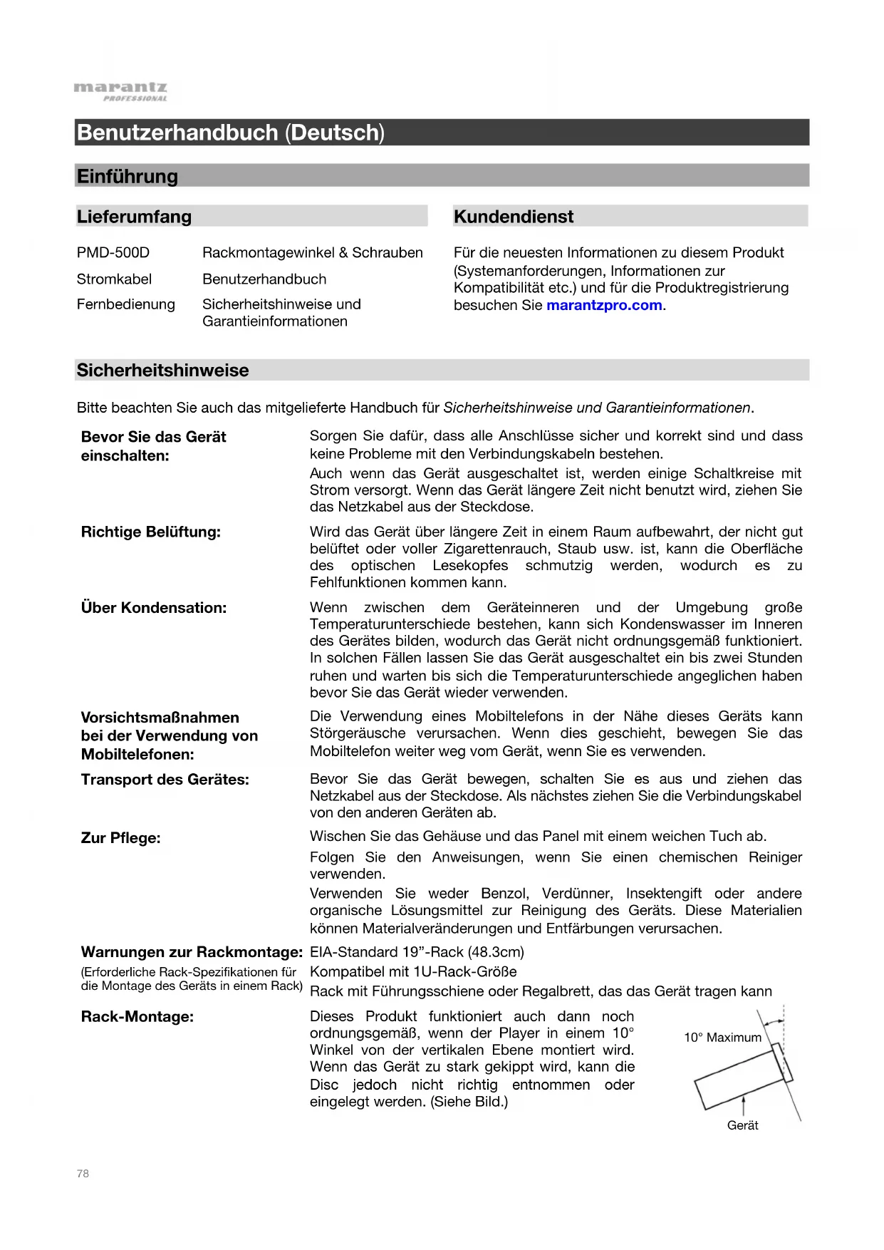 erwenden Sie weder Benzol, Verdünner, Insektengift oder andere organische Lösungsmittel zur Reinigung des Geräts. Diese Materialien können Materialveränderungen und Entfärbungen verursachen. Warnungen zur Rackmontage: (Erforderliche Rack-Spezifikationen für die Montage des Geräts in einem Rack) EIA-Standard 19”-Rack (48.3cm) Kompatibel mit 1U-Rack-Größe Rack mit Führungsschiene oder Regalbrett, das das Gerät tragen kann Rack-Montage: Dieses Produkt funktioniert auch dann noch ordnungsgemäß, wenn der Player in einem 10° Winkel von der vertikalen Ebene montiert wird. Wenn das Gerät zu stark gekippt wird, kann die Disc jedoch nicht richtig entnommen oder eingelegt werden. (Siehe Bild.) Gerät10° Maximum79