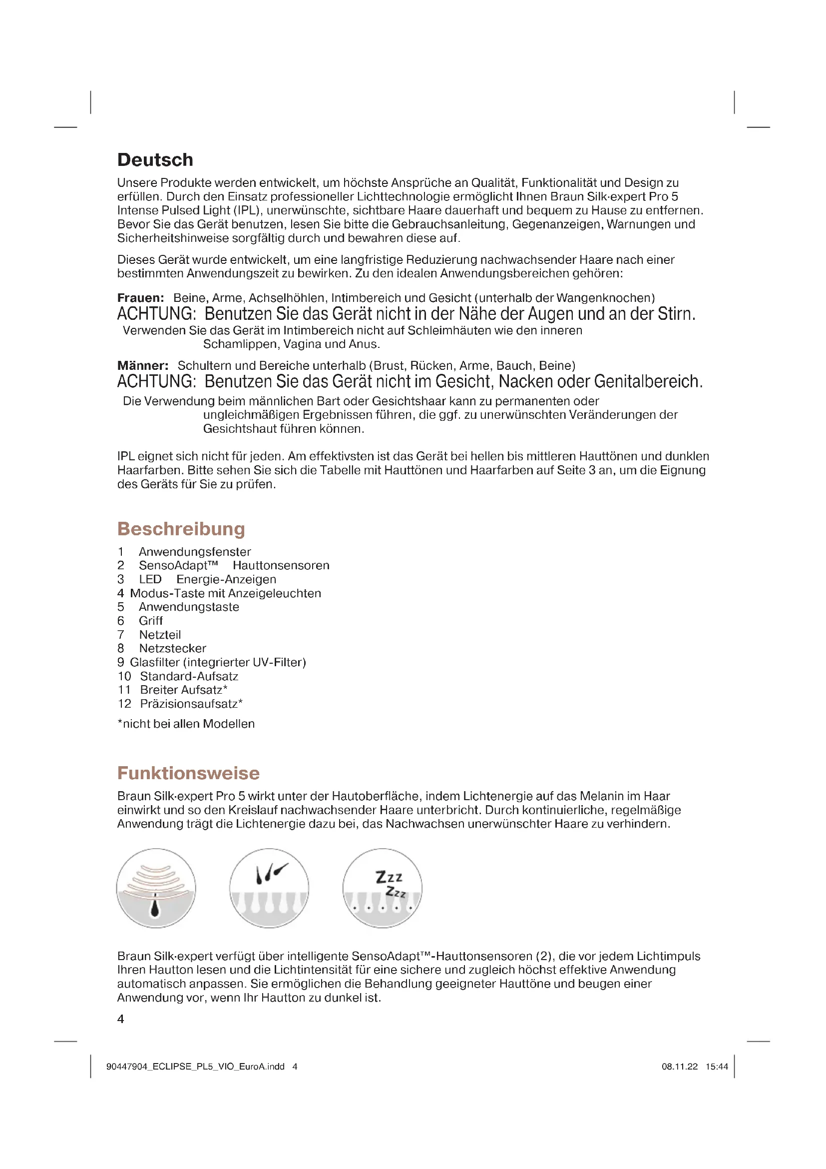 geeignet / suitable / approprié / apto / adequado / adatto / geschikt / egnet / passende / lämplig / sopii nicht geeignet / not suitable / non approprié / uso no apto / não adequado / non adatto / niet geschikt / ikke egnet / ikke passende / inte lämplig / ei sovi käyttöön 90447904_ECLIPSE_PL5_VIO_EuroA.indd 390447904_ECLIPSE_PL5_VIO_EuroA.indd 3 08.11.22 15:4408.11.22 15:444 Deutsch Unsere Produkte werden entwickelt, um höchste Ansprüche an Qualität, Funktionalität und Design zu erfüllen. Durch den Einsatz professioneller Lichttechnologie ermöglicht Ihnen Braun Silk·expert Pro 5 Intense Pulsed Light (IPL), unerwünschte, sichtbare Haare dauerhaft und bequem zu Hause zu entfernen. Bevor Sie das Gerät benutzen, lesen Sie bitte die Gebrauchsanleitung, Gegenanzeigen, Warnungen und Sicherheitshinweise sorgfältig durch und bewahren diese auf. Dieses Gerät wurde entwickelt, um eine langfristige Reduzierung nachwachsender Haare nach einer bestimmten Anwendungszeit zu bewirken. Zu den idealen Anwendungsbereichen gehören: Frauen: Beine, Arme, Achselhöhlen, Intimbereich und Gesicht (unterhalb der Wangenknochen) ACHTUNG: Benutzen Sie das Gerät nicht in der Nähe der Augen und an der Stirn. Verwenden Sie das Gerät im Intimbereich nicht auf Schleimhäuten wie den inneren Schamlippen, Vagina und Anus. Männer: Schultern und Bereiche unterhalb (Brust, Rücken, Arme, Bauch, Beine) ACHTUNG: Benutzen Sie das Gerät nicht im Gesicht, Nacken oder Genitalbereich. Die Verwendung beim männlichen Bart oder Gesichtshaar kann zu permanenten oder ungleichmäßigen Ergebnissen führen, die ggf. zu unerwünschten Veränderungen der Gesichtshaut führen können. IPL eignet sich nicht für jeden. Am effektivsten ist das Gerät bei hellen bis mittleren Hauttönen und dunklen Haarfarben. Bitte sehen Sie sich die Tabelle mit Hauttönen und Haarfarben auf Seite 3 an, um die Eignung des Geräts für Sie zu prüfen. Beschreibung 1 Anwendungsfenster 2 SensoAdapt™ Hauttonsensoren 3 LED Energie-Anzeigen 4 Modus-Taste mit Anzeigeleuchten 5 Anwendungstaste 6 Griff 7 Netzteil 8 Netzstecker 9 Glasfilter (integrierter UV-Filter) 10 Standard-Aufsatz 11 Breiter Aufsatz* 12 Präzisionsaufsatz* *nicht bei allen Modellen Funktionsweise Braun Silk·expert Pro 5 wirkt unter der Hautoberfläche, indem Lichtenergie auf das Melanin im Haar einwirkt und so den Kreislauf nachwachsender Haare unterbricht. Durch kontinuierliche, regelmäßige Anwendung trägt die Lichtenergie dazu bei, das Nachwachsen unerwünschter Haare zu verhindern. Braun Silk·expert verfügt über intelligente SensoAdapt™-Hauttonsensoren (2), die vor jedem Lichtimpuls Ihren Hautton lesen und die Lichtintensität für eine sichere und zugleich höchst effektive Anwendung automatisch anpassen. Sie ermöglichen die Behandlung geeigneter Hauttöne und beugen einer Anwendung vor, wenn Ihr Hautton zu dunkel ist. 90447904_ECLIPSE_PL5_VIO_EuroA.indd 490447904_ECLIPSE_PL5_VIO_EuroA.indd 4 08.11.22 15:4408.11.22 15:445 Gegenanzeigen Benutzen Sie das Gerät nicht, …