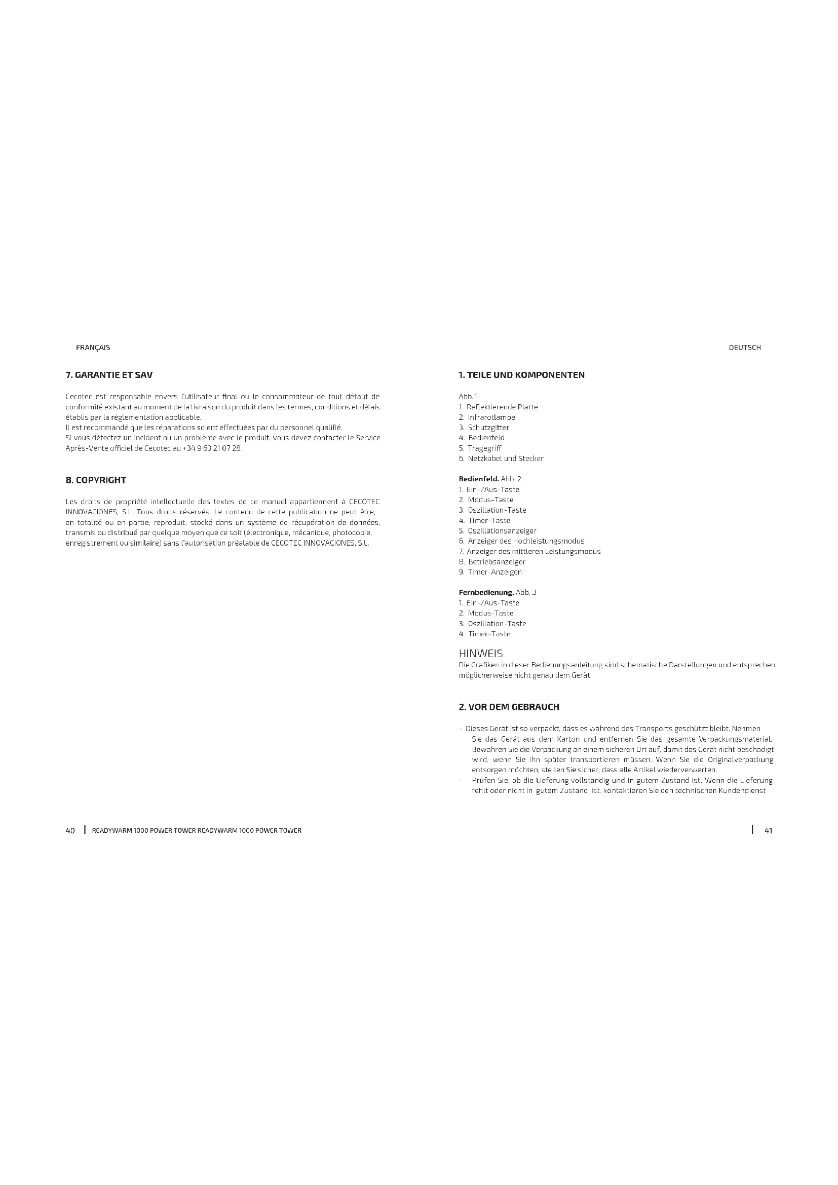 BEDIENUNGSANLEITUNG ReadyWarm 1000 Power Tower CECOTEC