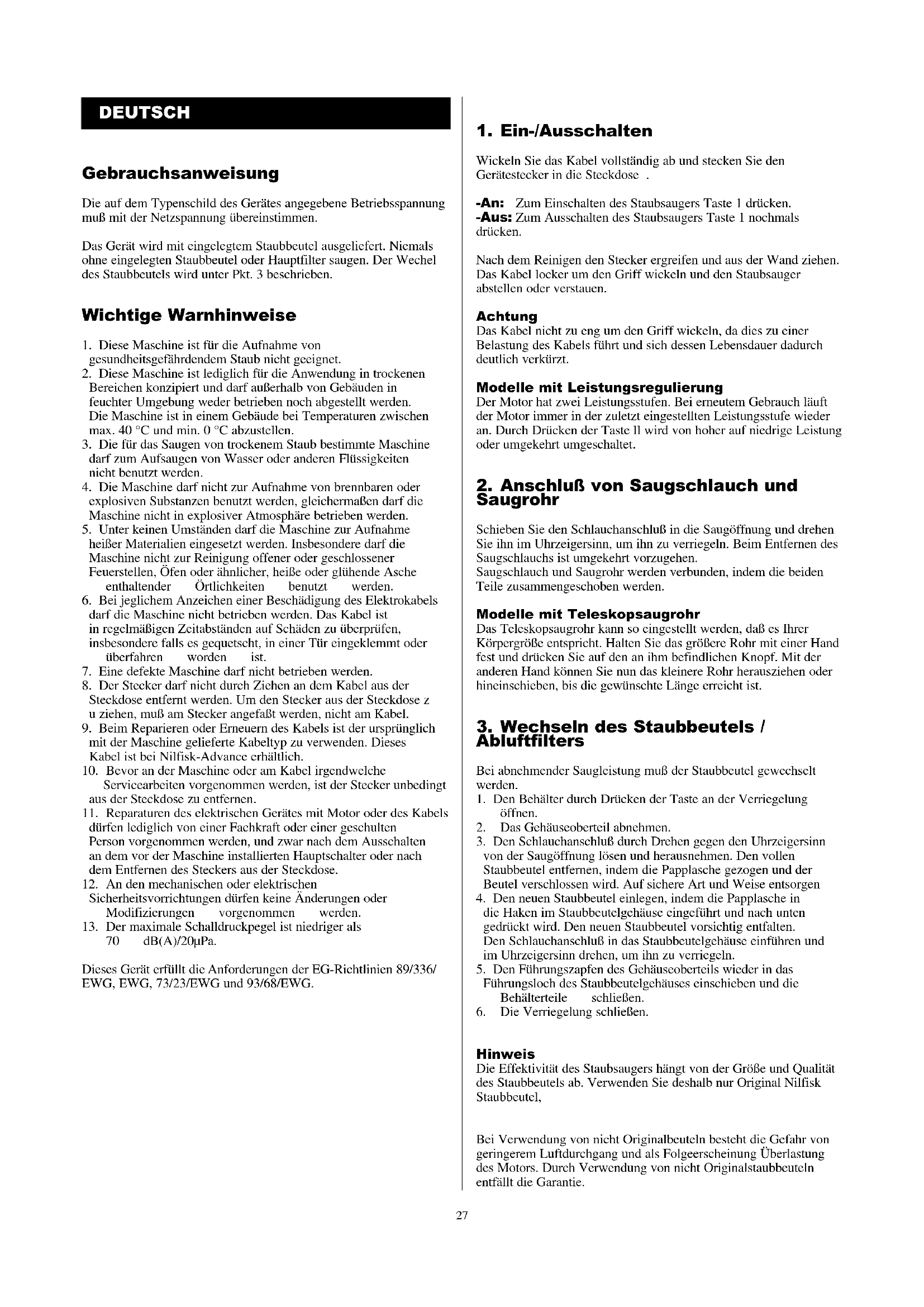 - Falls der Staubsauger stoppt – infolge einer Verstopfung des Schlauches, der Rohre oder des Mundstückes hat die Thermosicherung den Motor ausgeschaltet. Die Ursache des Verstopfens wird entfernt. Wartung Der Staubsauger muß trocken aufbewahrt werden. Er ist nahezu wartungsfrei. Nur die Staubfilter müssen - abhängig von der Einsatzdauer - gelegenlich erneuert werden. Die Oberfläche des Staubsaugers wird mit einem trockenen Tuch, evtl. mit einem sanften Kunststoffreiniger, gereinigt. Der Service wird von den Nilfisk Servicestellen durchgeführt oder dort, wo das Gerät gekauft wurde.29 Warnhinweise (Elektrosaugbürste 2832) Die auf dem Typenschild des Gerätes angegebene Betriebsspannung muß mit der Netzspannung übereinstimmen. Das Gerät darf nur zur Trockenreinigung und nicht im Freien benutzt werden. Das Gerät ist nicht geeignet zum Aufsaugen von explosiven, giftigen oder gesund- heitsgefährlichen Stäuben. Das Gerät darf nicht in explosionsfähiger Atmosphäre benutzt werden. Auf keinen Fall dürfen Flüssigkeiten, aggressive Gase, leicht entzündbare Medien oder glühende Partikel (Glimmnester o.ä.) auf - bzw. abgesaugt werden. Vermeiden Sie die Aufnahme harter spitzer Gegenstände, da diese das Gerät beschädigen könnten. Nach dem Feuchtreinigen von Teppichen darf erst nach vollständiger Trocknung mit dem Gerät gearbeitet werden, da sonst Schäden am Gerät auftreten können. Das Gerät darf nicht benutzt werden, falls der Zustand der Netzanschlußleitung nicht einwandfrei ist. Die Netzanschlußleitung ist regelmäßig auf Anzeichen einer Beschädigung oder Alterung zu untersuchen. Die Netzanschlußleitung darf nur von einer ausgebildeten Person ausgetauscht werden. Elektrische Kabel oder Stecker nicht mit nassen Händen berühren. Den Stecker nicht am Kabel aus der Steckdose ziehen, sondern am Stecker anfassen. Nach dem Gebrauch und vor dem Reinigen oder vor Wartungsarbeiten ist der Stecker aus der Steckdose zu ziehen. Nicht über die Zuleitung des Staubsaugers fahren. Niemals die rotierende Bürste mit dem Fingern berühren. Es dürfen keine Veränderungen an den mechanischen, elektrischen oder thermischen Sicherheitseinrichtungen vorgenommen werden. Der maximale Schalldruckpegel liegt unter 70dB(A)/20µPa. Dieses Gerät entspricht den folgenden EG-Richtlinien: 73/23/EWG (einschließlich des Zusatzes 93/68/EWG), Niederspannungsrichtlinie - 89/336/EWG (einschließlich des Zusatzes 92/31/EWG und 93/68/ EWG), EMV Richtlinie. Gebrauchsanweisung Kabel in die Klammern drücken und am Saugschlauch und -rohr anclipsen, dabei die Zuleitung unter dem Handgriff durchführen. Stecker in die Gerätesteckdose stecken. Das Einschalten erfolgt durch Inbetriebnahme des Staubsaugers. Größere Teile wie Stoffreste, Papier usw. vom Boden entfernen, um ein Blockieren der Walze zu vermeiden. Die Elektrosaugbürste ist für fast alle Teppiche und glatte Böden geeignet. Fransen und hochflorige Teppiche, deren Flor länger als 1 bis 1,5 cm ist, sollten nicht mit der Elektrosaugbürste gereinigt werden. Das Dreh-Kippgelenk der Düse ermöglicht leichtes Lenken der Düse in jede Richtung. Wenn die Elektrosaugbürste sich abschaltet: Bei Überlastung des Motors, z.B. durch Blockieren der Bürstenwalze mit aufgesaugten sperrigen Fremdkörpern oder durch umwickelte Teppichfransen, schaltet der Überhitzungsschutz den Motor ab. Gerät dann abschalten, Netzstecker ziehen, den Motor abkühlen lassen und wenn nötig wie unter “Reinigung und Pflege” beschrieben, die Bürstenwalze reinigen. Nach ca. 2 Minuten kann die Elektrosaugbürste wieder eingeschaltet werden. Reinigung und Pflege Gerät ausschalten, Netzstecker ziehen Elektrosaugbürste beim Reinigen nie in Wasser oder andere Flüssigkeiten tauchen. Reinigung der Walze: Haare und Fäden, die sich auf der Walze aufgewickelt haben, einfach mit einer Schere durchschneiden und entfernen (Bild 2). Bürstenwalze ausbauen: Mit Schraubendreher die Rasthaken lösen (Bild 3). Haube nach vorne abheben. Elektrosaugbürste umdrehen und den Gehäusedeckel abnehmen (Bild 5). Bürstenwalze ausbauen. Walzenlager abziehen und säubern. Bei der Montage der Bürstenwalze darauf achten, daß die Verzahnung des Zahnriemens mit den Ritzeln übereinstimmt. Haube auf das Gerät aufsetzen und durch gleichmäßigen Druck von oben einrasten lassen. Reinigen der Rollen: Wenn die Rolle des Gerätes schwergängig werden: Entfernen Sie bitte Haare oder Fäden, die sich um die Achsen der Rollen aufgewickelt haben. Die Rollen lassen sich zum Reinigen entfernen. Die Rollen können einfach mit einem stabilen Gegenstand (Schraubendreher) herausgehebelt werden (Pfeilrichtung beachten). Schraubendreher wie abgebildet (Bild 4) in der Einführschräge ansetzen und Rolle heraushebeln. Haare und Fäden entfernen. Rolle wieder einsetzen. Auf beidseitiges Einrasten der Achsen ist zu achten! Vorsicht: Halten Sie beim Heraushebeln eine Handfläche über die Rolle, damit diese nicht davonspringt. Hinweise Wenn die Düse sich schwer schieben läßt: Verringern der Leistung des Gerätes, die Reinigungswirkung wird in diesem Fall nicht verschlechtert. Abnehmen Stecker ziehen, Kabelklammern abnehmen und Elektrosaugbürste durch Zug und Drehung entfernen. Spezifikationen Modell 2832 Leistungsaufnahme Motor (W) 30 Schutzklasse (Feuchtigkeit, Staub) IP40 Schutzklasse (elektrisch) Bürstendrehzahl (U/min) 3350 (Hartboden) Technische Änderungen vorbehalten.30 Mode d’emploi Avant de mettre l’aspirateur en service, il faut s’assurer que la tension indiquée sur la plaque du moteur correspond à celle du réseau. L’aspirateur est fourni d’origine avec un sac à poussière monté. Ne jamais utiliser l’aspirateur sans sac et sans filtre principal correctement placés. La procédure de remplace-ment du sac est reprise sous 3. REMARQUES IMPORTANTES