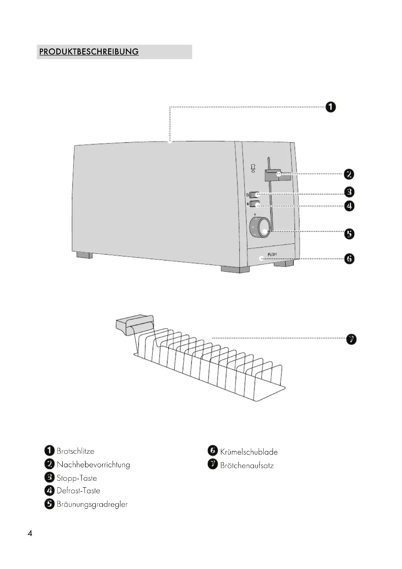 These Bedienungsanleitung ist Bestandteil des Toasters (nachfolgend als Gerät bezeichnet) und gibt Ihnen wichtige Hinweise für die Inbetriebnahme, die Sicherheit, den bestimmungsgemäßen Gebrauch und die Pflege des Geräts.