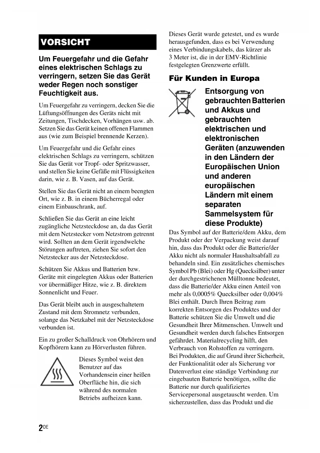 Um Feuergefahr und die Gefahr eines elektrischen Schlags zu verringern, setzen Sie das Gerät weder Regen noch sonstiger Feuchtigkeit aus. Um Feuergefahr zu verringern, decken Sie die Lüftungsöffnungen des Geräts nicht mit Zeitungen, Tischdecken, Vorhängen usw. ab. Setzen Sie das Gerät keinen offenen Flammen aus (wie zum Beispiel brennende Kerzen). Um Feuergefahr und die Gefahr eines elektrischen Schlags zu verringern, schützen Sie das Gerät vor Tropf- oder Spritzwasser, und stellen Sie keine Gefäße mit Flüssigkeiten darin, wie z. B. Vasen, auf das Gerät. Stellen Sie das Gerät nicht an einem beengten Ort, wie z. B. in einem Bücherregal oder einem Einbauschrank, auf. Schließen Sie das Gerät an eine leicht zugängliche Netzsteckdose an, da das Gerät mit dem Netzstecker vom Netzstrom getrennt wird. Sollten an dem Gerät irgendwelche Störungen auftreten, ziehen Sie sofort den Netzstecker aus der Netzsteckdose. Schützen Sie Akkus und Batterien bzw. Geräte mit eingelegten Akkus oder Batterien vor übermäßiger Hitze, wie z. B. direktem Sonnenlicht und Feuer. Das Gerät bleibt auch in ausgeschaltetem Zustand mit dem Stromnetz verbunden, solange das Netzkabel mit der Netzsteckdose verbunden ist. Ein zu großer Schalldruck von Ohrhörern und Kopfhörern kann zu Hörverlusten führen. Dieses Symbol weist den Benutzer auf das Vorhandensein einer heißen Oberfläche hin, die sich während des normalen Betriebs aufheizen kann. Dieses Gerät wurde getestet, und es wurde herausgefunden, dass es bei Verwendung eines Verbindungskabels, das kürzer als 3 Meter ist, die in der EMV-Richtlinie festgelegten Grenzwerte erfüllt. Für Kunden in Europa Entsorgung von gebrauchten Batterien und Akkus und gebrauchten elektrischen und elektronischen Geräten (anzuwenden in den Ländern der Europäischen Union und anderen europäischen Ländern mit einem separaten Sammelsystem für diese Produkte) Das Symbol auf der Batterie/dem Akku, dem Produkt oder der Verpackung weist darauf hin, dass das Produkt oder die Batterie/der Akku nicht als normaler Haushaltsabfall zu behandeln sind. Ein zusätzliches chemisches Symbol Pb (Blei) oder Hg (Quecksilber) unter der durchgestrichenen Mülltonne bedeutet, dass die Batterie/der Akku einen Anteil von mehr als 0,0005% Quecksilber oder 0,004% Blei enthält. Durch Ihren Beitrag zum korrekten Entsorgen des Produktes und der Batterie schützen Sie die Umwelt und die Gesundheit Ihrer Mitmenschen. Umwelt und Gesundheit werden durch falsches Entsorgen gefährdet. Materialrecycling hilft, den Verbrauch von Rohstoffen zu verringern. Bei Produkten, die auf Grund ihrer Sicherheit, der Funktionalität oder als Sicherung vor Datenverlust eine ständige Verbindung zur eingebauten Batterie benötigen, sollte die Batterie nur durch qualifiziertes Servicepersonal ausgetauscht werden. Um sicherzustellen, dass das Produkt und die VORSICHT3