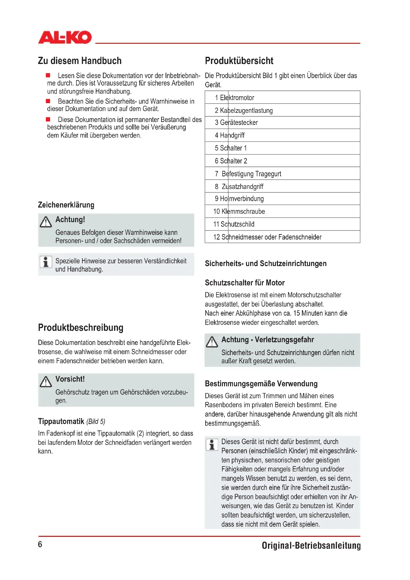 Original-Betriebsanleitung Zu diesem Handbuch Lesen Sie diese Dokumentation vor der Inbetriebnah- me durch. Dies ist Voraussetzung für sicheres Arbeiten und störungsfreie Handhabung. Beachten Sie die Sicherheits- und Warnhinweise in dieser Dokumentation und auf dem Gerät. Diese Dokumentation ist permanenter Bestandteil des beschriebenen Produkts und sollte bei Veräußerung dem Käufer mit übergeben werden. Zeichenerklärung Achtung! Genaues Befolgen dieser Warnhinweise kann Personen- und / oder Sachschäden vermeiden! Spezielle Hinweise zur besseren Verständlichkeit und Handhabung. Produktbeschreibung Diese Dokumentation beschreibt eine handgeführte Elek- trosense, die wahlweise mit einem Schneidmesser oder einem Fadenschneider betrieben werden kann. Vorsicht! Gehörschutz tragen um Gehörschäden vorzubeu- gen. Tippautomatik (Bild 5) Im Fadenkopf ist eine Tippautomatik (2) integriert, so dass bei laufendem Motor der Schneidfaden verlängert werden kann. Produktübersicht Die Produktübersicht Bild 1 gibt einen Überblick über das Gerät. 1 Elektromotor 2 Kabelzugentlastung 3 Gerätestecker 4 Handgriff 5 Schalter 1 6 Schalter 2 7 Befestigung Tragegurt 8 Zusatzhandgriff 9 Holmverbindung 10 Klemmschraube 11 Schutzschild 12 Schneidmesser oder Fadenschneider Sicherheits- und Schutzeinrichtungen Schutzschalter für Motor Die Elektrosense ist mit einem Motorschutzschalter ausgestattet, der bei Überlastung abschaltet. Nach einer Abkühlphase von ca. 15 Minuten kann die Elektrosense wieder eingeschaltet werden. Achtung - Verletzungsgefahr Sicherheits- und Schutzeinrichtungen dürfen nicht außer Kraft gesetzt werden. Bestimmungsgemäße Verwendung Dieses Gerät ist zum Trimmen und Mähen eines Rasenbodens im privaten Bereich bestimmt. Eine andere, darüber hinausgehende Anwendung gilt als nicht bestimmungsgemäß. Dieses Gerät ist nicht dafür bestimmt, durch Personen (einschließlich Kinder) mit eingeschränk- ten physischen, sensorischen oder geistigen Fähigkeiten oder mangels Erfahrung und/oder mangels Wissen benutzt zu werden, es sei denn, sie werden durch eine für ihre Sicherheit zustän- dige Person beaufsichtigt oder erhielten von ihr An- weisungen, wie das Gerät zu benutzen ist. Kinder sollten beaufsichtigt werden, um sicherzustellen, dass sie nicht mit dem Gerät spielen.7