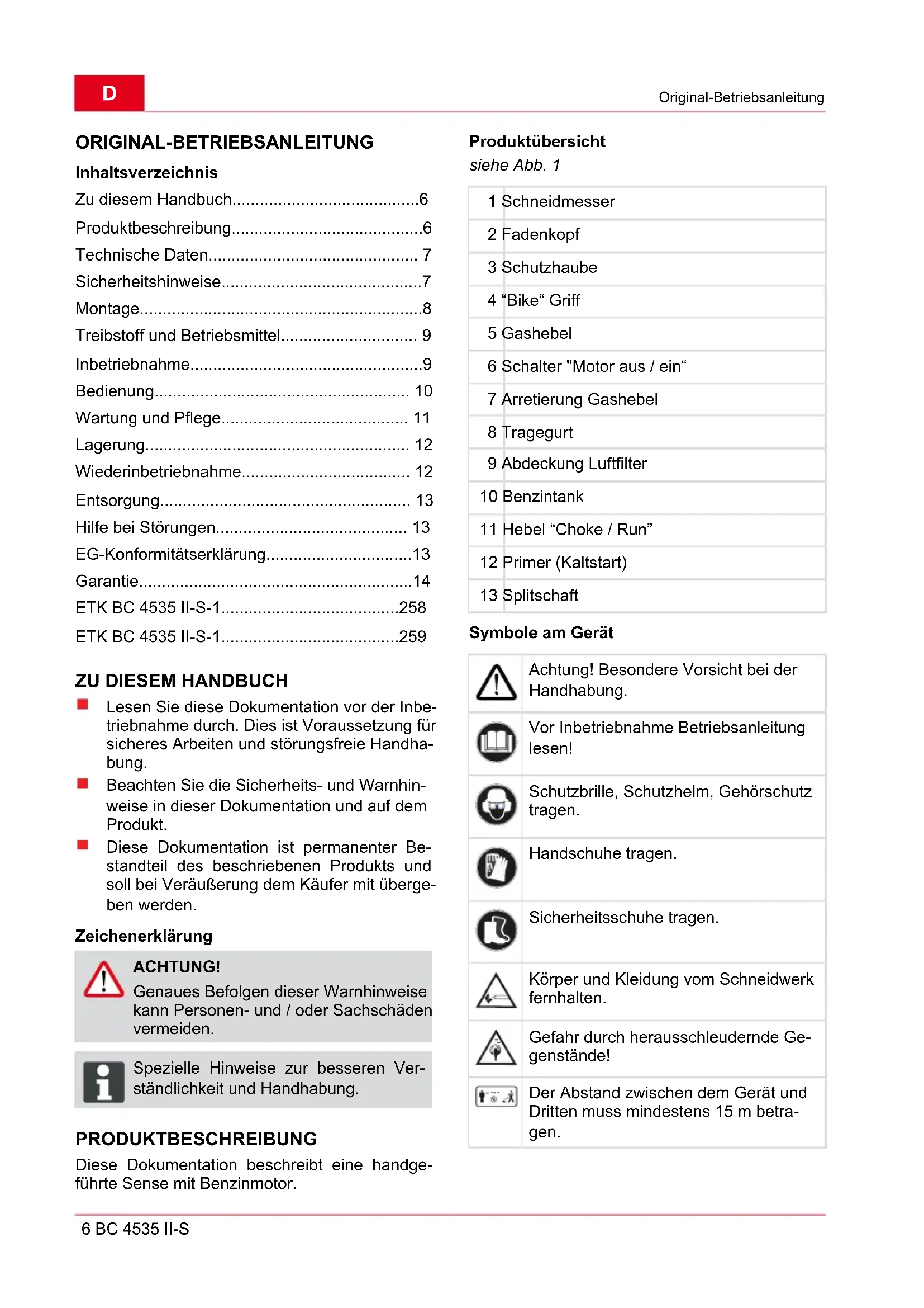 Lesen Sie diese Dokumentation vor der Inbe- triebnahme durch. Dies ist Voraussetzung für sicheres Arbeiten und störungsfreie Handha- bung. Beachten Sie die Sicherheits- und Warnhin- weise in dieser Dokumentation und auf dem Produkt. Diese Dokumentation ist permanenter Be- standteil des beschriebenen Produkts und soll bei Veräußerung dem Käufer mit überge- ben werden. Zeichenerklärung ACHTUNG! Genaues Befolgen dieser Warnhinweise kann Personen- und / oder Sachschäden vermeiden. HINWEIS Spezielle Hinweise zur besseren Ver- ständlichkeit und Handhabung. PRODUKTBESCHREIBUNG Diese Dokumentation beschreibt eine handge- führte Sense mit Benzinmotor. Produktübersicht siehe Abb. 1 1 Schneidmesser 2 Fadenkopf 3 Schutzhaube 4 “Bike“ Griff 5 Gashebel 6 Schalter "Motor aus / ein“ 7 Arretierung Gashebel 8 Tragegurt 9 Abdeckung Luftfilter 10 Benzintank 11 Hebel “Choke / Run” 12 Primer (Kaltstart) 13 Splitschaft Symbole am Gerät Achtung! Besondere Vorsicht bei der Handhabung. Vor Inbetriebnahme Betriebsanleitung lesen! Schutzbrille, Schutzhelm, Gehörschutz tragen. Handschuhe tragen. Sicherheitsschuhe tragen. Körper und Kleidung vom Schneidwerk fernhalten. Gefahr durch herausschleudernde Ge- genstände! 15m(50ft) Der Abstand zwischen dem Gerät und Dritten muss mindestens 15 m betra- gen.Produktbeschreibung 440 247_a 7 Sicherheits- und Schutzeinrichtungen Nothalt Im Notfall Zündschalter auf „STOP“ schalten. Steinschlag-Schutzschild Schützt den Benutzer vor weggeschleuderten Gegenständen. Das integrierte Messer kürzt den Schneidfaden auf die zulässige Länge. ACHTUNG! Verletzungsgefahr! Sicherheits- und Schutzeinrichtungen dürfen nicht außer Kraft gesetzt werden. Splitschaft Über den Splitschaft können Sie die Motorsense einfach zusammenbauen, nach dem Mähen aus- einandernehmen und platzsparend lagern. Bestimmungsgemäße Verwendung Dieses Gerät ist zum Trimmen und Mähen eines Rasenbodens im privaten Bereich bestimmt. Eine andere, darüber hinausgehende Anwendung gilt als nicht bestimmungsgemäß. Möglicher Fehlgebrauch ACHTUNG! Das Gerät darf nicht im gewerblichen Einsatz betrieben werden. TECHNISCHE DATEN BC 4535 II Motortyp 2-Takt, luftgekühlt Hubraum 42,7 cm³ Leistung 1,1 kW Trockengewicht 7,6 kg Betriebsgewicht ohne Benzin 9,0 kg Treibstoffmenge 1,1 l Zündung elektronisch Zündkerze L8RTC Antrieb Fliehkraftkupplung Griff „Bike“-Griff Schallleistungspegel 113 dB ± LpA 3 bdB Schalldruckpegel 102 dB Vibration ≤ 15 m/s