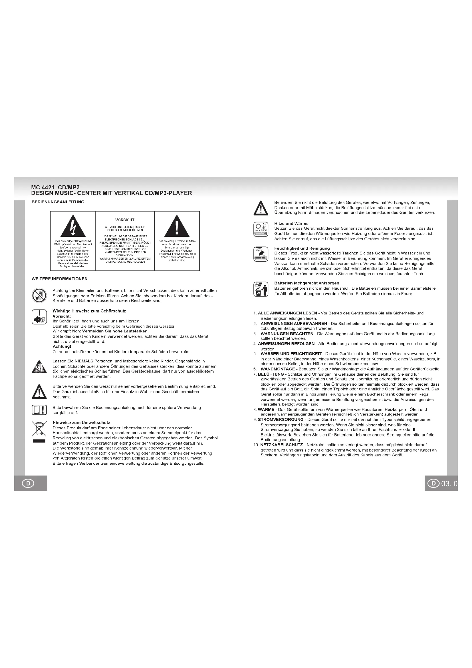 Hiermit erklärt die Firma ETV Elektro-Technische Vertriebsgesellschaft mbH, dass sich das Gerät MC 4421 CD/MP3 in Übereinstimmung mit den grundlegenden Anforderungen, der europäischen Richtlinie für elektromagnetische Verträglichkeit (2004/108/EG) und der Niederspannungsrichtlinie (93/68/EG und 2006/95/EG) befindet.
