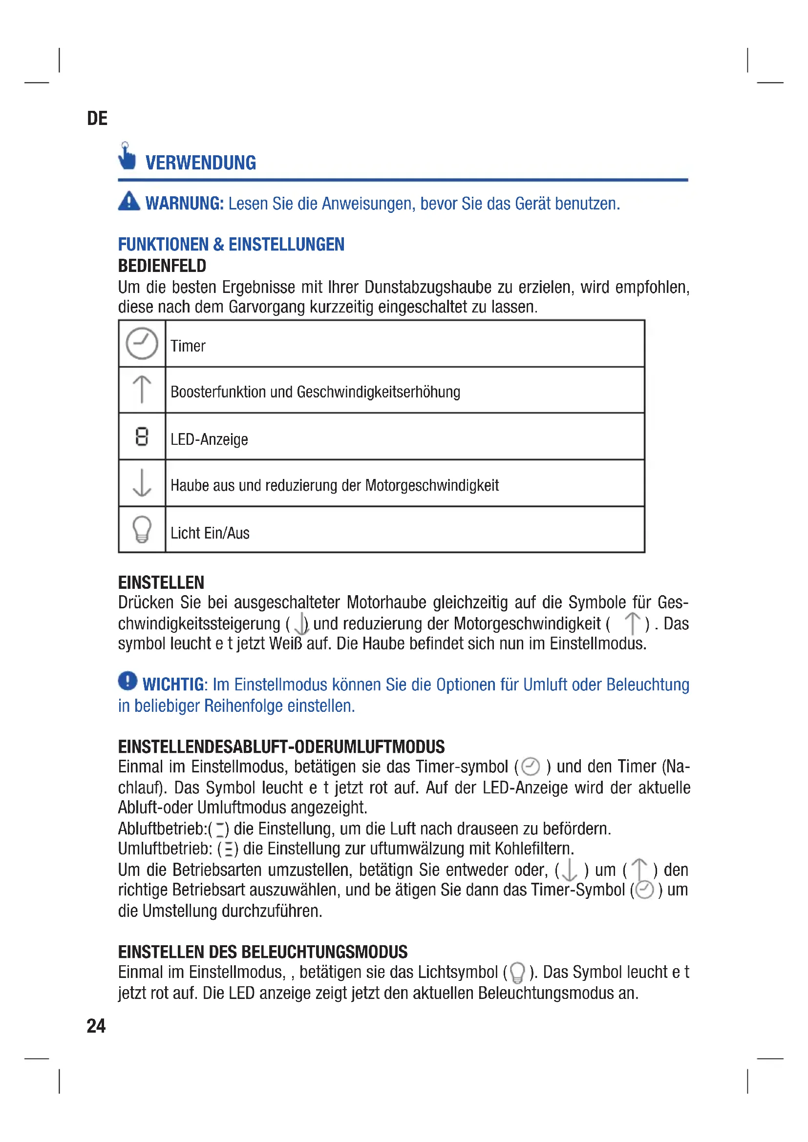 VERWENDUNG WARNUNG: Lesen Sie die Anweisungen, bevor Sie das Gerät benutzen. FUNKTIONEN & EINSTELLUNGEN BEDIENFELD Um die besten Ergebnisse mit Ihrer Dunstabzugshaube zu erzielen, wird empfohlen, diese nach dem Garvorgang kurzzeitig eingeschaltet zu lassen. Timer Boosterfunktion und Geschwindigkeitserhöhung LED-Anzeige Haube aus und reduzierung der Motorgeschwindigkeit Licht Ein/Aus EINSTELLEN Drücken Sie bei ausgeschalteter Motorhaube gleichzeitig auf die Symbole für Ges- chwindigkeitssteigerung ( ) und reduzierung der Motorgeschwindigkeit ( ) . Das symbol leucht e t jetzt Weiß auf. Die Haube befindet sich nun im Einstellmodus. WICHTIG: Im Einstellmodus können Sie die Optionen für Umluft oder Beleuchtung in beliebiger Reihenfolge einstellen. EINSTELLENDESABLUFT-ODERUMLUFTMODUS Einmal im Einstellmodus, betätigen sie das Timer-symbol ( ) und den Timer (Na- chlauf). Das Symbol leucht e t jetzt rot auf. Auf der LED-Anzeige wird der aktuelle Abluft-oder Umluftmodus angezeight. Abluftbetrieb:( ) die Einstellung, um die Luft nach drauseen zu befördern. Umluftbetrieb: ( ) die Einstellung zur uftumwälzung mit Kohlefiltern. Um die Betriebsarten umzustellen, betätign Sie entweder oder, ( ) um ( ) den richtige Betriebsart auszuwählen, und be ätigen Sie dann das Timer-Symbol ( ) um die Umstellung durchzuführen.