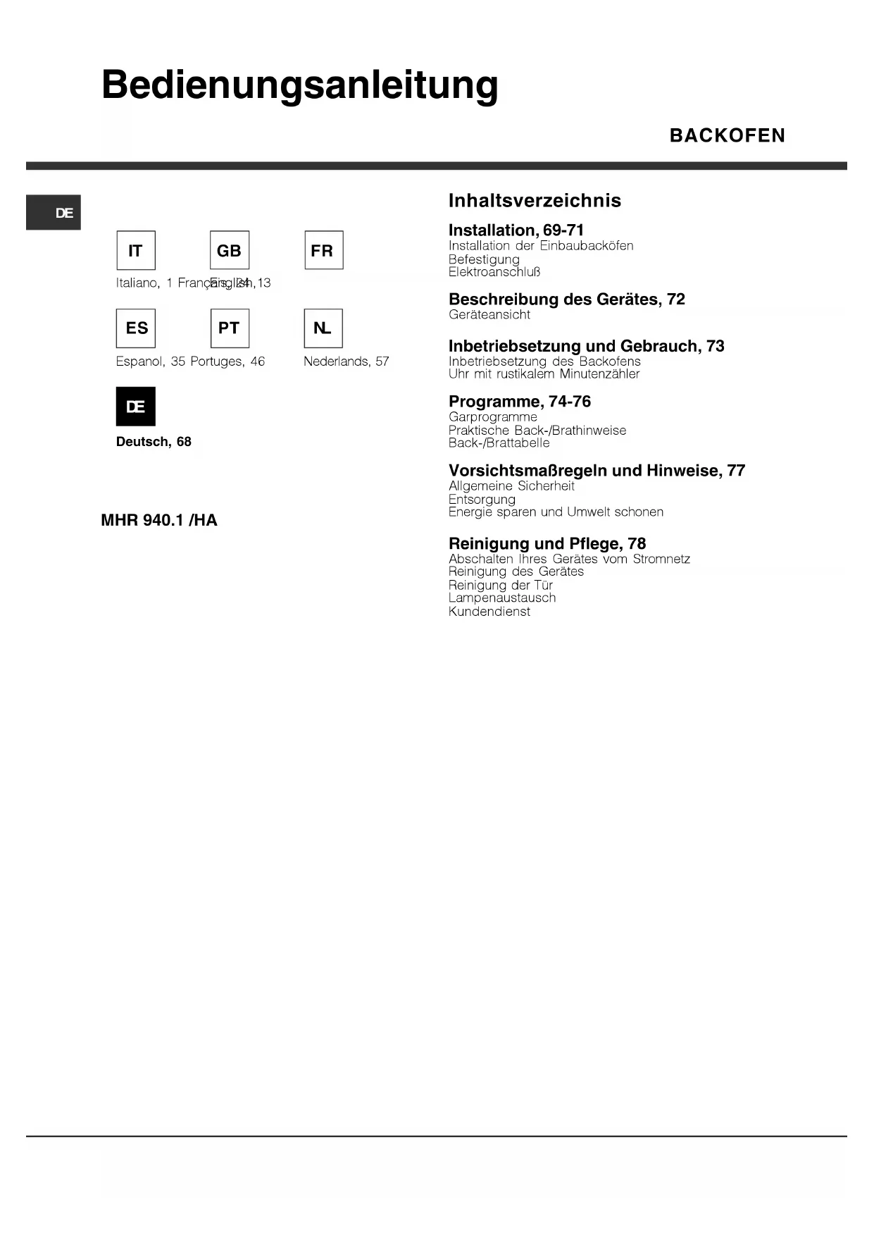 - Het serienummer (S/N) Deze laatste informatie bevindt zich op het typeplaatje op het apparaatDE Bedienungsanleitung MHR 940.1 /HA Inhaltsverzeichnis Installation, 69-71 Installation der Einbaubacköfen Befestigung Elektroanschluß Beschreibung des Gerätes, 72 Geräteansicht Inbetriebsetzung und Gebrauch, 73 Inbetriebsetzung des Backofens Uhr mit rustikalem Minutenzähler Programme, 74-76 Garprogramme Praktische Back-/Brathinweise Back-/Brattabelle Vorsichtsmaßregeln und Hinweise, 77 Allgemeine Sicherheit Entsorgung Energie sparen und Umwelt schonen Reinigung und Pflege, 78 Abschalten Ihres Gerätes vom Stromnetz Reinigung des Gerätes Reinigung der Tür Lampenaustausch Kundendienst BACKOFEN Deutsch, 68