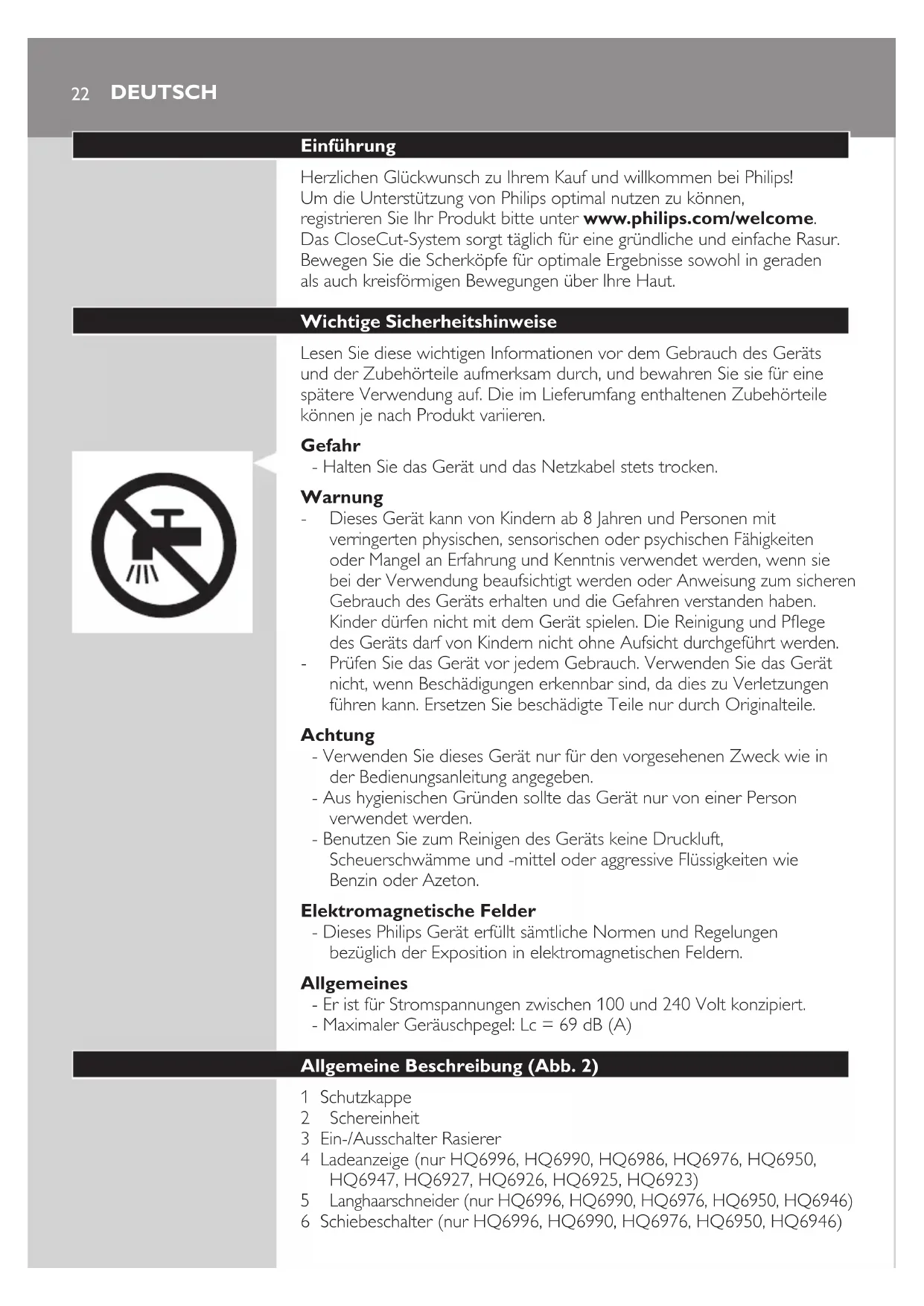 Prüfen Sie das Gerät vor jedem Gebrauch. Verwenden Sie das Gerät nicht, wenn Beschädigungen erkennbar sind, da dies zu Verletzungen führen kann. Ersetzen Sie beschädigte Teile nur durch Originalteile. Achtung - Verwenden Sie dieses Gerät nur für den vorgesehenen Zweck wie in der Bedienungsanleitung angegeben. - Aus hygienischen Gründen sollte das Gerät nur von einer Person verwendet werden. - Benutzen Sie zum Reinigen des Geräts keine Druckluft, Scheuerschwämme und -mittel oder aggressive Flüssigkeiten wie Benzin oder Azeton. Elektromagnetische Felder - Dieses Philips Gerät erfüllt sämtliche Normen und Regelungen bezüglich der Exposition in elektromagnetischen Feldern. Allgemeines - Er ist für Stromspannungen zwischen 100 und 240 Volt konzipiert. - Maximaler Geräuschpegel: Lc = 69 dB (A) Allgemeine Beschreibung (Abb. 2) 1 Schutzkappe 2 Schereinheit 3 Ein-/Ausschalter Rasierer 4 Ladeanzeige (nur HQ6996, HQ6990, HQ6986, HQ6976, HQ6950, HQ6947, HQ6927, HQ6926, HQ6925, HQ6923)