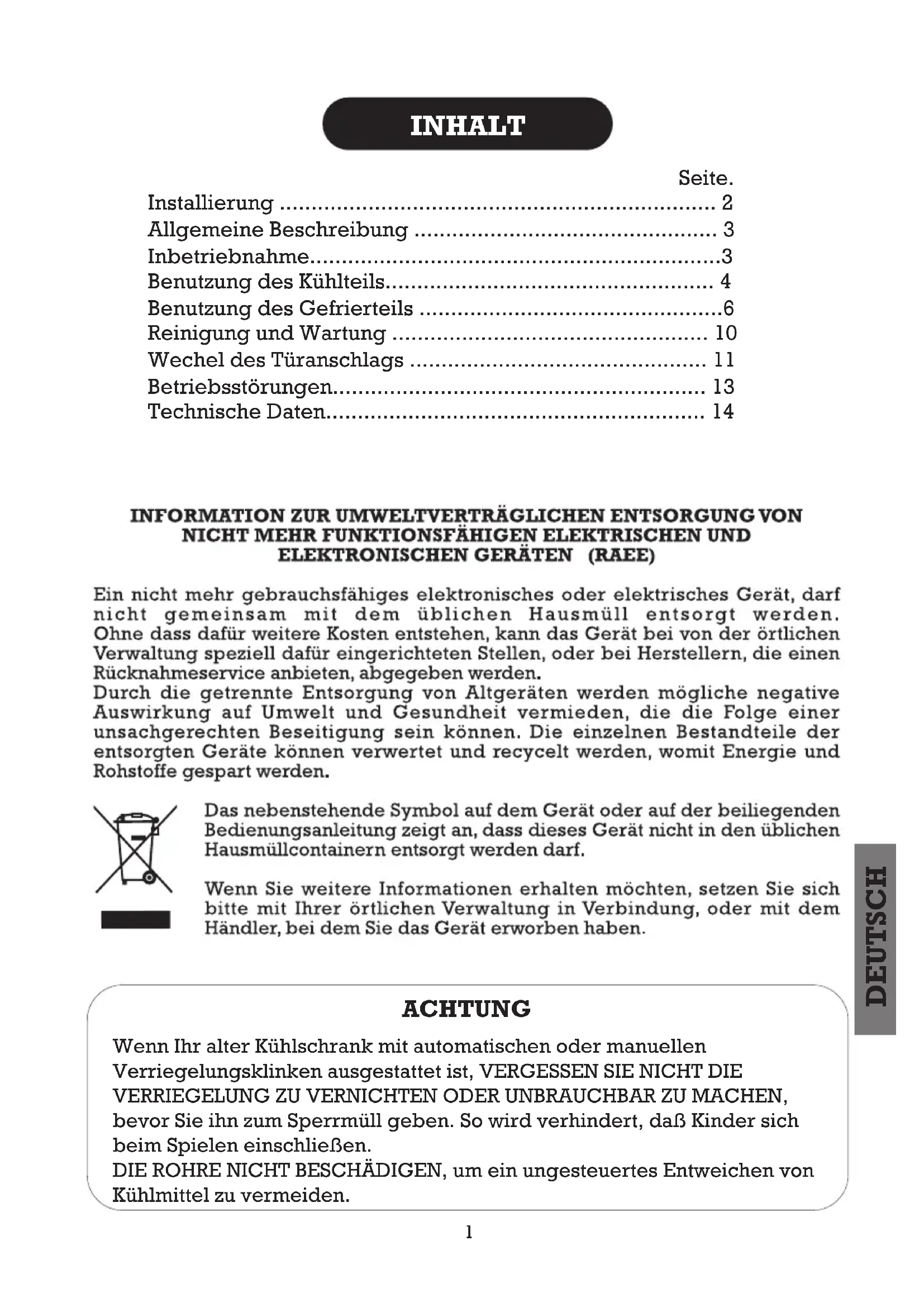 - To avoid damaging the environment and to contribute to recove- ring used materials, call your municipal collection service.1 DEUTSCH INHALT Wenn Ihr alter Kühlschrank mit automatischen oder manuellen Verriegelungsklinken ausgestattet ist, VERGESSEN SIE NICHT DIE VERRIEGELUNG ZU VERNICHTEN ODER UNBRAUCHBAR ZU MACHEN, bevor Sie ihn zum Sperrmüll geben. So wird verhindert, daß Kinder sich beim Spielen einschließen. DIE ROHRE NICHT BESCHÄDIGEN, um ein ungesteuertes Entweichen von Kühlmittel zu vermeiden. ACHTUNG Seite. Installierung ..................................................................... 2 Allgemeine Beschreibung ................................................ 3 Inbetriebnahme.................................................................3 Benutzung des Kühlteils.................................................... 4 Benutzung des Gefrierteils ................................................6 Reinigung und Wartung .................................................. 10 Wechel des Türanschlags ............................................... 11 Betriebsstörungen........................................................... 13 Technische Daten............................................................ 142 INSTALLIERUNG EMPFEHLUNGEN Einen Luftumlauf auf der Rückseite desKühlschranks ermöglichen. Weder dasVordergitter noch die Kühlschrankdecke mitGegenständen abdecken. Wenn ein Schranküber dem Gerät angebracht wird, muß zurBelüftung ein Freiraum gelassen werden. Möglichst die Nähe von Hitzequellen meiden. Wenn der Kühlschrank zum Auspacken oder zum Wechseln des Türanschlags hingelegt werden muß, NUR AUF DIE RÜCKSEITE LEGEN. ANMERKUNG: die Türschanrniere sind auf der rechten Seiteangebracht. Wenn diese Stelle unbequem für Sie ist, können dieScharniere auf der anderen Seite angebracht werden. Im AnhangSEITENWECHEL DER TÜRÖFFNUNG befinden sich dieAnleitungen dazu. Durch Einstellen der Nivellierfüße ist sicherzustellen, daß der Kühlschrank gut (ohne zu hinken) und eben (nicht seitlich geneigt) auf der Stellfläche steht. WICHTIG. Dieser Kühlschrank wird bei 220/240 V betrieben.Wenn die im Haus zur Verfügung stehende Spannungeine andere ist, muß eine Leinstungstransformator miteine Leistung von mind. 500 W verwendent werden.Verwenden Sie einen ERDANSCHLUSS.ANMERKUNG: Der Hersteller lehnt jede Haftung ab,wenn diese Empfehlungen nicht beachtet werden.