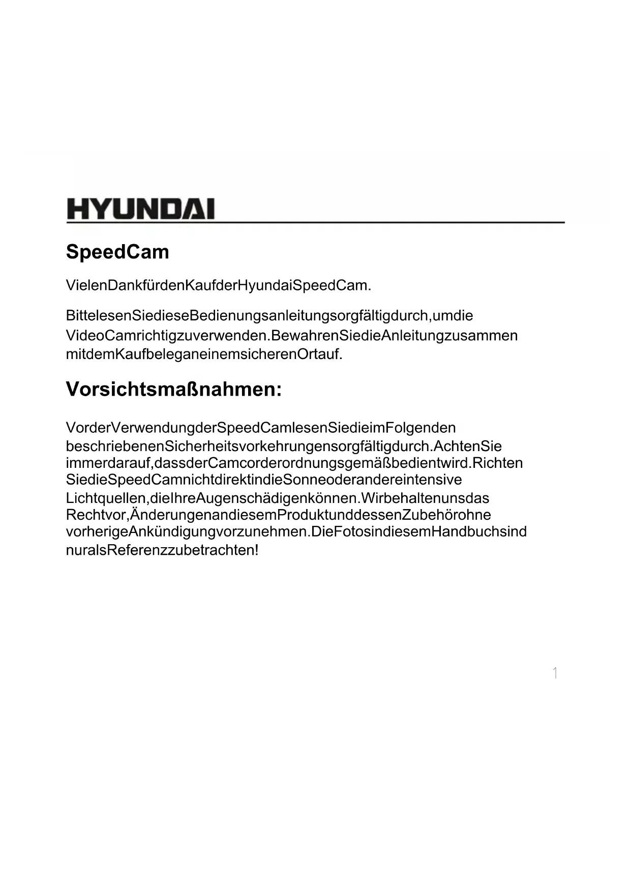 Speed Cam Vielen Dank für den Kauf der Hyundai Speed Cam. Bitte lesen Sie diese Bedienungsanleitung sorgfältig durch, um die VideoCam richtig zu verwenden. Bewahren Sie die Anleitung zusammen mit dem Kaufbeleg an einem sicheren Ort auf. Vorsichtsmaßnahmen: Vor der Verwendung der Speed Cam lesen Sie die im Folgenden beschriebenen Sicherheitsvorkehrungen sorgfältig durch. Achten Sie immer darauf, dass der Camcorder ordnungsgemäß bedient wird. Richten Sie die Speed Cam nicht direkt in die Sonne oder andere intensive Lichtquellen, die Ihre Augen schädigen können. Wir behalten uns das Recht vor, Änderungen an diesem Produkt und dessen Zubehör ohne vorherige Ankündigung vorzunehmen. Die Fotos in diesem Handbuch sind nur als Referenz zu betrachten!2 Inhalt: - Vorbereitung vor erster