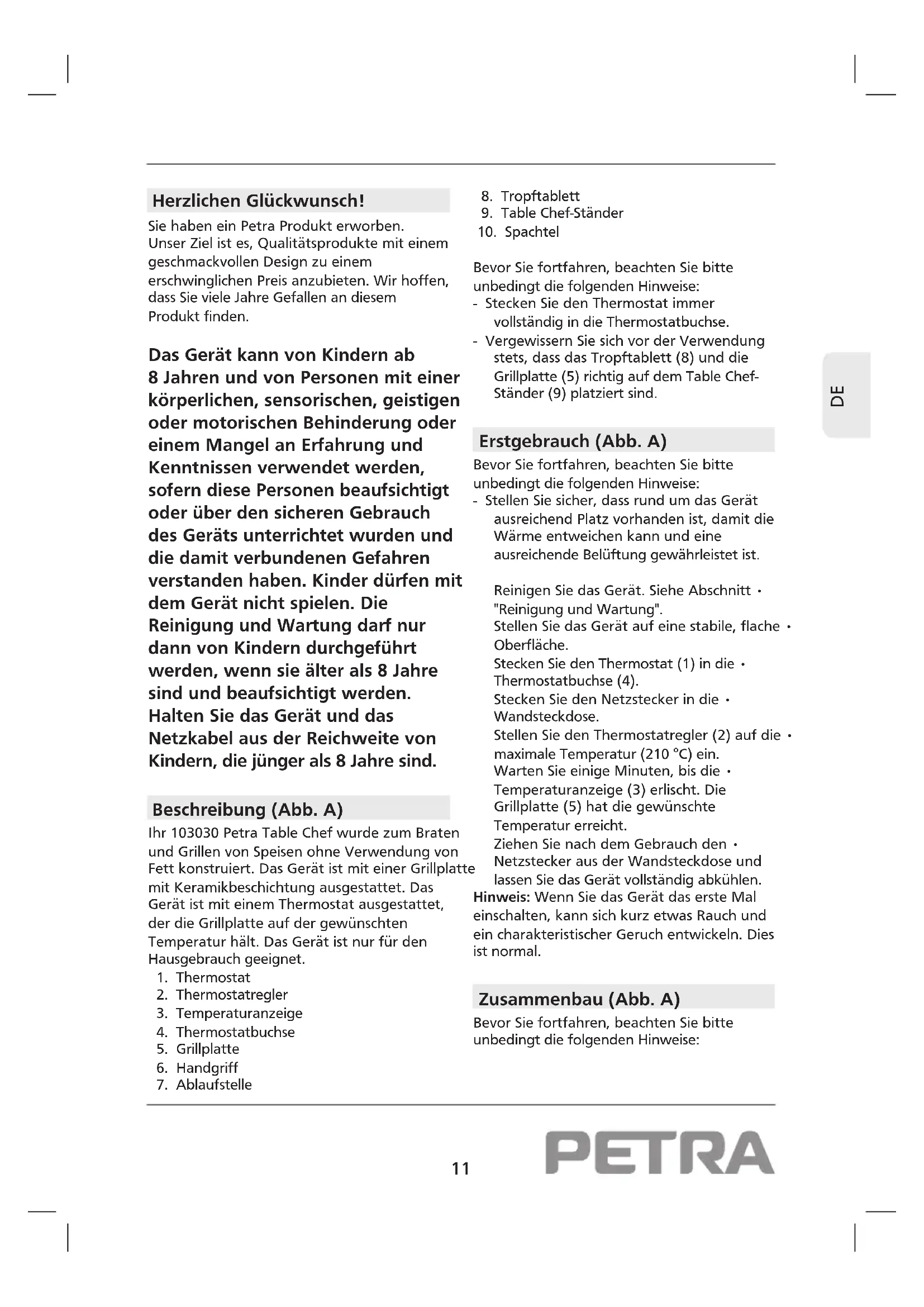 Herzlichen Glückwunsch! Sie haben ein Petra Produkt erworben. Unser Ziel ist es, Qualitätsprodukte mit einem geschmackvollen Design zu einem erschwinglichen Preis anzubieten. Wir hoffen, dass Sie viele Jahre Gefallen an diesem Produkt finden. Das Gerät kann von Kindern ab 8 Jahren und von Personen mit einer körperlichen, sensorischen, geistigen oder motorischen Behinderung oder einem Mangel an Erfahrung und Kenntnissen verwendet werden, sofern diese Personen beaufsichtigt oder über den sicheren Gebrauch des Geräts unterrichtet wurden und die damit verbundenen Gefahren verstanden haben. Kinder dürfen mit dem Gerät nicht spielen. Die Reinigung und Wartung darf nur dann von Kindern durchgeführt werden, wenn sie älter als 8 Jahre sind und beaufsichtigt werden. Halten Sie das Gerät und das Netzkabel aus der Reichweite von Kindern, die jünger als 8 Jahre sind. Beschreibung (Abb. A) Ihr 103030 Petra Table Chef wurde zum Braten und Grillen von Speisen ohne Verwendung von Fett konstruiert. Das Gerät ist mit einer Grillplatte mit Keramikbeschichtung ausgestattet. Das Gerät ist mit einem Thermostat ausgestattet, der die Grillplatte auf der gewünschten Temperatur hält. Das Gerät ist nur für den Hausgebrauch geeignet.