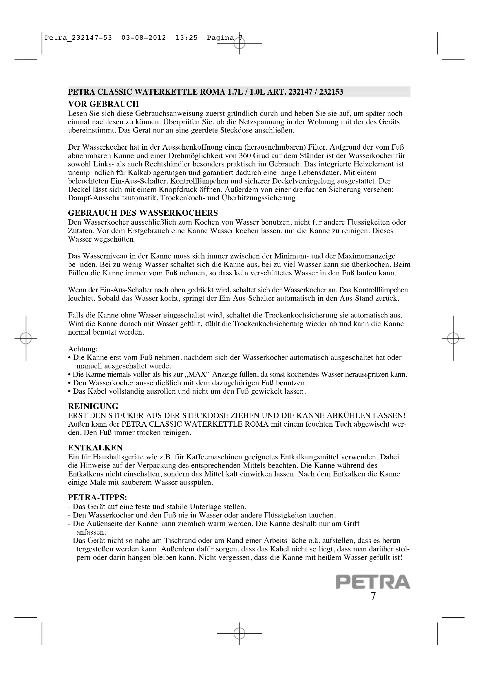 - Das Kabel vollständig ausrollen und nicht um den Fuß gewickelt lassen. REINIGUNG ERST DEN STECKER AUS DER STECKDOSE ZIEHEN UND DIE KANNE ABKÜHLEN LASSEN! Außen kann der PETRA CLASSIC WATERKETTLE ROMA mit einem feuchten Tuch abgewischt wer- den. Den Fuß immer trocken reinigen. ENTKALKEN Ein für Haushaltsgeräte wie z.B. für Kaffeemaschinen geeignetes Entkalkungsmittel verwenden. Dabei die Hinweise auf der Verpackung des entsprechenden Mittels beachten. Die Kanne während des Entkalkens nicht einschalten, sondern das Mittel kalt einwirken lassen. Nach dem Entkalken die Kanne einige Male mit sauberem Wasser ausspülen. PETRA-TIPPS: - Das Gerät auf eine feste und stabile Unterlage stellen. - Den Wasserkocher und den Fuß nie in Wasser oder andere Flüssigkeiten tauchen. - Die Außenseite der Kanne kann ziemlich warm werden. Die Kanne deshalb nur am Griff anfassen. - Das Gerät nicht so nahe am Tischrand oder am Rand einer Arbeitsfläche o.ä. aufstellen, dass es herun- tergestoßen werden kann. Außerdem dafür sorgen, dass das Kabel nicht so liegt, dass man darüber stol- pern oder darin hängen bleiben kann. Nicht vergessen, dass die Kanne mit heißem Wasser gefüllt ist! Petra_232147-53 03-08-2012 13:25 Pagina 78 - Ein beschädigtes Gerät oder ein beschädigtes Kabel nicht benutzen, sondern unserem Kundendienst schicken. Ein beschädigtes Kabel kann bei diesen Geräten ausschließlich mit Spezialwerkzeug von unserem Kundendienst ausgetauscht werden. - Das Gerät niemals auf oder in unmittelbare Nähe einer heißen Kochplatte o.ä. stellen. - Vor dem Reinigen oder bei Störungen immer den Stecker aus der Steckdose ziehen. - Darauf achten, dass Kinder nicht mit dem Gerät spielen. - Die Benutzung dieses Gerätes durch Kinder oder Personen mit eingeschränkten körperlichen, sensorischen oder geistigen Fähigkeiten oder fehlender Erfahrung und Kenntnis kann Gefahren mit sich bringen. Diese Benutzer sind daher von den für ihre Sicherheit verantwortlichen Personen in den Gebrauch einzuweisen oder dürfen dieses Gerät nur unter Aufsicht benutzen. - Wenn der Wasserkocher überfüllt ist, kann kochendes Wasser ausgestoßen werden - Der Wasserkocher ist nur mit dem Stand zur Verfügung gestellt werden. - ACHTUNG: Betreiben Sie den Wasserkocher auf einer schiefen Ebene. Betreiben Sie den Kessel während leer oder über Mindestanforderungen für die Marker. Bewegen Sie sich nicht, während der Wasserkocher eingeschaltet ist. - ACHTUNG: Um Schäden am Gerät nicht verwenden alkalischen Reinigungsmitteln bei der Reinigung mit einem weichen Tuch und einem milden Reinigungsmittel. - Das Gerät soll in Innenräumen nur und ähnliche Anwendungen wie Personal Küche Bereiche, in Geschäften, Büros und anderen Arbeitsumgebungen eingesetzt werden, Bauernhäuser, mit Kunden in Hotels, Motels und anderen Unterkünften; Bett und Frühstücksangebot. - Wenn das Netzkabel beschädigt ist, sie durch den Hersteller ausgetauscht werden muss, dessen Kundendienst oder einer ähnlich qualifizierten Person, um Gefährdungen zu vermeiden. - Das Gerät kann von Kindern ab 8 Jahren und von Personen mit einer körperlichen, sensorischen, geistigen oder motorischen Behinderung oder einem Mangel an Erfahrung und Kenntnissen verwendet werden, sofern diese Personen beaufsichtigt oder über den sicheren Gebrauch des Geräts unterrichtet wurden und die damit verbundenen Gefahren verstanden haben. Kinder dürfen mit dem Gerät nicht spielen. Die Reinigung und Wartung darf nur dann von Kindern durchgeführt werden, wenn sie älter als 8 Jahre sind und beaufsichtigt werden. Halten Sie das Gerät und das Netzkabel aus der Reichweite von Kindern, die jünger als 8 Jahre sind. - Das Gerät ist nicht dafür ausgelegt, von einer externen Zeitschaltuhr oder einem Fernsteuersystem betrieben zu werden. - Seien Sie vorsichtig mit heißem Wasser und Dampf, um Verbrennungen zu vermeiden. PETRA CLASSIC WATERKETTLE ROMA 1.7L / 1.0L ART. 232147 / 232153