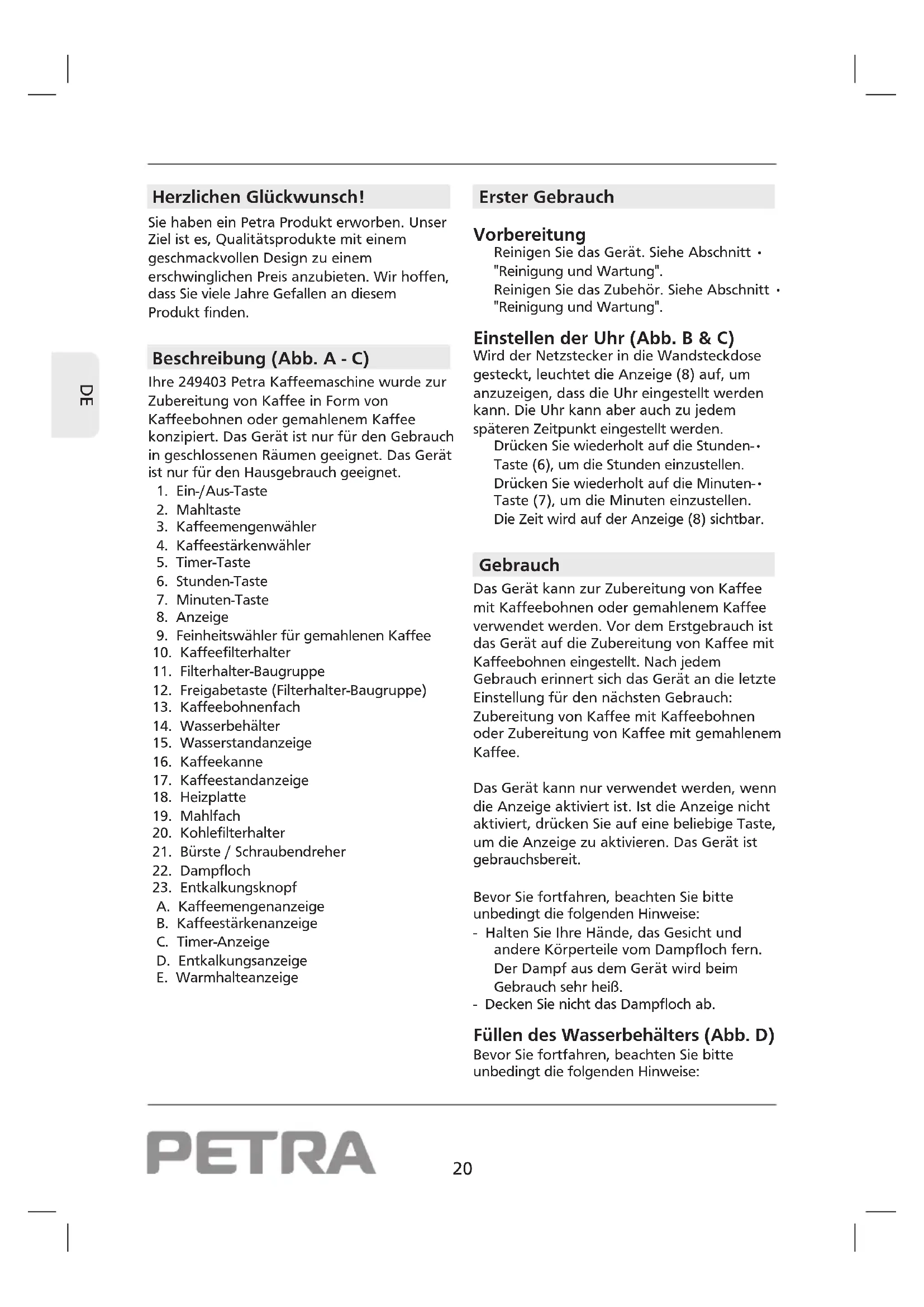 Herzlichen Glückwunsch! Sie haben ein Petra Produkt erworben. Unser Ziel ist es, Qualitätsprodukte mit einem geschmackvollen Design zu einem erschwinglichen Preis anzubieten. Wir hoffen, dass Sie viele Jahre Gefallen an diesem Produkt finden. Beschreibung (Abb. A - C) Ihre 249403 Petra Kaffeemaschine wurde zur Zubereitung von Kaffee in Form von Kaffeebohnen oder gemahlenem Kaffee konzipiert. Das Gerät ist nur für den Gebrauch in geschlossenen Räumen geeignet. Das Gerät ist nur für den Hausgebrauch geeignet.
