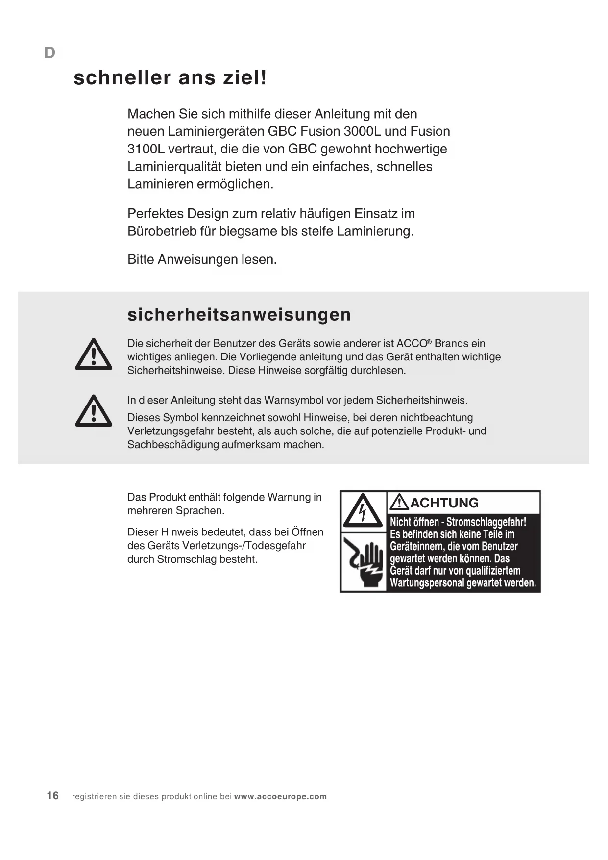 ACHTUNG: VOR DER REINIGUNG DER GERÄTEAUSSENSEITE MUSS DER NETZSTECKER GEZOGEN WERDEN. DAS GERÄT (NUR) AN DER AUSSENSEITE MIT EINEM FEUCHTEN TUCH ABWISCHEN. KEINE REINIGUNGS- ODER LÖSUNGSMITTEL VERWENDEN. Zum Reinigen der Walzen regelmäßig einen Reinigungskarton oder ein Blatt Papier durch das Laminiergerät laufen lassen. Bestellnr. für Reinigungskarton EK50000. gewährleistung Der Betrieb des Geräts ist bei normaler Verwendung für 2 Jahre ab Kaufdatum gewährleistet. Innerhalb des Gewährleistungszeitraums wird ACCO Brands Europe nach eigenem Ermessen das defekte Gerät entweder kostenlos instandsetzen oder ersetzen. Die Gewährleistung deckt keine Mängel ab, die aufgrund missbräuchlicher Verwendung oder Verwendung für unangemessene Zwecke entstanden sind. Ein Nachweis des Kaufdatums muss vorgelegt werden. Instandsetzungen oder Änderungen, die durch nicht von ACCO Brands Europe autorisierten Personen vorgenommen werden, setzen die Gewährleistung außer Kraft. Es ist unser Ziel, sicherzustellen, dass die Leistung unserer Produkte den angegebenen technischen Daten entspricht. Diese Gewährleistung stellt keine Einschränkung der nach dem geltenden Kaufvertragsrecht gültigen Rechte des Verbrauchers dar.I per una più veloce plastificazione dei documenti! Benvenuti alle nuove plasticatrici GBC Fusion 3000L e 3100L che consentono di plasticare documenti in maniera più semplice e veloce orendo la stessa elevata qualità di plasticazione che contraddistingue i prodotti GBC.Particolarmente adatte per un uso abbastanza frequente. Ideale per ottenere documenti da essibili a rigidi per l’ambiente oce.Si prega di leggere e osservare le istruzioni riportate di seguito quando si utilizza la plasticatrice.Pericolo di scarica elettrica. Non aprire. Non vi è alcun componente riparabile da parte dell’utente all’interno della macchina. Per operazioni di manutenzione o riparazione rivolgersi a personale qualicato. ATTENZIONE
