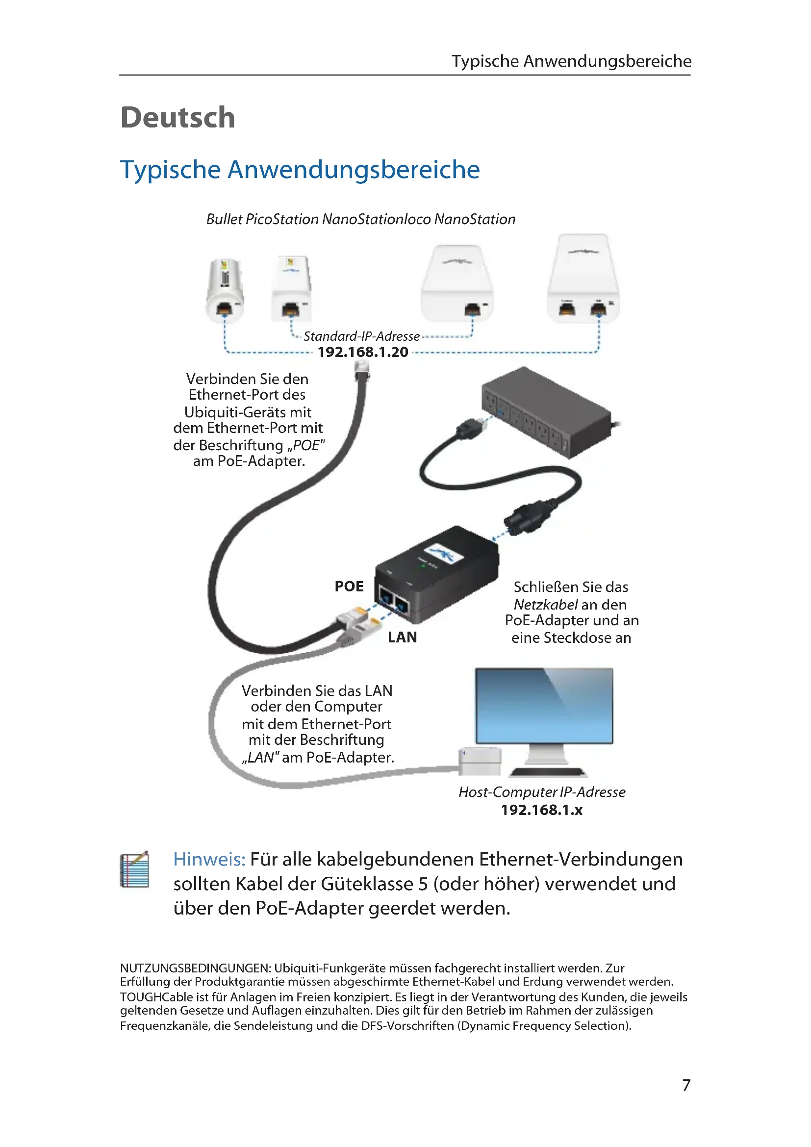 Hinweis: Für alle kabelgebundenen Ethernet-Verbindungen sollten Kabel der Güteklasse 5 (oder höher) verwendet und über den PoE-Adapter geerdet werden. NUTZUNGSBEDINGUNGEN: Ubiquiti-Funkgeräte müssen fachgerecht installiert werden. Zur Erfüllung der Produktgarantie müssen abgeschirmte Ethernet-Kabel und Erdung verwendet werden. TOUGHCable ist für Anlagen im Freien konzipiert. Es liegt in der Verantwortung des Kunden, die jeweils geltenden Gesetze und Auflagen einzuhalten. Dies gilt für den Betrieb im Rahmen der zulässigen Frequenzkanäle, die Sendeleistung und die DFS-Vorschriften (Dynamic Frequency Selection).8 Bullet