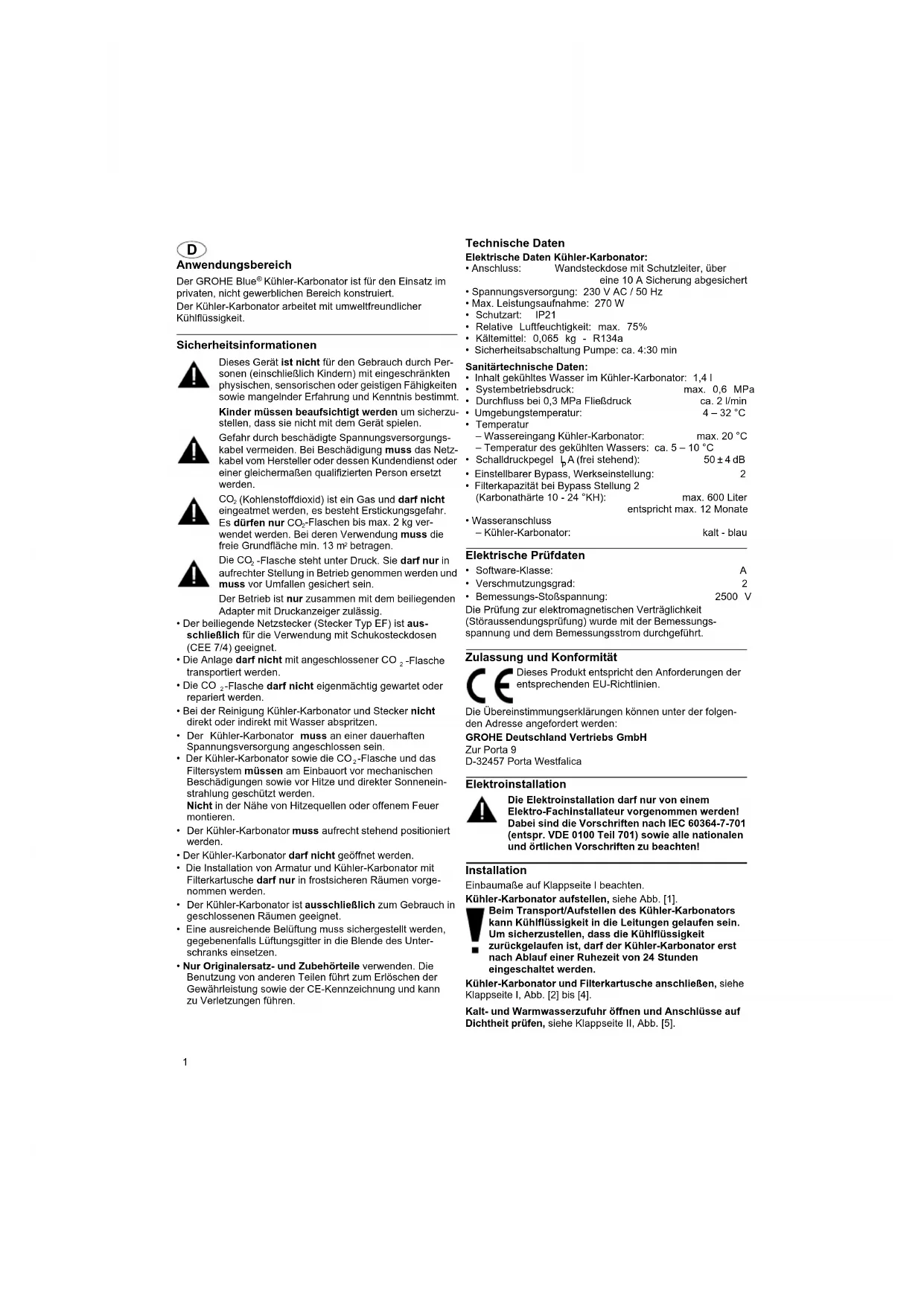 - Bemessungs-Stoßspannung: 2500 V Die Prüfung zur elektromagnetischen Verträglichkeit (Störaussendungsprüfung) wurde mit der Bemessungs- spannung und dem Bemessungsstrom durchgeführt. Zulassung und Konformität Die Übereinstimmungserklärungen können unter der folgen- den Adresse angefordert werden: GROHE Deutschland Vertriebs GmbH Zur Porta 9 D-32457 Porta Westfalica Elektroinstallation Die Elektroinstallation darf nur von einem Elektro-Fachinstallateur vorgenommen werden! Dabei sind die Vorschriften nach IEC 60364-7-701 (entspr. VDE 0100 Teil 701) sowie alle nationalen und örtlichen Vorschriften zu beachten! Installation Einbaumaße auf Klappseite I beachten. Kühler-Karbonator aufstellen, siehe Abb. [1]. Beim Transport/Aufstellen des Kühler-Karbonators kann Kühlflüssigkeit in die Leitungen gelaufen sein. Um sicherzustellen, dass die Kühlflüssigkeit zurückgelaufen ist, darf der Kühler-Karbonator erst nach Ablauf einer Ruhezeit von 24 Stunden eingeschaltet werden. Kühler-Karbonator und Filterkartusche anschließen, siehe Klappseite I, Abb. [2] bis [4]. Kalt- und Warmwasserzufuhr öffnen und Anschlüsse auf Dichtheit prüfen, siehe Klappseite II, Abb. [5]. Dieses Produkt entspricht den Anforderungen der entsprechenden EU-Richtlinien.2 Steckverbindung zwischen Armatur und Kühler- Karbonator herstellen, siehe Abb. [6]. Spannungsversorgung über Netzstecker herstellen, siehe Abb. [7]. Die Anzeige im Display leuchtet auf und die Filterrestkapazität wird in Prozent angezeigt.