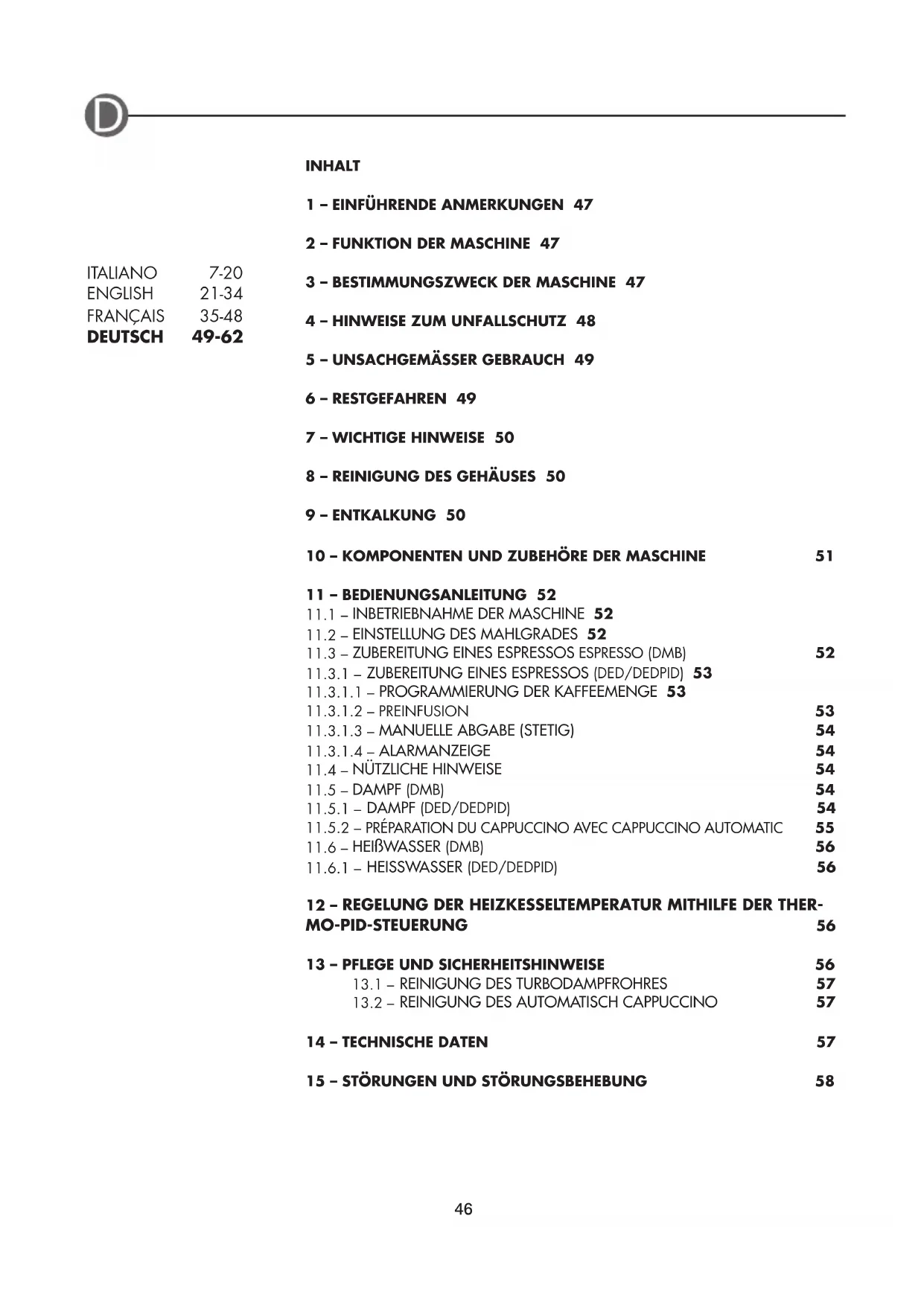 Der Benutzer muss sich neben der Beachtung der im vorliegenden Handbuch aufgeführten Hinweise und Vorschriften an die am Aufstellungsort der Maschine geltenden Bestimmungen zum Unfallschutz sowie an die durch den gesunden Menschenverstand vorgegebenen Regeln halten. Um die vorschriftsmäßige Funktion sowie über lange Zeit die Beibehaltung der Funktionseigenschaften der Maschine zu gewährleisten, wird empfohlen, die für den Betrieb der Maschine vorgeschriebenen Umgebungsbedingungen (Raumtemperatur zwischen 5° und 35° C) zu kontrollieren. Die Maschine darf nicht in unmittelbarer Nähe von Wasserausgaben betrieben werden, oder an Orten (im Freien) betrieben werden, die direkten atmosphärischen Einwirkungen (Sonnenstrahlen, Regen, usw.) ausgesetzt sind. Vergewissern Sie sich beim Auspacken der Maschine, dass die Maschine unversehrt und unbeschädigt ist. Die verschiedenen Bestandteile der Verpackung der Maschine müssen ordnungsgemäß entsorgt werden und dürfen auf keinen Fall unbeaufsichtigt in der Reichweite von Kindern, Tieren oder unbefähigten Personen gelassen werden. Stellen Sie die Maschine an einem gut geschützten Ort auf einer festen Fläche in einer angemessenen Entfernung zu Wärmequellen und außerhalb der Reichweite von Kindern auf. Vergewissern Sie sich vor Anschluss an das Stromnetz sowie vor der Trennung vom Stromnetz immer, dass der Hauptschalter der Maschine auf „AUS“ gesetzt ist. Vor Abstellung der Maschine sowie vor Ausführung der Arbeiten der Reinigung und Wartung muss immer der Netzstecker gezogen werden (nicht am Netzkabel ziehen!). Benutzen Sie die Maschine nicht, wenn sie nicht einwandfrei arbeiten sollte oder wenn das Netzkabel oder der Netzstecker der Maschine beschädigt sein sollten; tauschen Sie das Netzkabel in diesem Fall aus, oder lassen Sie die Maschine von einem autorisierten KUNDENDIENST kontrollieren. Die unter Hitze stehenden Flächen und Teile der Maschine (Brühkopf, Tassenwärmer, Siebträger, Dampfrohr) dürfen nicht berührt werden. (Verbrühungsgefahr !). Der Siebträger darf während der Kaffeeabgabe nicht abgenommen werden. (Verbrühungsgefahr!). Halten Sie die Hände nie unter den Brühkopf oder unter das Dampfrohr der Maschine, da die austretenden Flüssigkeiten bzw. der Wasserdampf unter hohen Temperaturen stehen und Verbrühungen bewirken können. Warten Sie nach der Kaffeeabgabe, bevor Sie den Siebträger abnehmen, immer einige Sekunden ab, damit eventuell vorhandener Restdruck abgelassen werden kann und Verbrühungen vermieden werden. Um die Heizwiderstände nicht zu beschädigen, darf die Maschine nie ohne Wasser betrieben werden. Um eine potentielle Beschädigung der Maschine zu vermeiden, sollten Sie darauf achten, immer nur vom Hersteller zugelassene Originalersatzteile und Originalzubehörteile zu verwenden. Die Personen (inklusiv Kinder), die verringerte physische, sensorielle und geistige Kapazitäten haben, oder keine Erfahrung mit solchen Geräten haben, dürfen diese Maschine nicht benutzen.49 Deutsch Sie können die Maschine nur unter Oberaufsicht einer Person, die für die Sicherheit dieser Personen verantwortlich ist. Die Kinder dürfen mit dieser Maschine nicht spielen. Schalten Sie die Maschine im Fall von Störungen oder eines nicht einwandfreien Betriebs aus, und übergeben Sie sie zum Austausch beschädigter oder verschlissener Teile gegen Originalersatzteile an einen autorisierten KUNDENDIENST. Benutzen Sie die Maschine nicht, falls der Netzstecker o. das Netzkabel defekt ist. Zum Austausch dieser Elemente setzen Sie sich mit einem KUNDENDIENST im Kontakt. Die Ausführung von nicht vom Hersteller genehmigten Eingriffen zur Reparatur sowie der Einsatz von anderen Teilen als den Originalersatzteilen beinhalten einen Verfall der Herstellergarantie. Die Maschine darf nicht im Freien betrieben werden. Die Maschine darf nur für die Zwecke gebraucht werden, für die sie geplant und gebaut wurde. Um der Gefahr eines Brandes sowie des elektrischen Schlages und der Verletzung von Personen vorzubeugen, dürfen die Maschine sowie das Netzkabel und alle zur Maschine gehörenden Komponenten nicht in Wasser getaucht werden. Benutzen Sie im Fall eines Brandes Kohlensäure-Feuerlöscher (CO