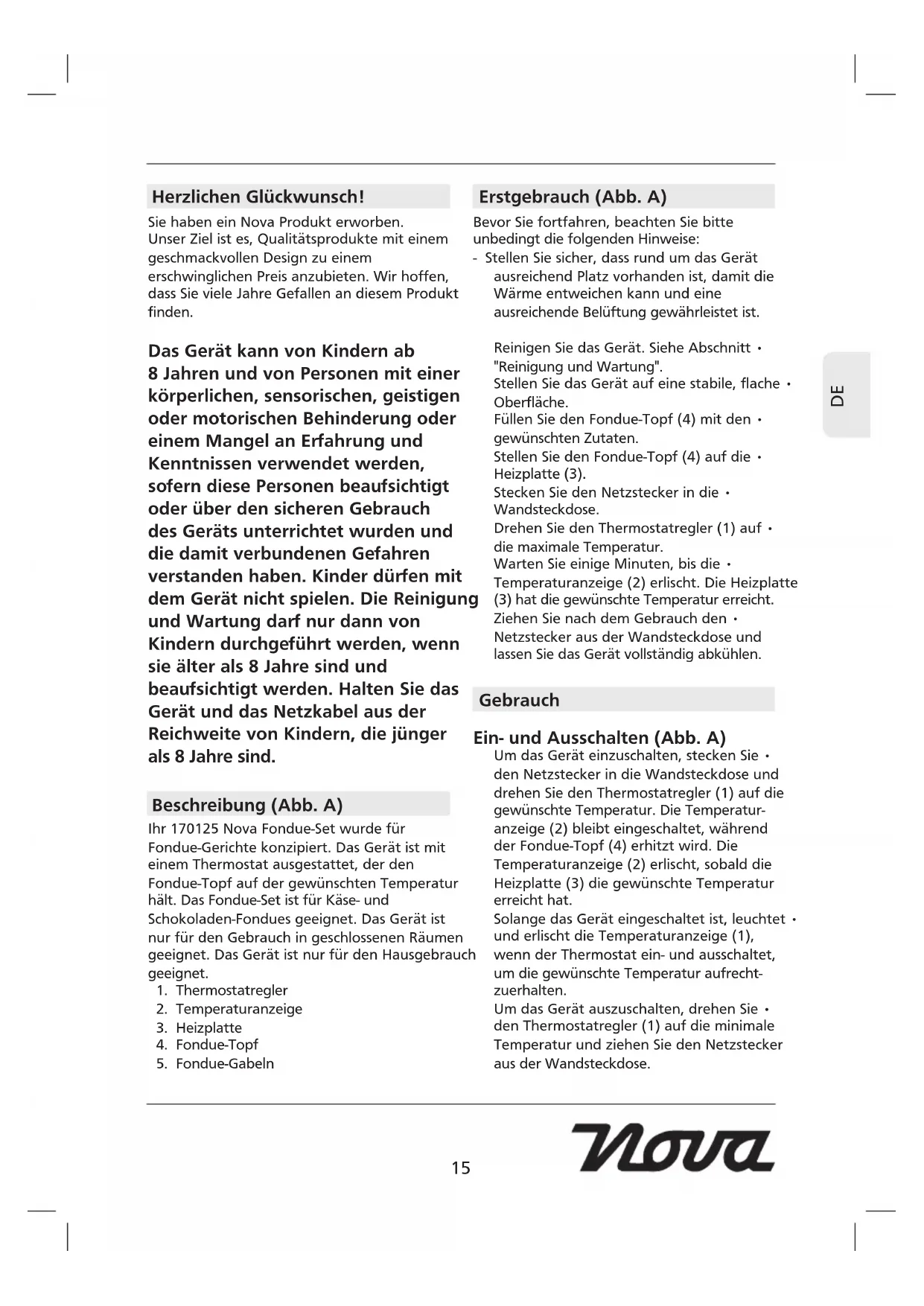 Herzlichen Glückwunsch! Sie haben ein Nova Produkt erworben. Unser Ziel ist es, Qualitätsprodukte mit einem geschmackvollen Design zu einem erschwinglichen Preis anzubieten. Wir hoffen, dass Sie viele Jahre Gefallen an diesem Produkt finden. Das Gerät kann von Kindern ab 8 Jahren und von Personen mit einer körperlichen, sensorischen, geistigen oder motorischen Behinderung oder einem Mangel an Erfahrung und Kenntnissen verwendet werden, sofern diese Personen beaufsichtigt oder über den sicheren Gebrauch des Geräts unterrichtet wurden und die damit verbundenen Gefahren verstanden haben. Kinder dürfen mit dem Gerät nicht spielen. Die Reinigung und Wartung darf nur dann von Kindern durchgeführt werden, wenn sie älter als 8 Jahre sind und beaufsichtigt werden. Halten Sie das Gerät und das Netzkabel aus der Reichweite von Kindern, die jünger als 8 Jahre sind. Beschreibung (Abb. A) Ihr 170125 Nova Fondue-Set wurde für Fondue-Gerichte konzipiert. Das Gerät ist mit einem Thermostat ausgestattet, der den Fondue-Topf auf der gewünschten Temperatur hält. Das Fondue-Set ist für Käse- und Schokoladen-Fondues geeignet. Das Gerät ist nur für den Gebrauch in geschlossenen Räumen geeignet. Das Gerät ist nur für den Hausgebrauch geeignet.