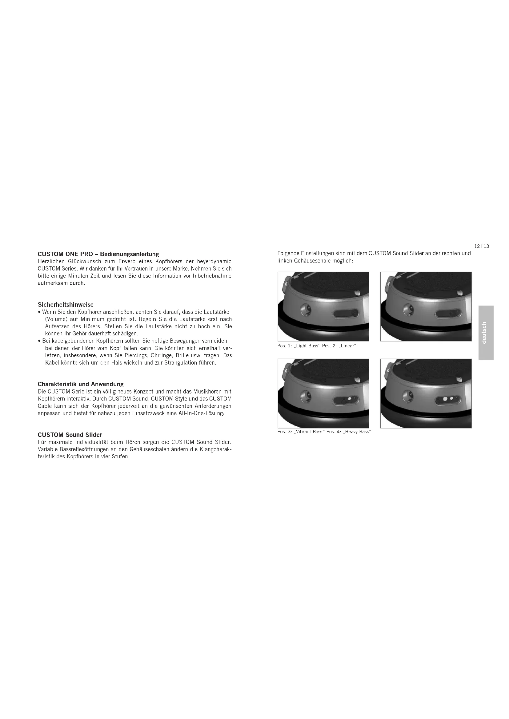 - Bei kabelgebundenen Kopfhörern sollten Sie heftige Bewegungen vermeiden, bei denen der Hörer vom Kopf fallen kann. Sie könnten sich ernsthaft ver- letzen, insbesondere, wenn Sie Piercings, Ohrringe, Brille usw. tragen. Das Kabel könnte sich um den Hals wickeln und zur Strangulation führen. Charakteristik und Anwendung Die CUSTOM Serie ist ein völlig neues Konzept und macht das Musikhören mit Kopfhörern interaktiv. Durch CUSTOM Sound, CUSTOM Style und das CUSTOM Cable kann sich der Kopfhörer jederzeit an die gewünschten Anforderungen anpassen und bietet für nahezu jeden Einsatzzweck eine All-In-One-Lösung: CUSTOM Sound Slider Für maximale Individualität beim Hören sorgen die CUSTOM Sound Slider: Variable Bassreflexöffnungen an den Gehäuseschalen ändern die Klangcharak- teristik des Kopfhörers in vier Stufen. Folgende Einstellungen sind mit dem CUSTOM Sound Slider an der rechten und linken Gehäuseschale möglich: Pos. 1: „Light Bass“ Pos. 2: „Linear“ Pos. 3: „Vibrant Bass“ Pos. 4: „Heavy Bass“ 12 | 13deutsch 14 | 15 CUSTOM ONE PRO – Sound Patterns CUSTOM Noise Isolation Ein weiteres Feature der innovativen CUSTOM Sound Slider: Sie dichten beim Schließen den Kopfhörer schrittweise immer stärker ab. Umweltgeräusche wie brummende Flugzeugturbinen oder Straßenlärm werden erheblich gedämpft. CUSTOM Style Interaktiv ist nicht nur der Sound des Kopfhörers, sondern auch sein Design. Die Ringe, Covers und Ohrpolster der Hörerschalen sind ebenso austauschbar wie das Kopfpolster. Alle Zubehörteile finden Sie online unter: www.beyerdynamic.com/custom Covers und/oder Ringe wechseln