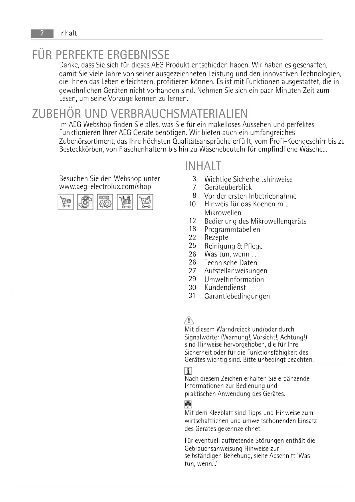 Im AEG Webshop finden Sie alles, was Sie für ein makelloses Aussehen und perfektes Funktionieren Ihrer AEG Geräte benötigen. Wir bieten auch ein umfangreiches Zubehörsortiment, das Ihre höchsten Qualitätsansprüche erfüllt, vom Profi-Kochgeschirr bis zu Besteckkörben, von Flaschenhaltern bis hin zu Wäschebeuteln für empfindliche Wäsche... Mit diesem Warndreieck und/oder durch Signalwörter (Warnung!, Vorsicht!, Achtung!) sind Hinweise hervorgehoben, die für Ihre Sicherheit oder für die Funktionsfähigkeit des Gerätes wichtig sind. Bitte unbedingt beachten. Nach diesem Zeichen erhalten Sie ergänzende Informationen zur Bedienung und praktischen Anwendung des Gerätes. Mit dem Kleeblatt sind Tipps und Hinweise zum wirtschaftlichen und umweltschonenden Einsatz des Gerätes gekennzeichnet. Für eventuell auftretende Störungen enthält die Gebrauchsanweisung Hinweise zur selbständigen Behebung, siehe Abschnitt ‘Was tun, wenn...’ INHALT Besuchen Sie den Webshop unter www.aeg-electrolux.com/shop Wichtige Sicherheitshinweise Geräteüberblick Vor der ersten Inbetriebnahme Hinweis für das Kochen mit Mikrowellen Bedienung des Mikrowellengeräts Programmtabellen Rezepte Reinigung & Pflege Was tun, wenn . . . Technische Daten Aufstellanweisungen Umweltinformation Kundendienst Garantiebedingungen