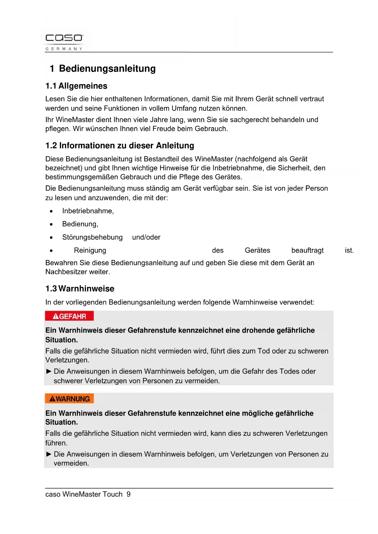 Ein Warnhinweis dieser Gefahrenstufe kennzeichnet eine mögliche gefährliche Situation. Falls die gefährliche Situation nicht vermieden wird, kann dies zu schweren Verletzungen führen. ► Die Anweisungen in diesem Warnhinweis befolgen, um Verletzungen von Personen zu vermeiden.caso WineMaster Touch 10