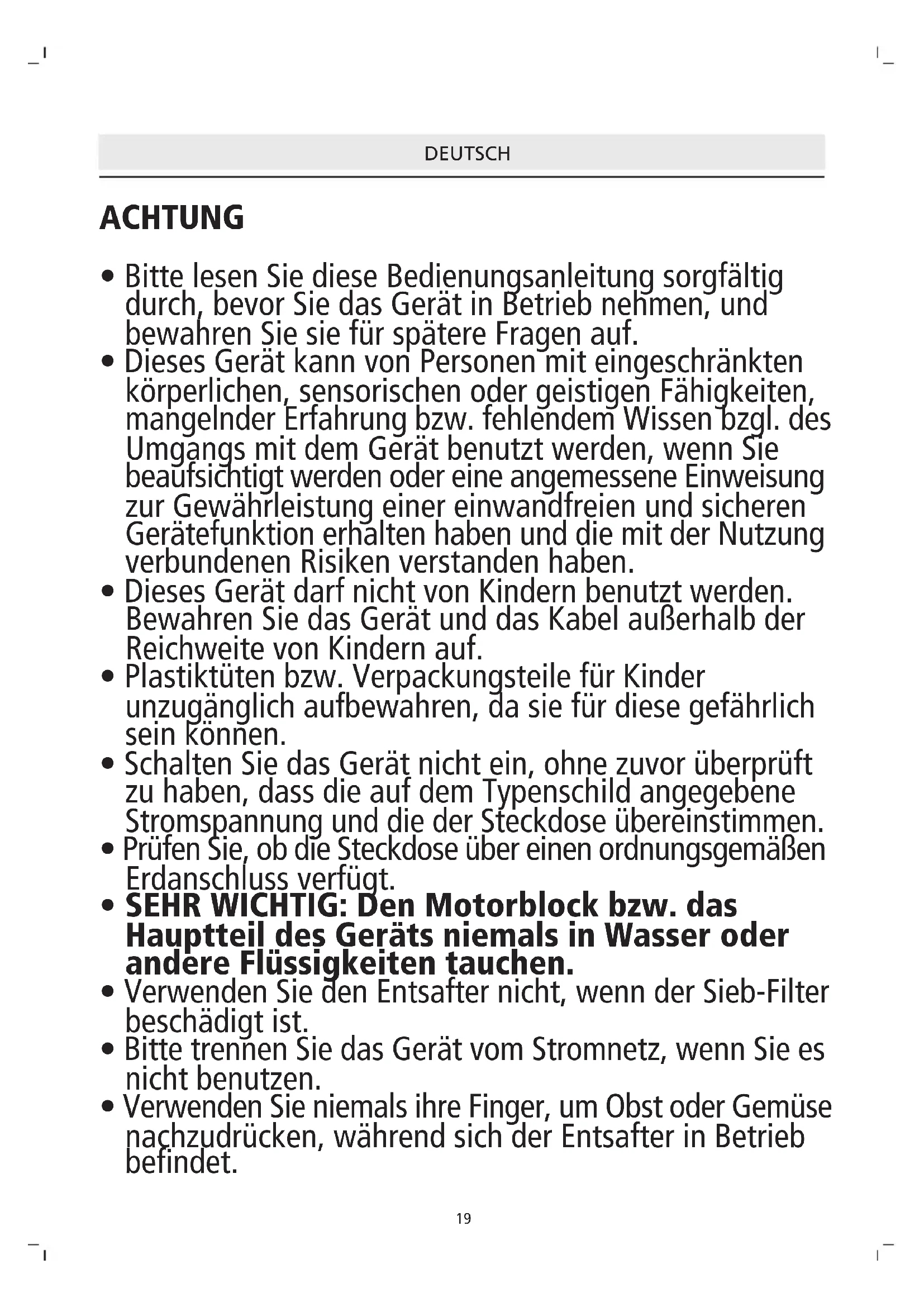 - Verwenden Sie niemals ihre Finger, um Obst oder Gemüse nachzudrücken, während sich der Entsafter in Betrieb befindet.20