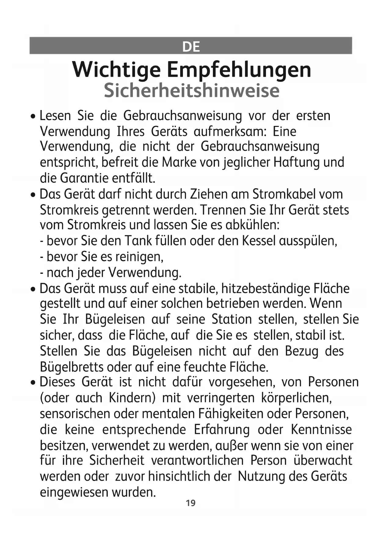 - Dieses Gerät ist nicht dafür vorgesehen, von Personen (oder auch Kindern) mit verringerten körperlichen, sensorischen oder mentalen Fähigkeiten oder Personen, die keine entsprechende Erfahrung oder Kenntnisse besitzen, verwendet zu werden, außer wenn sie von einer für ihre Sicherheit verantwortlichen Person überwacht werden oder zuvor hinsichtlich der Nutzung des Geräts eingewiesen wurden. 1800129571_GV71XX_GV72XX_110x154 10/06/13 16:54 Page1920