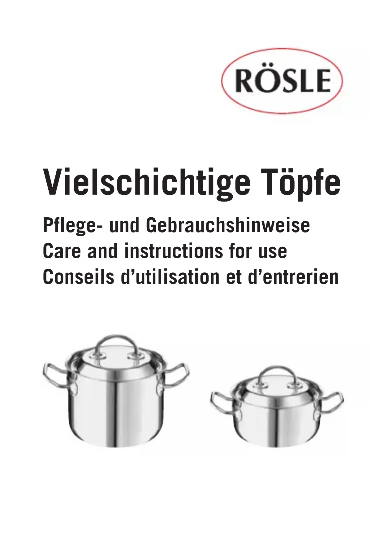 Vielschichtige Töpfe Pflege- und Gebrauchshinweise Care and instructions for use Conseils d’utilisation et d’entrerienMit den Multiply-Töpfen von RÖSLE haben Sie sich für ein Produkt erstklassiger Qualität ent- schieden. Unsere Töpfe sind aus hochwertigem Mehrschichtmaterial hergestellt, auf das auch Profiköche schwören. Dieses Material leitet die Hitze vom Boden direkt in die Wand, so dass Ihr Kochgut von allen Seiten energiesparend, Vitamin und Nährstoff schonend, gleichmäßig und schnell erhitzt wird. RÖSLE-Kochgeschirr fällt neben der hohen Funktionalität durch eine vielseitige Verwend- barkeit auf. Sie eignen sich auch, dank des formschönen Designs und leichten Gewichts, vorzüglich als Serviergeschirr auf dem Tisch. Wenn Sie die folgenden Hinweise beachten, werden Sie viel Freude an Ihrem neuen Koch- geschirr haben. Profi-Qualität, die sich auszahlt.