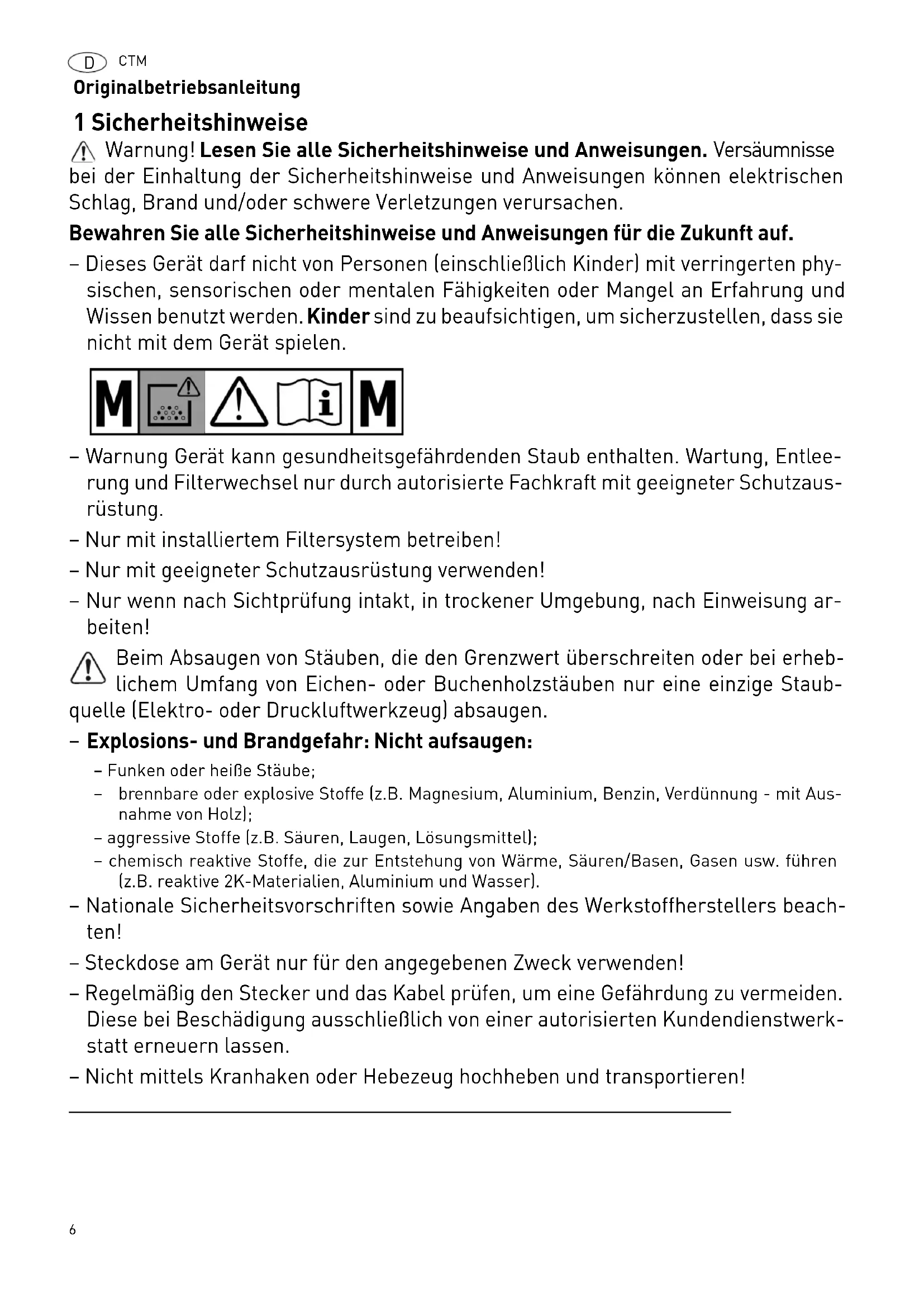 Explosions- und Brandgefahr: Nicht aufsaugen: – Funken oder heiße Stäube; – brennbare oder explosive Stoffe (z.B. Magnesium, Aluminium, Benzin, Verdünnung - mit Aus- nahme von Holz); – aggressive Stoffe (z.B. Säuren, Laugen, Lösungsmittel); – chemisch reaktive Stoffe, die zur Entstehung von Wärme, Säuren/Basen, Gasen usw. führen (z.B. reaktive 2K-Materialien, Aluminium und Wasser). – Nationale Sicherheitsvorschriften sowie Angaben des Werkstoffherstellers beach- ten! – Steckdose am Gerät nur für den angegebenen Zweck verwenden! – Regelmäßig den Stecker und das Kabel prüfen, um eine Gefährdung zu vermeiden. Diese bei Beschädigung ausschließlich von einer autorisierten Kundendienstwerk- statt erneuern lassen. – Nicht mittels Kranhaken oder Hebezeug hochheben und transportieren!CTM