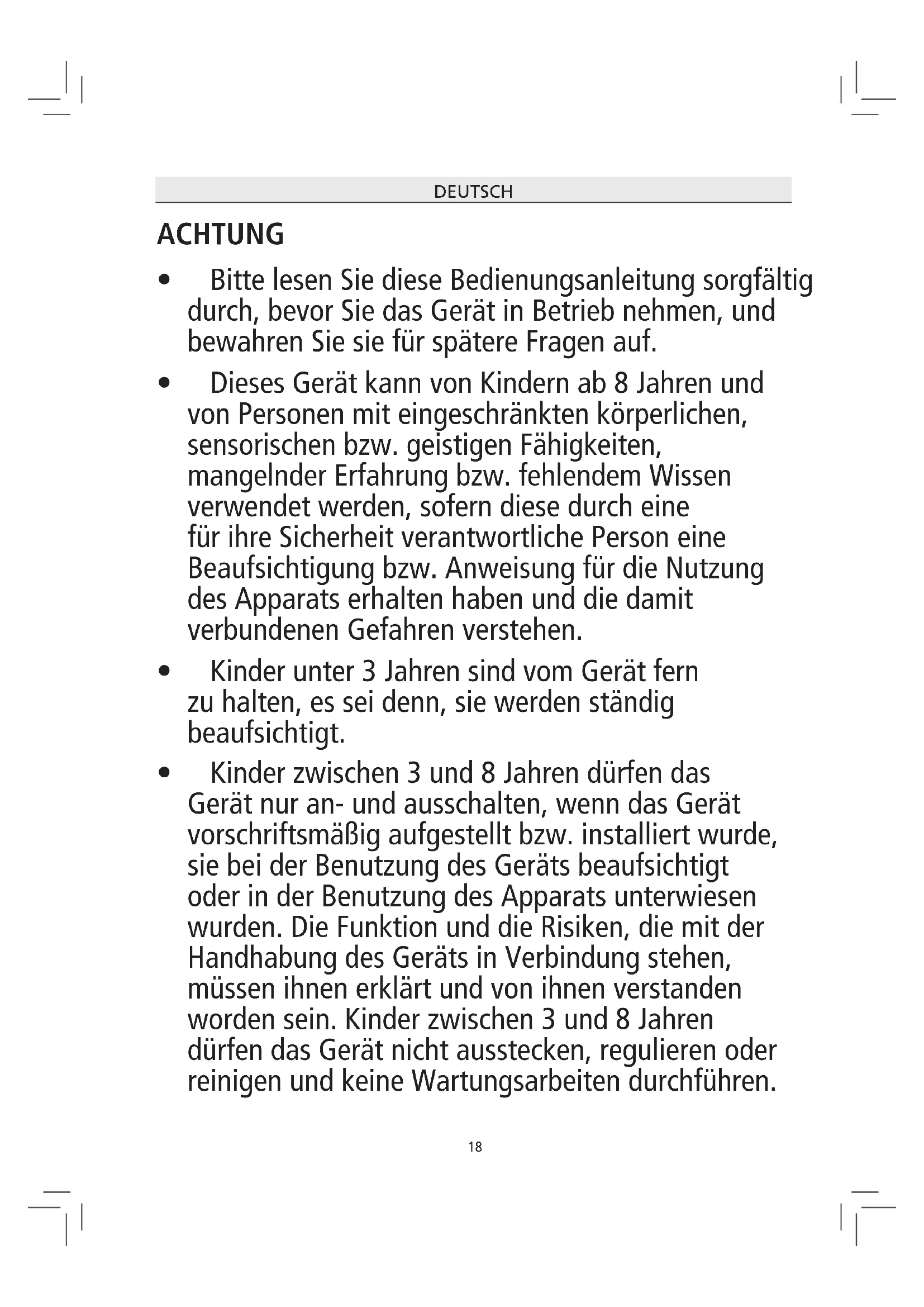- Kinder zwischen 3 und 8 Jahren dürfen das Gerät nur an- und ausschalten, wenn das Gerät vorschriftsmäßig aufgestellt bzw. installiert wurde, sie bei der Benutzung des Geräts beaufsichtigt oder in der Benutzung des Apparats unterwiesen wurden. Die Funktion und die Risiken, die mit der Handhabung des Geräts in Verbindung stehen, müssen ihnen erklärt und von ihnen verstanden worden sein. Kinder zwischen 3 und 8 Jahren dürfen das Gerät nicht ausstecken, regulieren oder reinigen und keine Wartungsarbeiten durchführen.19