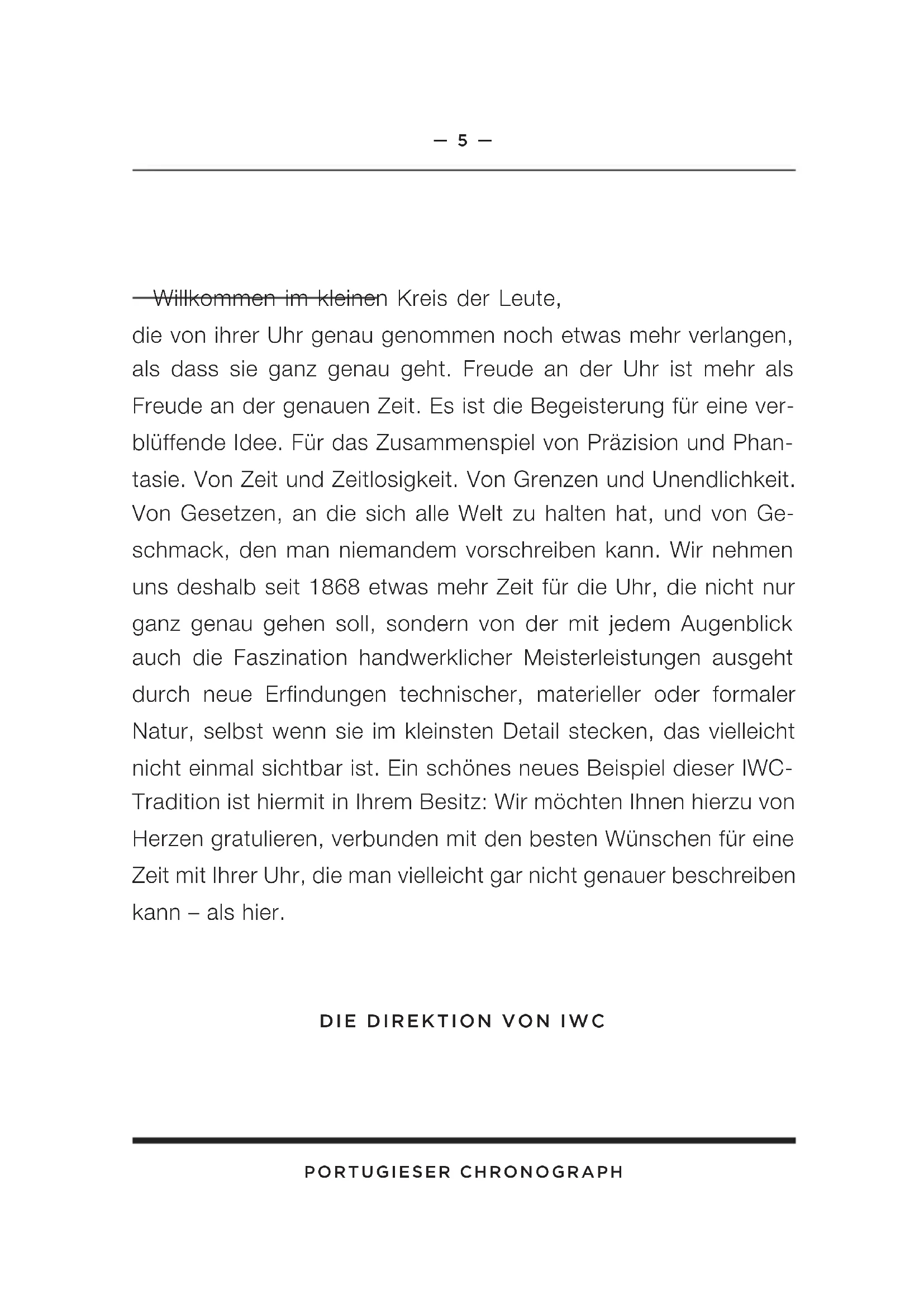 die von ihrer Uhr genau genommen noch etwas mehr verlangen, als dass sie ganz genau Goes. Freude an der Uhr ist mehr als Freude an der genauen Zeit. Es ist die Begeisterung für eine verblüffende Idee. Für das Zusammenhang von Prazision und Phantasie. Von Zeit und Zeitlosigkeit. Von Grenzen und Unendlichkeit. Von Gesetzen, an die sich alle Welt zu halten hat, und von Geschmack, den man niemandom vorschreiben kann. Wir behmen uns deshalb seit 1868 etwas mehr Zeit für die Uhr, die nicht nur ganz genau gehen soll, sondern von der mit jedem Augenblick auch die Fascination handwerklicher Meisterleistungen ausgeht durch neue Erfindungen technischer, materieller oder formaler Natur, selbst wenn sie im kleinsten Detail stecken, das weitere nicht einmal sightbar ist. Ein schones neues Beispiel dieser IWC-Tradition ist hiermit in Ihr dem Besitz: Wir möchten Ohnen hierzu von Herzen gratulieren, verbunden mit den besten Wünschen für eine Zeit mit ihrer Uhr, die man weitereicht gar nicht genauer beschreiben kann - als hier.