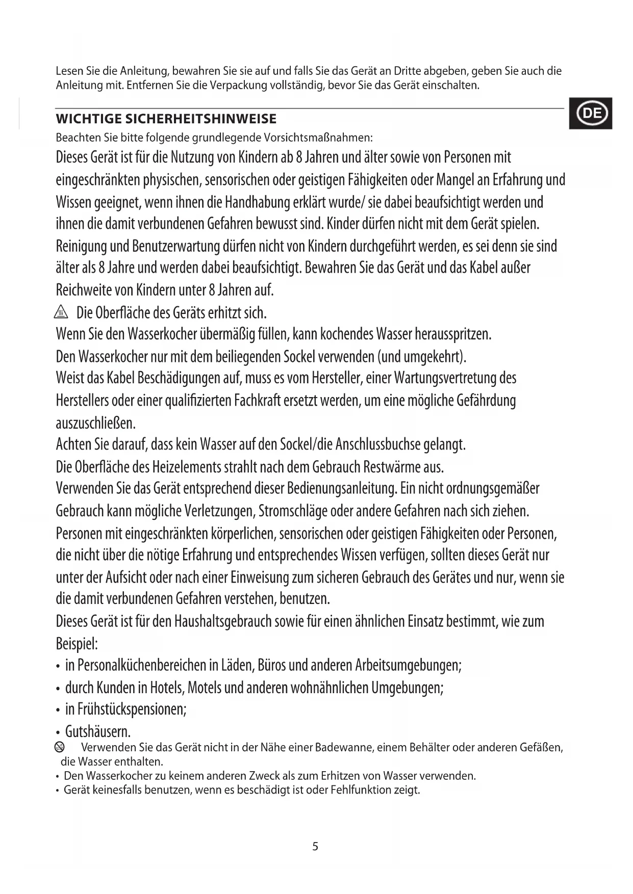 To avoid environmental and health problems due to hazardous substances, appliances and rechargeable and non-rechargeable batteries marked with one of these symbols must not be disposed of with unsorted municipal waste. Always dispose of electrical and electronic products and, where applicable, rechargeable and non-rechargeable batteries, at an appropriate official recycling/collection point.5 Lesen Sie die Anleitung, bewahren Sie sie auf und falls Sie das Gerät an Dritte abgeben, geben Sie auch die Anleitung mit. Entfernen Sie die Verpackung vollständig, bevor Sie das Gerät einschalten. WICHTIGE SICHERHEITSHINWEISE Beachten Sie bitte folgende grundlegende Vorsichtsmaßnahmen: Dieses Gerät ist für die Nutzung von Kindern ab 8 Jahren und älter sowie von Personen mit eingeschränkten physischen, sensorischen oder geistigen Fähigkeiten oder Mangel an Erfahrung und Wissen geeignet, wenn ihnen die Handhabung erklärt wurde/ sie dabei beaufsichtigt werden und ihnen die damit verbundenen Gefahren bewusst sind. Kinder dürfen nicht mit dem Gerät spielen. Reinigung und Benutzerwartung dürfen nicht von Kindern durchgeführt werden, es sei denn sie sind älter als 8 Jahre und werden dabei beaufsichtigt. Bewahren Sie das Gerät und das Kabel außer Reichweite von Kindern unter 8 Jahren auf. h Die Oberfläche des Geräts erhitzt sich. Wenn Sie den Wasserkocher übermäßig füllen, kann kochendes Wasser herausspritzen. Den Wasserkocher nur mit dem beiliegenden Sockel verwenden (und umgekehrt). Weist das Kabel Beschädigungen auf, muss es vom Hersteller, einer Wartungsvertretung des Herstellers oder einer qualifizierten Fachkraft ersetzt werden, um eine mögliche Gefährdung auszuschließen. Achten Sie darauf, dass kein Wasser auf den Sockel/die Anschlussbuchse gelangt. Die Oberfläche des Heizelements strahlt nach dem Gebrauch Restwärme aus. Verwenden Sie das Gerät entsprechend dieser Bedienungsanleitung. Ein nicht ordnungsgemäßer Gebrauch kann mögliche Verletzungen, Stromschläge oder andere Gefahren nach sich ziehen. Personen mit eingeschränkten körperlichen, sensorischen oder geistigen Fähigkeiten oder Personen, die nicht über die nötige Erfahrung und entsprechendes Wissen verfügen, sollten dieses Gerät nur unter der Aufsicht oder nach einer Einweisung zum sicheren Gebrauch des Gerätes und nur, wenn sie die damit verbundenen Gefahren verstehen, benutzen. Dieses Gerät ist für den Haushaltsgebrauch sowie für einen ähnlichen Einsatz bestimmt, wie zum Beispiel: