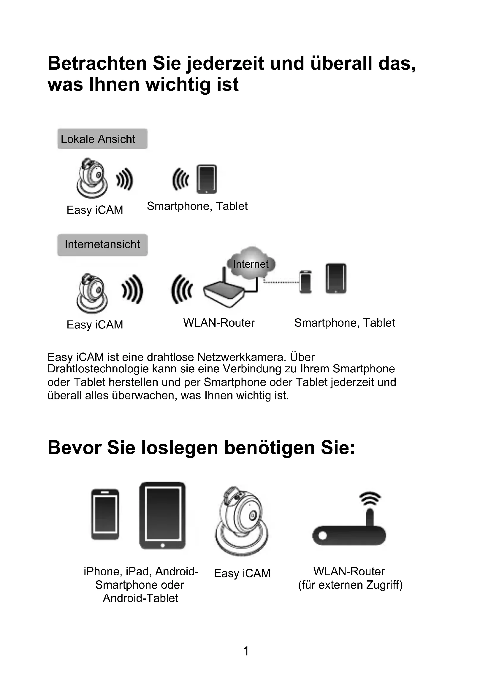 Easy-iCAM ist eine drahtlose Netzwerkkamera. Sie kann per Drahtlostechnologie direkt eine Verbindung mit ihrem Smartphone oder Tablet herstellen und Sie konnen Echtzeitvideo-Feeds an ihrem Smartphone oder Tablet im lokalen Ansichtsmodus betrachten. Im Internetansichtsmodus muss Ihr Smartphone oder Tablet über einen WLAN-Router oder ein mobiles 3G/4G-Netzwerk eine Verbindung zur Kamera herstellen; anschließend konnen Sie an ihrem Smartphone oder Tablet überall auf der Welt auf den Echtzeitstream mit Bild und Ton zugreifen.