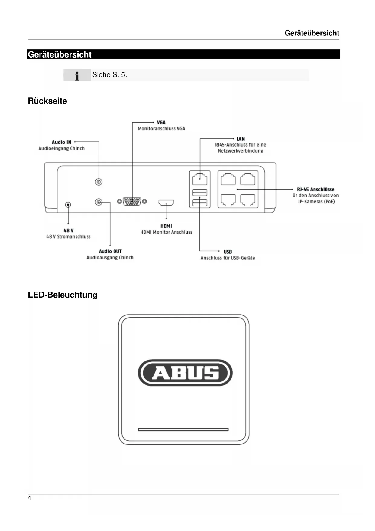 Auspacken Während Sie das Gerät auspacken, handhaben sie die- ses mit äußerster Sorgfalt. Verpackungen und Packhilfsmittel sind recyclingfähig und sollen grundsätzlich der Wiederverwertung zuge- führt werden. Wir empfehlen Ihnen: Papier-, Pappe und Wellpappe bzw. Kunststoffverpa- ckungsteile sollten in die jeweils dafür vorgesehenen Sammelbehälter gegeben werden. Solange solche in Ihrem Wohngebiet noch nicht vorhan- den sind, können Sie diese Materialien zum Hausmüll geben. Bei einer eventuellen Beschädigung der Originalverpa- ckung, prüfen Sie zunächst das Gerät. Falls das Gerät Beschädigungen aufweist, senden Sie dieses mit Verpa- ckung zurück und kontaktieren Sie den Hersteller. Lieferumfang ABUS 4-Kanal Netzwerk-Videorekorder Netzteil USB Maus SATA-Kabel und Schrauben für Festplatten
