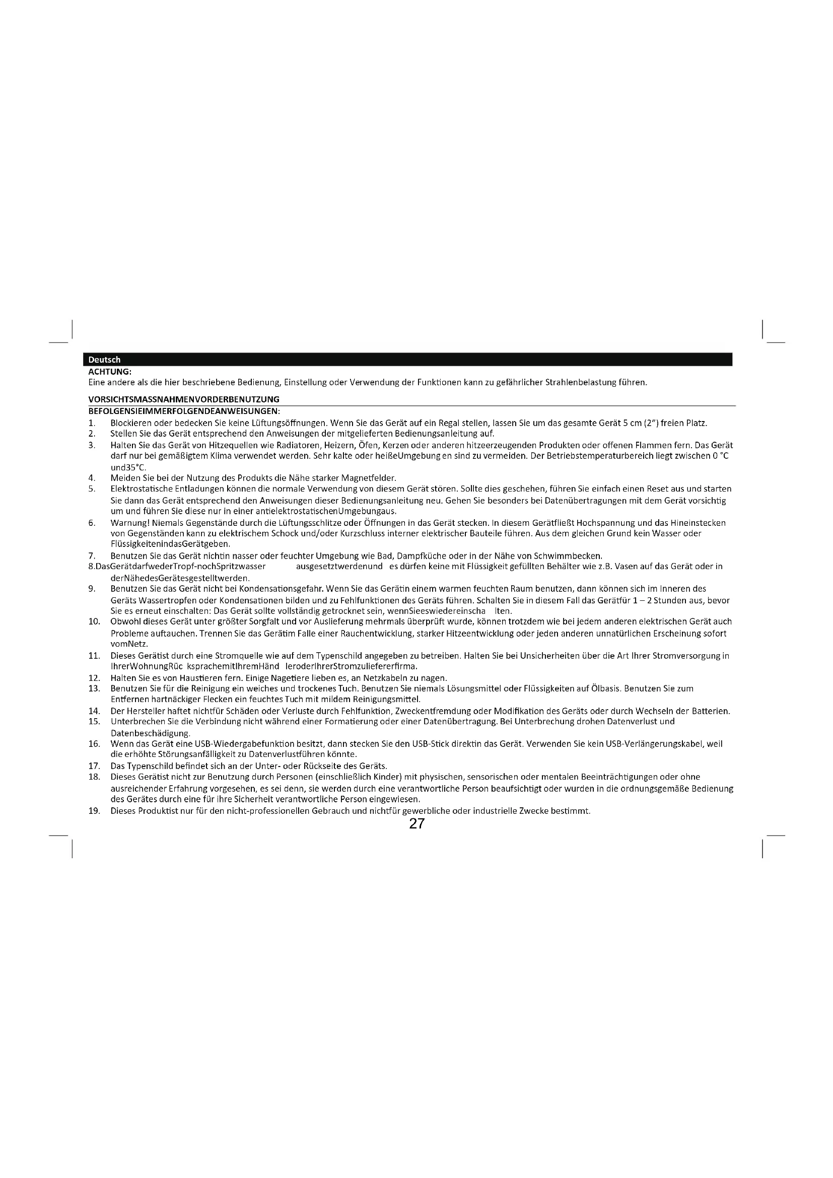 19. Dieses Produkst nur für den nicht-professionellen Gebrauch und nichür gewerbliche oder industrielle Zwecke besmmt.
