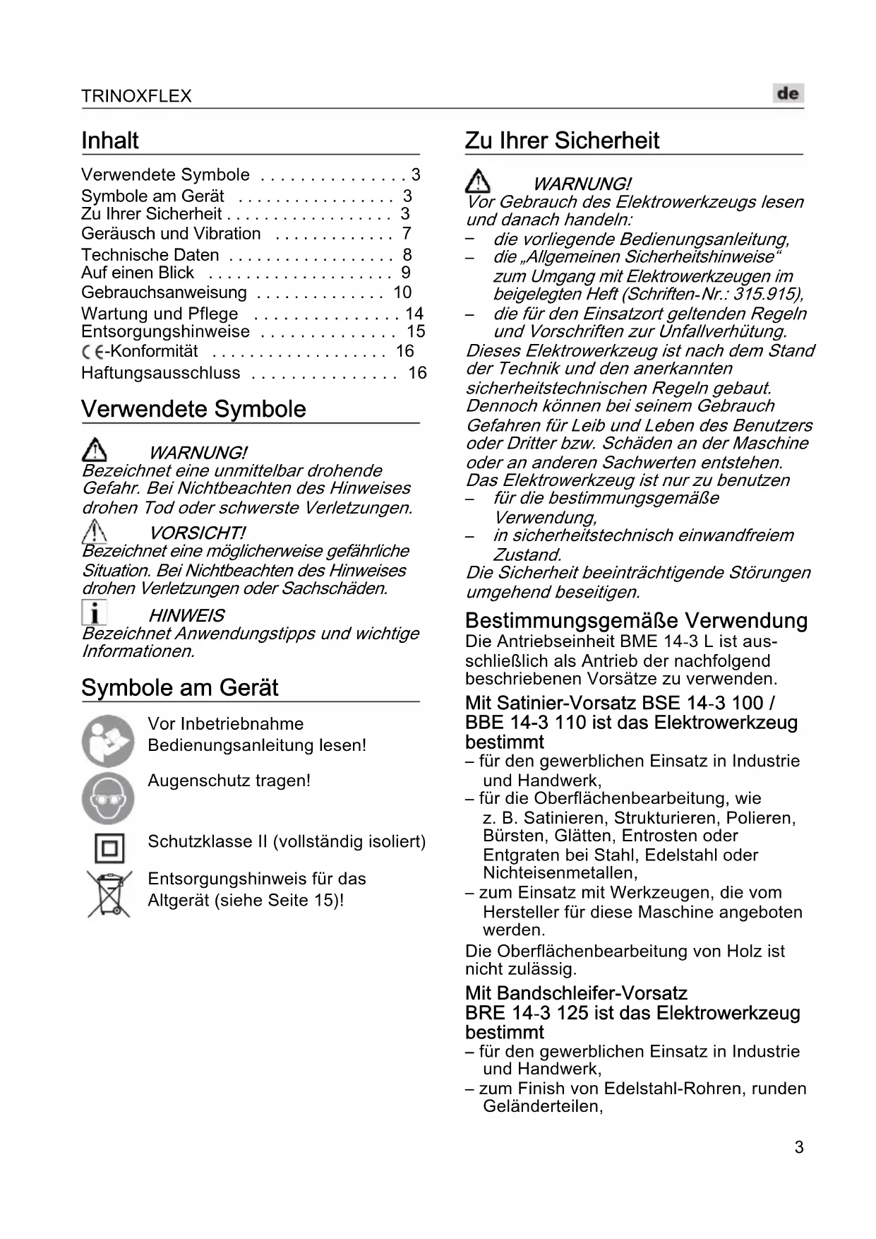in sicherheitstechnisch einwandfreiem Zustand. Die Sicherheit beeinträchtigende Störungen umgehend beseitigen. Bestimmungsgemäße Verwendung Die Antriebseinheit BME 14-3 L ist aus-schließlich als Antrieb der nachfolgend beschriebenen Vorsätze zu verwenden. Mit Satinier-Vorsatz BSE 14-3 100 / BBE 14-3 110 ist das Elektrowerkzeug bestimmt – für den gewerblichen Einsatz in Industrie und Handwerk,– für die Oberflächenbearbeitung, wie z. B. Satinieren, Strukturieren, Polieren, Bürsten, Glätten, Entrosten oder Entgraten bei Stahl, Edelstahl oder Nichteisenmetallen,– zum Einsatz mit Werkzeugen, die vom Hersteller für diese Maschine angeboten werden.Die Oberflächenbearbeitung von Holz ist nicht zulässig. Mit Bandschleifer-Vorsatz BRE 14-3 125 ist das Elektrowerkzeug bestimmt – für den gewerblichen Einsatz in Industrie und Handwerk,– zum Finish von Edelstahl-Rohren, runden Geländerteilen,TRINOXFLEX