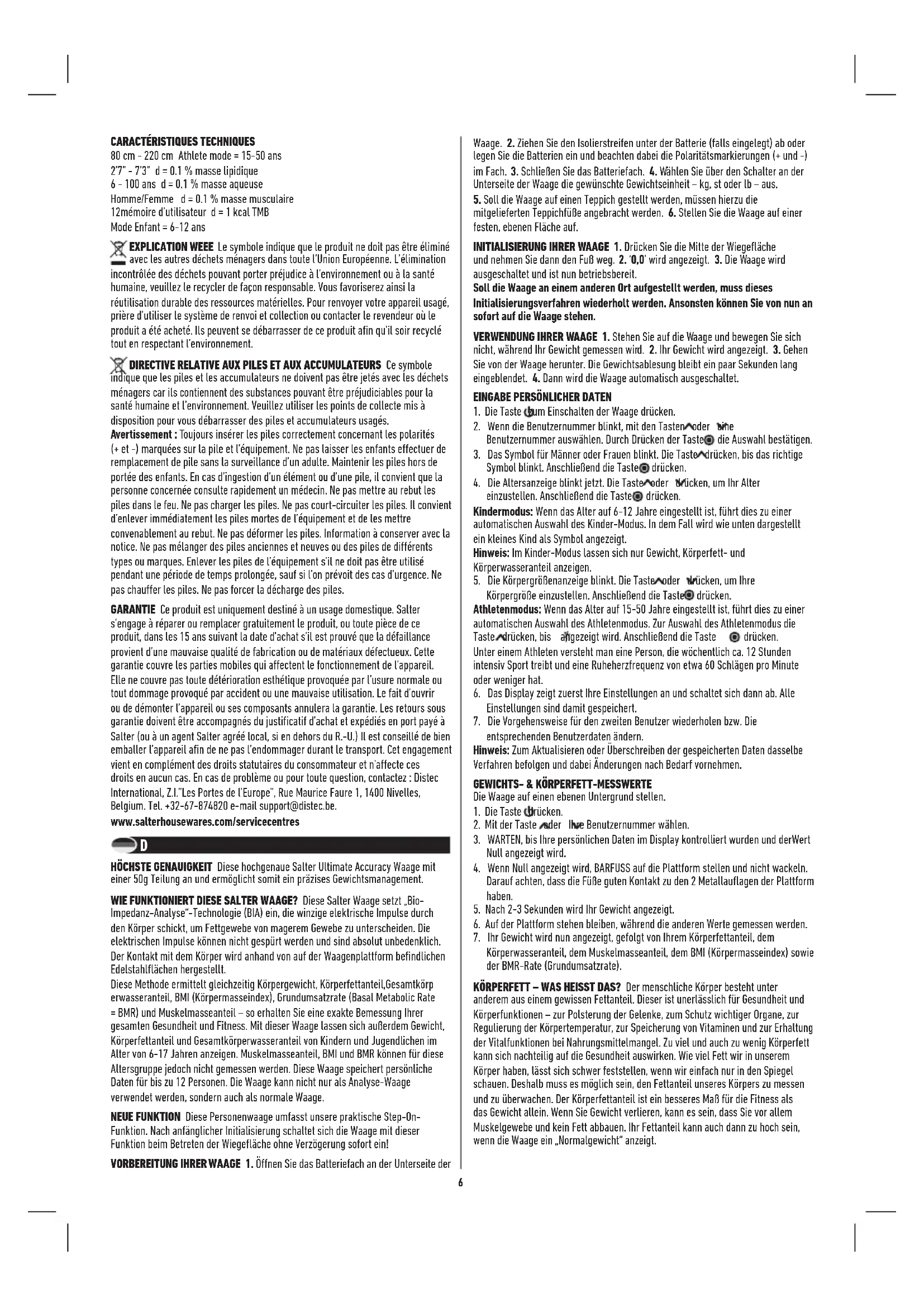 Wie genau werden mein Körperfett und Körperwasser gemessen? Dieser Strom fließt leicht durch mageres Muskelgewebe, das einen hohen Flüssigkeitsanteil hat, aber nicht leicht durch Fett. Deshalb kann durch Impedanzmessung Ihres Körpers (d. h. seines Stromwiderstands) die Muskelmenge bestimmt werden. Davon ausgehend können dann Fettmenge und Wasser ermittelt werden. Welchen Wert hat der Strom, der bei Durchführung der Messung durch mich fließt? Ist er unbedenklich? Der Strom beträgt weniger als 1mA, d. h. er ist sehr gering und völlig unbedenklich. Sie können ihn nicht spüren. Beachten Sie jedoch bitte, dass Sie dieses Gerät nicht benutzen dürfen, wenn Sie ein elektronisches Gerät implantiert haben (wie z. B. einen Herzschrittmacher). Dieser Hinweis dient Ihrem Schutz und soll eine eventuelle Störung des Implantats ausschließen. Wenn ich mein Körperfett und Körperwasser zu unterschiedlichen Zeiten während des Tages messe, kann dies zu beträchtlichen Abweichungen führen. Welcher Wert stimmt? Im Laufe des Tages führen Schwankungen des Körperwassers zu veränderten Körperfettanteilen. Es gibt keine „richtige“ oder „falsche“ Zeit. Streben Sie aber an, Messungen zu regelmäßigen Zeiten vorzunehmen, zu denen Ihr Körper Ihrer Meinung nach normal mit Wasser versorgt ist. Vermeiden Sie Messungen nach einem Bad oder einem Saunabesuch, nach intensiver Körperertüchtigung oder 1-2 Stunden nach reichlichem Genuss von Getränken oder Einnahme einer Mahlzeit. Mein(e) Freund(in) besitzt eine Körperfettanalyse-Waage eines anderen Herstellers. Bei der Benutzung stellte ich fest, dass der Messwert des Körperfettanteils von dem auf meiner Waage abwich. Wie kommt das? Verschiedene Körperfett-Analyse-Waagen messen verschiedene Körperteile und verwenden unterschiedliche mathematische Algorithmen zur Berechnung des Körperfett-Prozentanteils. Der beste Rat besteht darin, keine Vergleiche von einem Gerät zum anderen anzustellen, sondern jedes Mal dasselbe Gerät zu benutzen, um jegliche Änderung zu überwachen. Wie interpretiere ich meine Körperfett- und Wasseranteil-Anzeige? Bitte beziehen Sie sich auf die dem Produkt beiliegenden Körperfett- und Wasseranteil- Tabellen. Sie dienen zu Ihrer Orientierung dahingehend, ob Ihr Körperfett-Wert und Wasseranteil innerhalb eines gesunden Bereichs (auf Ihr Alter und Geschlecht bezogen) liegen. Was sollte ich tun, wenn mein Körperfettanteil sehr hoch ist? Ein vernünftiges Diät- und Fitness-Programm sowie eine ausreichende Flüssigkeitsaufnahme können Ihren Körperfettanteil reduzieren. Vor Beginn eines derartigen Programms ist stets ärztlicher Rat einzuholen. Warum sind die Körperfett-Spektren bei Männern und Frauen so verschieden? Frauen haben auf Grund des Körperbaus, der für eine Schwangerschaft und Stillen ausgerichtet ist, einen höheren Fettanteil als Männer. Was sollte ich tun, wenn mein Wasseranteil zu niedrig ist? Achten Sie darauf, dass Sie regelmäßig genug Wasser trinken und Ihren Körperfettanteil in den gesunden Bereich bringen. Warum sollte ich die Körperanalysewaage während der Schwangerschaft nicht benutzen? Während der Schwangerschaft ändert sich die Zusammensetzung des weiblichen Körpers erheblich, um die Entwicklung des ungeborenen Kindes zu fördern. Unter diesen Umständen könnte der Körperfettanteil ungenau und irreführend sein. Während der Schwangerschaft sollte deshalb nur die Wiegefunktion verwendet werden. HINWEISE ZU GEBRAUCH UND PFLEGE Wiegen Sie sich immer mit derselben Waage und stellen Sie diese immer am selben Ort auf. Vergleichen Sie keine Ergebnisse, die von verschiedenen Waagen stammen, da aufgrund von Fertigungstoleranzen gewisse Unterschiede vorhanden sein werden. • Für höchste Genauigkeit und Zuverlässigkeit beim Wiegen stellen Sie die Waage auf einen festen, ebenen Boden. • Um ein verlässliches Messergebnis zu erhalten, empfehlen wir Ihnen, die Messung jeweils zur gleichen Tageszeit durchzuführen, vorzugsweise am frühen Abend vor Einnahme eines Essens. • Ihre Waage wird den Gewichtswert bei der Anzeige automatisch auf das nächste Inkrement auf- oder abrunden. Wenn Sie sich zweimal wiegen und zwei verschiedene Ablesungen erhalten, liegt Ihr tatsächliches Gewicht zwischen den beiden Werten. • Reinigen Sie die Waage mit einem feuchten Tuch. Verwenden Sie keine chemischen Reinigungsmittel. • Achten Sie darauf, dass keine Feuchtigkeit in Ihre Waage eindringt, da dies die Elektronik beschädigen könnte. • Ihre Waage ist ein Präzisionsgerät – gehen Sie also vorsichtig damit um. Lassen Sie sie nicht fallen, und springen Sie nicht darauf. • Vorsicht: De Plattform kann bei Nässe rutschig werden. FEHLERSUCHE Wenn Sie den Körperfett- und den Gesamtkörperwasseranteil ermitteln wollen, müssen Sie die Waage mit nackten Füßen besteigen. • Der Hautzustand Ihrer Fußsohlen kann den angezeigten Wert beeinflussen. Um den genauesten und einheitlichsten Wert zu erhalten, sollten Sie Ihre Füße mit einem nassen Tuch abwischen und diese leicht feucht lassen, ehe Sie auf die Waage steigen. WARNANZEIGEN Lo Batterie wechseln. O-Ld Gewicht liegt über der Maximalkapazität der Waage. Err Außerhalb des Messbereichs, falscher Betrieb oder schlechter Fußkontakt. Instabiles Gewicht. Stehen Sie still. TECHNISCHE SPEZIFIKATION 80 cm - 220 cm Athleten-Modus = 15-50 Jahre 2’7” - 7’3” d = 0.1 % Körperfett