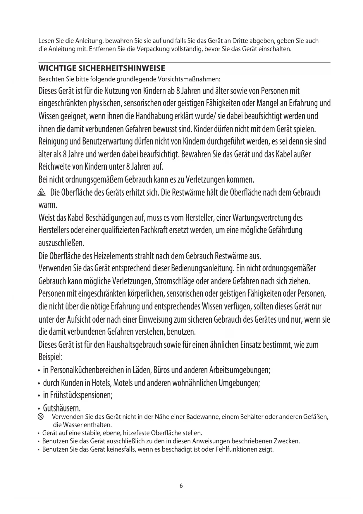 AE6 Lesen Sie die Anleitung, bewahren Sie sie auf und falls Sie das Gerät an Dritte abgeben, geben Sie auch die Anleitung mit. Entfernen Sie die Verpackung vollständig, bevor Sie das Gerät einschalten. WICHTIGE SICHERHEITSHINWEISE Beachten Sie bitte folgende grundlegende Vorsichtsmaßnahmen: Dieses Gerät ist für die Nutzung von Kindern ab 8 Jahren und älter sowie von Personen mit eingeschränkten physischen, sensorischen oder geistigen Fähigkeiten oder Mangel an Erfahrung und Wissen geeignet, wenn ihnen die Handhabung erklärt wurde/ sie dabei beaufsichtigt werden und ihnen die damit verbundenen Gefahren bewusst sind. Kinder dürfen nicht mit dem Gerät spielen. Reinigung und Benutzerwartung dürfen nicht von Kindern durchgeführt werden, es sei denn sie sind älter als 8 Jahre und werden dabei beaufsichtigt. Bewahren Sie das Gerät und das Kabel außer Reichweite von Kindern unter 8 Jahren auf. Bei nicht ordnungsgemäßem Gebrauch kann es zu Verletzungen kommen. h Die Oberfläche des Geräts erhitzt sich. Die Restwärme hält die Oberfläche nach dem Gebrauch warm. Weist das Kabel Beschädigungen auf, muss es vom Hersteller, einer Wartungsvertretung des Herstellers oder einer qualifizierten Fachkraft ersetzt werden, um eine mögliche Gefährdung auszuschließen. Die Oberfläche des Heizelements strahlt nach dem Gebrauch Restwärme aus. Verwenden Sie das Gerät entsprechend dieser Bedienungsanleitung. Ein nicht ordnungsgemäßer Gebrauch kann mögliche Verletzungen, Stromschläge oder andere Gefahren nach sich ziehen. Personen mit eingeschränkten körperlichen, sensorischen oder geistigen Fähigkeiten oder Personen, die nicht über die nötige Erfahrung und entsprechendes Wissen verfügen, sollten dieses Gerät nur unter der Aufsicht oder nach einer Einweisung zum sicheren Gebrauch des Gerätes und nur, wenn sie die damit verbundenen Gefahren verstehen, benutzen. Dieses Gerät ist für den Haushaltsgebrauch sowie für einen ähnlichen Einsatz bestimmt, wie zum Beispiel: