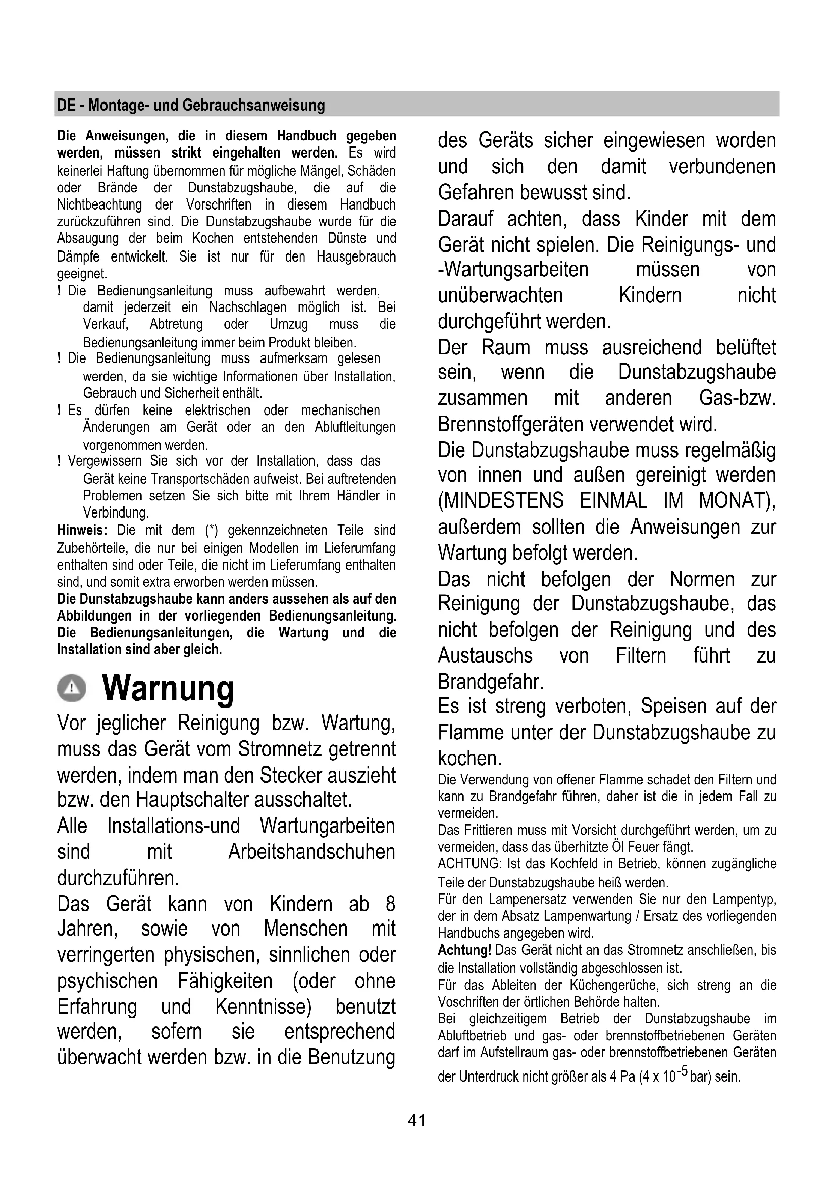 Maintenance Cleaning Clean using ONLY the cloth dampened with neutral liquid detergent. DO NOT CLEAN WITH TOOLS OR INSTRUMENTS. Do not use abrasive products. DO NOT USE ALCOHOL! Grease filter Fig. 28-29-30 Traps cooking grease particles. This must be cleaned at least once a month (or when the filter saturation indication system - envisaged on the model in possession - indicates this necessity), using non-aggressive detergents, in a dishwasher, which must be set to a low temperature and a short cycle (Tmax: 70°C). When washed in a dishwasher, metal parts may discolour slightly. The filter must be dried in an oven for one hour at a max temperature of 100°C; if the filter is still moist, repeat the operation. Replace the filter at least every 2 years. Attention! After having performed maintenance on the filter, FIRST install the grease filter in the specific container and THEN the charcoal filter. The latter can be recognised as it is sealed inside a braiding. Once the container has been repositioned, make sure only the grease filter is visible. Charcoal filter (filter version only) Fig. 28-29-30 It absorbs unpleasant odours caused by cooking. Attention! The active charcoal filter can be recognised as it is sealed inside a braiding. Perform disassembly, maintenance and cleaning operations of the filter, managing it with the utmost care to avoid damaging or opening the braiding. The charcoal filter can be washed once every two months (or when the filter saturation indication system – if envisaged on the model in possession – indicates this necessity) using hot water and a suitable detergent, or in a dishwasher at 65°C (if the dishwasher is used, select the full cycle function and leave dishes out). Eliminate excess water without damaging the filter, then put it in the oven for 10 minutes at 100° C to dry completely. Replace the mattress every 3 years and when the cloth is damaged. Attention! After having performed maintenance on the filter, FIRST install the grease filter in the specific container and THEN the charcoal filter. The latter can be recognised as it is sealed inside a braiding. Once the container has been repositioned, make sure only the grease filter is visible. Replacing lamps Fig. 29 The hood is equipped with a lighting system based on LED technology. The LEDs guarantee an optimum lighting, a duration up to 10 times as long as the traditional lamps and allow to save 90% electrical energy. To purchase spare LEDs, contact the technical assistance service.41 DE - Montage- und Gebrauchsanweisung Die Anweisungen, die in diesem Handbuch gegeben werden, müssen strikt eingehalten werden. Es wird keinerlei Haftung übernommen für mögliche Mängel, Schäden oder Brände der Dunstabzugshaube, die auf die Nichtbeachtung der Vorschriften in diesem Handbuch zurückzuführen sind. Die Dunstabzugshaube wurde für die Absaugung der beim Kochen entstehenden Dünste und Dämpfe entwickelt. Sie ist nur für den Hausgebrauch geeignet. ! Die Bedienungsanleitung muss aufbewahrt werden, damit jederzeit ein Nachschlagen möglich ist. Bei Verkauf, Abtretung oder Umzug muss die Bedienungsanleitung immer beim Produkt bleiben. ! Die Bedienungsanleitung muss aufmerksam gelesen werden, da sie wichtige Informationen über Installation, Gebrauch und Sicherheit enthält. ! Es dürfen keine elektrischen oder mechanischen Änderungen am Gerät oder an den Abluftleitungen vorgenommen werden. ! Vergewissern Sie sich vor der Installation, dass das Gerät keine Transportschäden aufweist. Bei auftretenden Problemen setzen Sie sich bitte mit Ihrem Händler in Verbindung. Hinweis: Die mit dem (*) gekennzeichneten Teile sind Zubehörteile, die nur bei einigen Modellen im Lieferumfang enthalten sind oder Teile, die nicht im Lieferumfang enthalten sind, und somit extra erworben werden müssen. Die Dunstabzugshaube kann anders aussehen als auf den Abbildungen in der vorliegenden Bedienungsanleitung. Die Bedienungsanleitungen, die Wartung und die Installation sind aber gleich. Warnung Vor jeglicher Reinigung bzw. Wartung, muss das Gerät vom Stromnetz getrennt werden, indem man den Stecker auszieht bzw. den Hauptschalter ausschaltet. Alle Installations-und Wartungarbeiten sind mit Arbeitshandschuhen durchzuführen. Das Gerät kann von Kindern ab 8 Jahren, sowie von Menschen mit verringerten physischen, sinnlichen oder psychischen Fähigkeiten (oder ohne Erfahrung und Kenntnisse) benutzt werden, sofern sie entsprechend überwacht werden bzw. in die Benutzung des Geräts sicher eingewiesen worden und sich den damit verbundenen Gefahren bewusst sind. Darauf achten, dass Kinder mit dem Gerät nicht spielen. Die Reinigungs- und -Wartungsarbeiten müssen von unüberwachten Kindern nicht durchgeführt werden. Der Raum muss ausreichend belüftet sein, wenn die Dunstabzugshaube zusammen mit anderen Gas-bzw. Brennstoffgeräten verwendet wird. Die Dunstabzugshaube muss regelmäßig von innen und außen gereinigt werden (MINDESTENS EINMAL IM MONAT), außerdem sollten die Anweisungen zur Wartung befolgt werden. Das nicht befolgen der Normen zur Reinigung der Dunstabzugshaube, das nicht befolgen der Reinigung und des Austauschs von Filtern führt zu Brandgefahr. Es ist streng verboten, Speisen auf der Flamme unter der Dunstabzugshaube zu kochen. Die Verwendung von offener Flamme schadet den Filtern und kann zu Brandgefahr führen, daher ist die in jedem Fall zu vermeiden. Das Frittieren muss mit Vorsicht durchgeführt werden, um zu vermeiden, dass das überhitzte Öl Feuer fängt. ACHTUNG: Ist das Kochfeld in Betrieb, können zugängliche Teile der Dunstabzugshaube heiß werden. Für den Lampenersatz verwenden Sie nur den Lampentyp, der in dem Absatz Lampenwartung / Ersatz des vorliegenden Handbuchs angegeben wird. Achtung! Das Gerät nicht an das Stromnetz anschließen, bis die Installation vollständig abgeschlossen ist. Für das Ableiten der Küchengerüche, sich streng an die Voschriften der örtlichen Behörde halten. Be