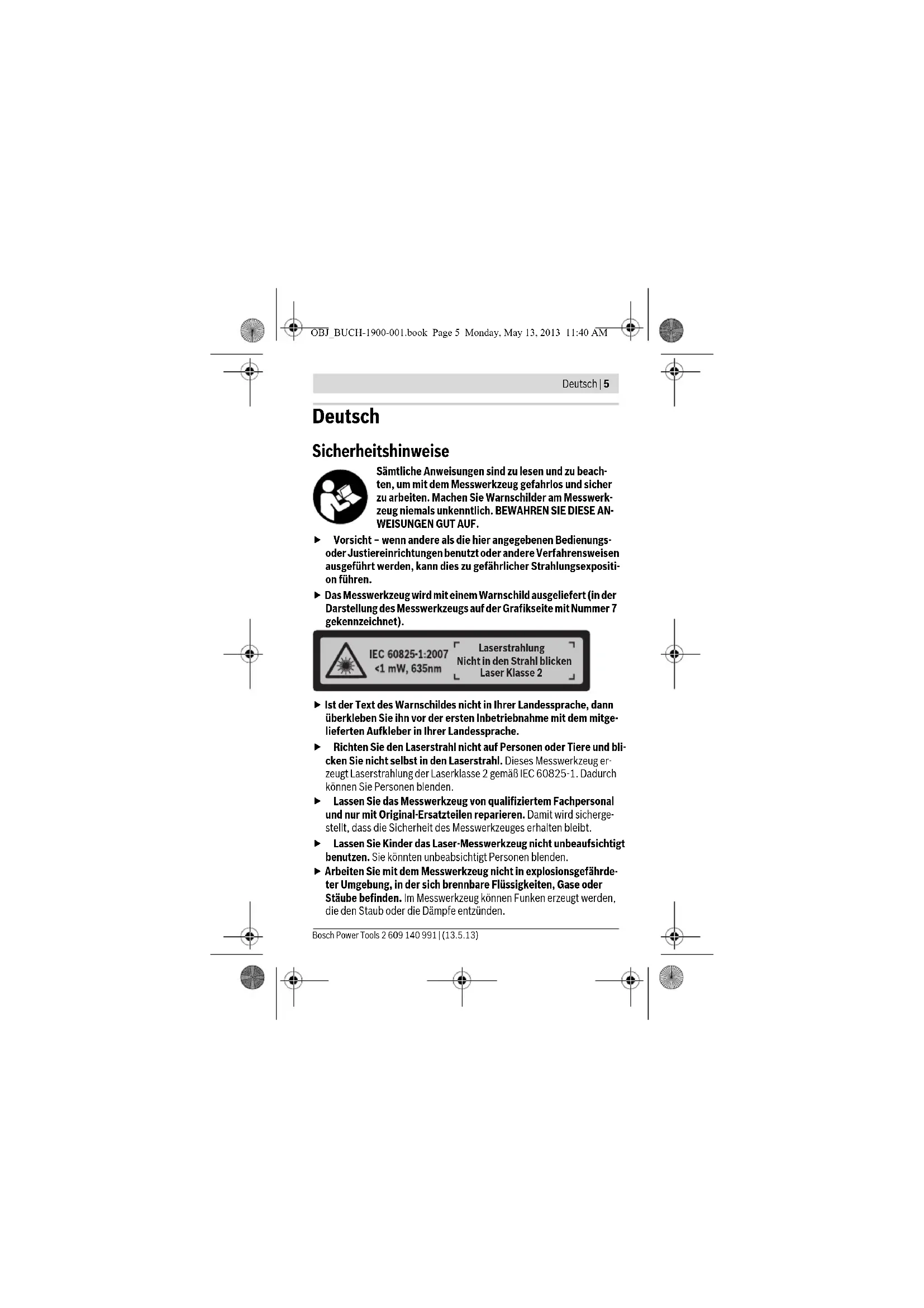 OBJ_BUCH-1900-001.book Page 4 Monday, May 13, 2013 11:40 AMDeutsch | 5 Bosch Power Tools 2 609 140 991 | (13.5.13) Deutsch Sicherheitshinweise Sämtliche Anweisungen sind zu lesen und zu beach- ten, um mit dem Messwerkzeug gefahrlos und sicher zu arbeiten. Machen Sie Warnschilder am Messwerk- zeug niemals unkenntlich. BEWAHREN SIE DIESE AN- WEISUNGEN GUT AUF. Vorsicht – wenn andere als die hier angegebenen Bedienungs- oder Justiereinrichtungen benutzt oder andere Verfahrensweisen ausgeführt werden, kann dies zu gefährlicher Strahlungsexpositi- on führen. Das Messwerkzeug wird mit einem Warnschild ausgeliefert (in der Darstellung des Messwerkzeugs auf der Grafikseite mit Nummer 7 gekennzeichnet). Ist der Text des Warnschildes nicht in Ihrer Landessprache, dann überkleben Sie ihn vor der ersten Inbetriebnahme mit dem mitge- lieferten Aufkleber in Ihrer Landessprache. Richten Sie den Laserstrahl nicht auf Personen oder Tiere und bli- cken Sie nicht selbst in den Laserstrahl. Dieses Messwerkzeug er- zeugt Laserstrahlung der Laserklasse 2 gemäß IEC 60825-1. Dadurch können Sie Personen blenden. Lassen Sie das Messwerkzeug von qualifiziertem Fachpersonal und nur mit Original-Ersatzteilen reparieren. Damit wird sicherge- stellt, dass die Sicherheit des Messwerkzeuges erhalten bleibt. Lassen Sie Kinder das Laser-Messwerkzeug nicht unbeaufsichtigt benutzen. Sie könnten unbeabsichtigt Personen blenden. Arbeiten Sie mit dem Messwerkzeug nicht in explosionsgefährde- ter Umgebung, in der sich brennbare Flüssigkeiten, Gase oder Stäube befinden. Im Messwerkzeug können Funken erzeugt werden, die den Staub oder die Dämpfe entzünden. Laserstrahlung Laser Klasse 2 Nicht in den Strahl blicken OBJ_BUCH-1900-001.book Page 5 Monday, May 13, 2013 11:40 AM6 | Deutsch 2 609 140 991 | (13.5.13) Bosch Power Tools Produkt- und Leistungsbeschreibung Bestimmungsgemäßer Gebrauch Das Messwerkzeug ist bestimmt zum Messen von Entfernungen, Längen, Höhen und Abständen. Das Messwerkzeug ist geeignet zum Messen im In- nenbereich. Abgebildete Komponenten Die Nummerierung der abgebildeten Komponenten bezieht sich auf die Darstellung des Messwerkzeugs auf der Grafikseite. 1 Ein-/Ausschalter 2 „HOLD“-Taste 3 Display 4 Batteriefachdeckel 5 Arretierung des Batteriefachdeckels 6 Seriennummer 7 Laser-Warnschild 8 Empfangslinse 9 Ausgang Laserstrahlung