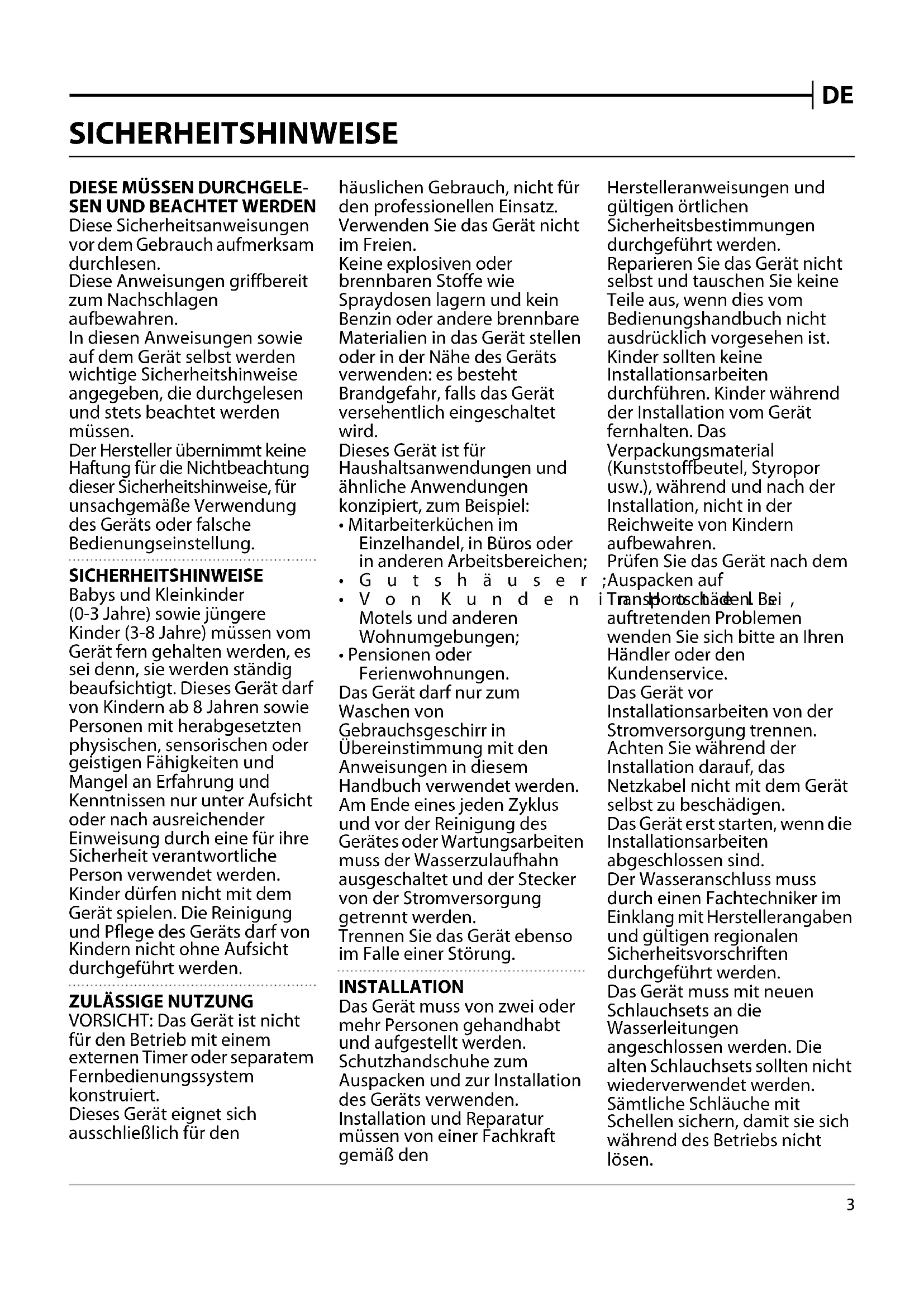 - Pensionen oder Ferienwohnungen. Das Gerät darf nur zum Waschen von Gebrauchsgeschirr in Übereinstimmung mit den Anweisungen in diesem Handbuch verwendet werden. Am Ende eines jeden Zyklus und vor der Reinigung des Gerätes oder Wartungsarbeiten muss der Wasserzulaufhahn ausgeschaltet und der Stecker von der Stromversorgung getrennt werden. Trennen Sie das Gerät ebenso im Falle einer Störung. INSTALLATION Das Gerät muss von zwei oder mehr Personen gehandhabt und aufgestellt werden. Schutzhandschuhe zum Auspacken und zur Installation des Geräts verwenden. Installation und Reparatur müssen von einer Fachkraft gemäß den Herstelleranweisungen und gültigen örtlichen Sicherheitsbestimmungen durchgeführt werden. Reparieren Sie das Gerät nicht selbst und tauschen Sie keine Teile aus, wenn dies vom Bedienungshandbuch nicht ausdrücklich vorgesehen ist. Kinder sollten keine Installationsarbeiten durchführen. Kinder während der Installation vom Gerät fernhalten. Das Verpackungsmaterial (Kunststoffbeutel, Styropor usw.), während und nach der Installation, nicht in der Reichweite von Kindern aufbewahren. Prüfen Sie das Gerät nach dem Auspacken auf Transportschäden. Bei auftretenden Problemen wenden Sie sich bitte an Ihren Händler oder den Kundenservice. Das Gerät vor Installationsarbeiten von der Stromversorgung trennen. Achten Sie während der Installation darauf, das Netzkabel nicht mit dem Gerät selbst zu beschädigen. Das Gerät erst starten, wenn die Installationsarbeiten abgeschlossen sind. Der Wasseranschluss muss durch einen Fachtechniker im Einklang mit Herstellerangaben und gültigen regionalen Sicherheitsvorschriften durchgeführt werden. Das Gerät muss mit neuen Schlauchsets an die Wasserleitungen angeschlossen werden. Die alten Schlauchsets sollten nicht wiederverwendet werden. Sämtliche Schläuche mit Schellen sichern, damit sie sich während des Betriebs nicht lösen. DE4 Besondere Vorschriften des regionalen Wasserwirtschaftsamts beachten. Wasserzulaufdruck 0,05-1.0 MPa. Die Wasserzulauftemperatur ist abhängig von dem Geschirrspülermodell. Wenn der installierte Zulaufschlauch mit "25°C max" markiert ist, ist die maximal zugelassene Wassertemperatur 25°C. Für alle anderen Modelle ist die maximal zugelassene Wassertemperatur 60°C. Die Schläuche nicht schneiden und, bei Geräten mit Wasserstoppsystem das Kunststoffgehäuse mit dem Zulaufschlauch nicht in Wasser tauchen. Den Fachhändler kontaktieren, wenn die Schläuche zu kurz sind. Zu- und Ablaufschlauch knickfrei verlegen. Vor der ersten Verwendung des Geräts den Wasserzulauf und den Ablaufschlauch auf Undichtigkeiten prüfen. Während des Gebrauchs muss der Zugang zur Rückwand an der Wand oder an einem anderen Möbelstück beschränkt werden. Vergewissern Sie sich bei Installation des Geräts, dass die vier Füße fest auf dem Boden aufliegen. Stellen Sie diese dementsprechend ein. Kontrollieren Sie mit einer Wasserwaage, dass das Gerät vollkommen eben und standfest ist. Wenn das Gerät am Ende einer Reihe von Einheiten installiert wird und die Seitenverkleidung zugänglich gemacht wird, muss der Scharnierbereich abgedeckt sein, um Quetschgefahr zu vermeiden. Für Geschirrspüler mit Entlüftungsschlitzen am Boden, dürfen die Schlitze nicht durch einen Teppich verstopft sein.