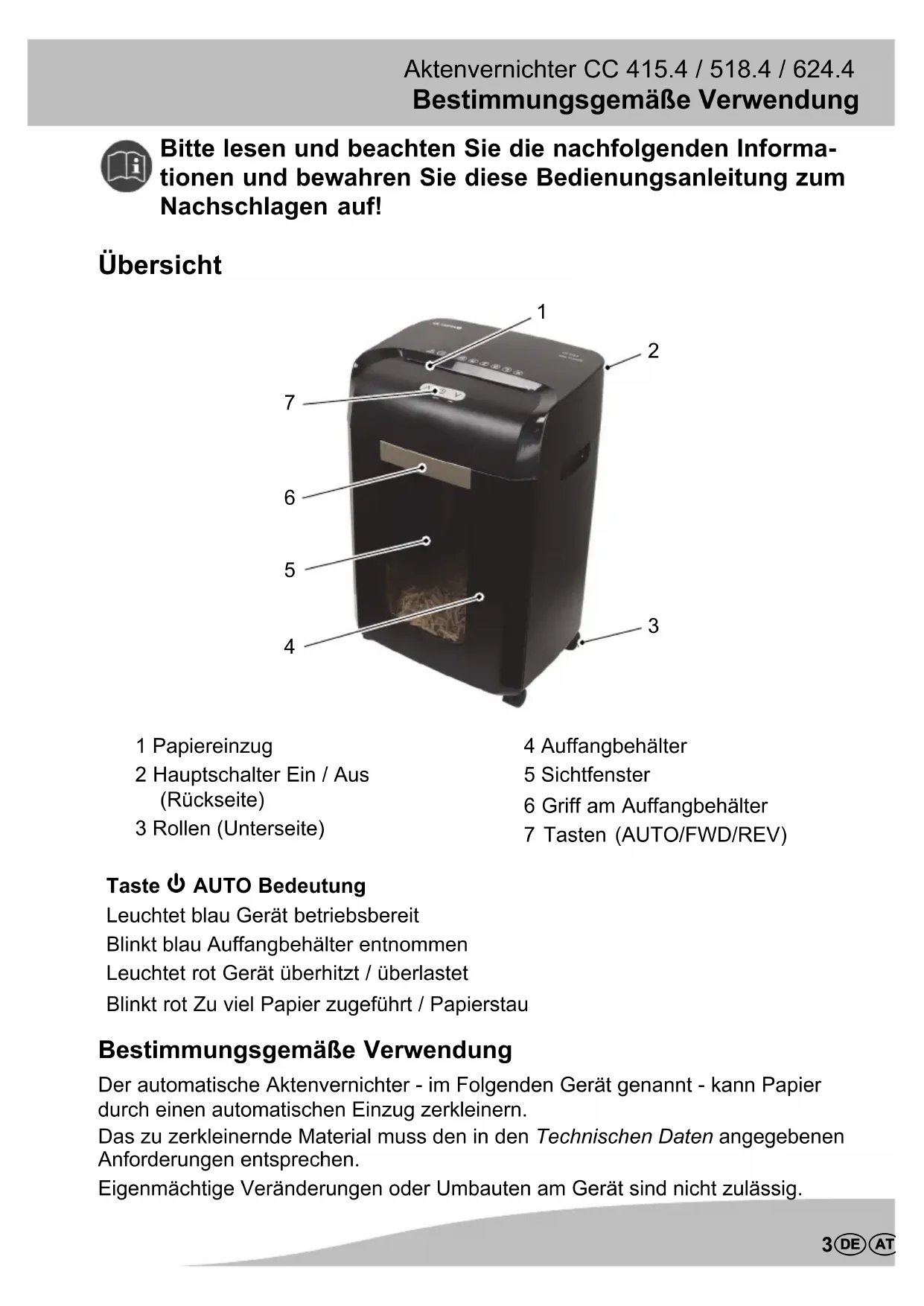 1 Papiereinzug 2 Hauptschalter Ein / Aus (Rückseite) 3 Rollen (Unterseite) 4 Auffangbehälter 5 Sichtfenster 6 Griff am Auffangbehälter 7 Tasten (AUTO/FWD/REV) Taste AUTO Bedeutung Leuchtet blau Gerät betriebsbereit Blinkt blau Auffangbehälter entnommen Leuchtet rot Gerät überhitzt / überlastet Blinkt rot Zu viel Papier zugeführt / Papierstau Bestimmungsgemäße Verwendung Der automatische Aktenvernichter - im Folgenden Gerät genannt - kann Papier durch einen automatischen Einzug zerkleinern. Das zu zerkleinernde Material muss den in den Technischen Daten angegebenen Anforderungen entsprechen. Eigenmächtige Veränderungen oder Umbauten am Gerät sind nicht zulässig.Sicherheitshinweise Aktenvernichter CC 415.4 / 518.4 / 624.4
