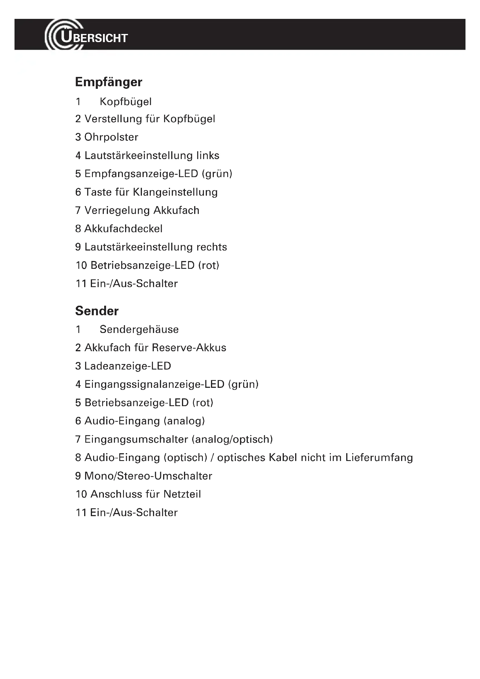 6 7 8 9 10 11Empfänger 1 Kopfbügel 2 Verstellung für Kopfbügel 3 Ohrpolster 4 Lautstärkeeinstellung links 5 Empfangsanzeige-LED (grün) 6 Taste für Klangeinstellung 7 Verriegelung Akkufach 8 Akkufachdeckel 9 Lautstärkeeinstellung rechts 10 Betriebsanzeige-LED (rot) 11 Ein-/Aus-Schalter Sender 1 Sendergehäuse 2 Akkufach für Reserve-Akkus 3 Ladeanzeige-LED 4 Eingangssignalanzeige-LED (grün) 5 Betriebsanzeige-LED (rot) 6 Audio-Eingang (analog) 7 Eingangsumschalter (analog/optisch) 8 Audio-Eingang (optisch) / optisches Kabel nicht im Lieferumfang 9 Mono/Stereo-Umschalter 10 Anschluss für Netzteil 11 Ein-/Aus-Schalter ÜBERSICHT1 HS 1300 in Betrieb nehmenHS 1300 in Betrieb nehmen Verpackungsinhalt