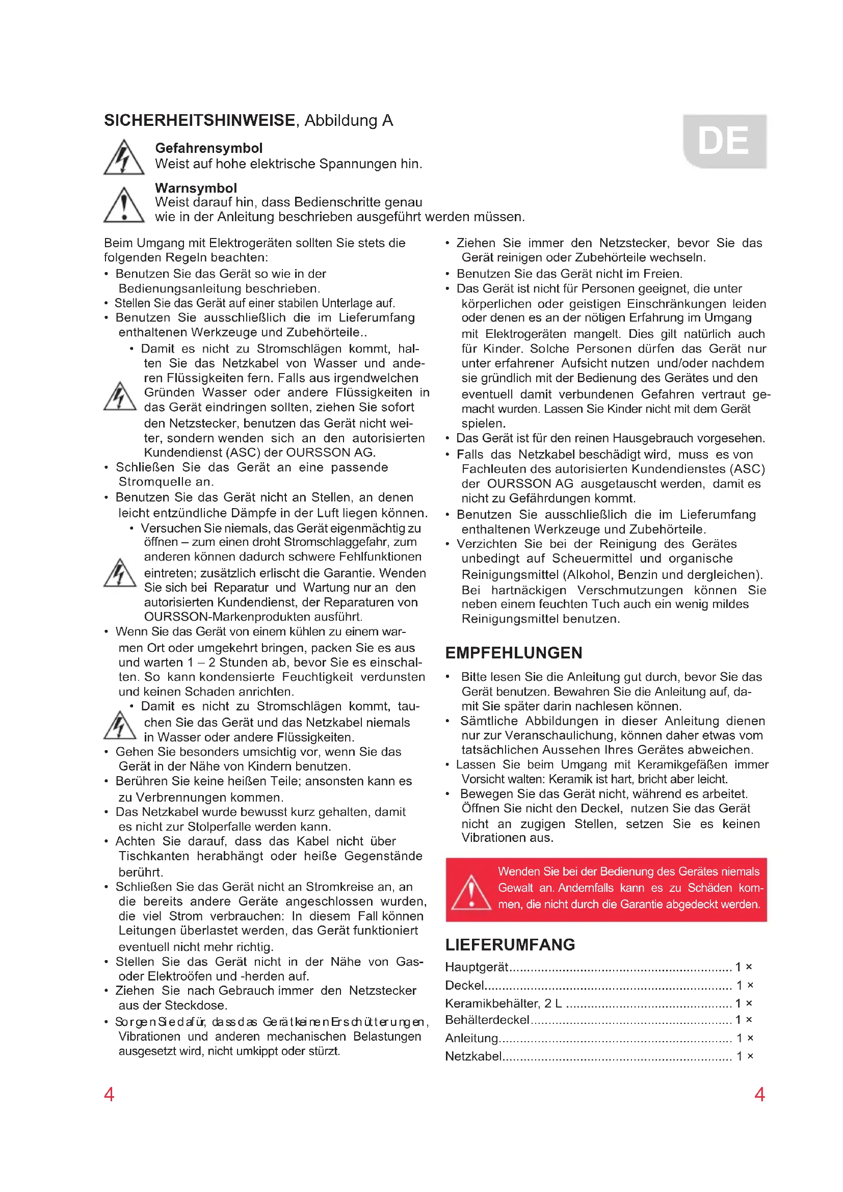 von Keramikbehälter und Hauptgerät heben, die Zubereitung kann in das Hauptgerät ießen.7 ZERTIFIZIERUNG Hinweise zur Produktzertizierung nden Sie unter http://www.oursson.com; Sie können auch Ihren Händler danach fragen. Reparaturen dürfen nur über den Kundendienst der OURSSON AG ausgeführt werden. Waren, durch Eingriffe Dritter oder Höhere Gewalt ver- ursacht werden. Dazu zählen: