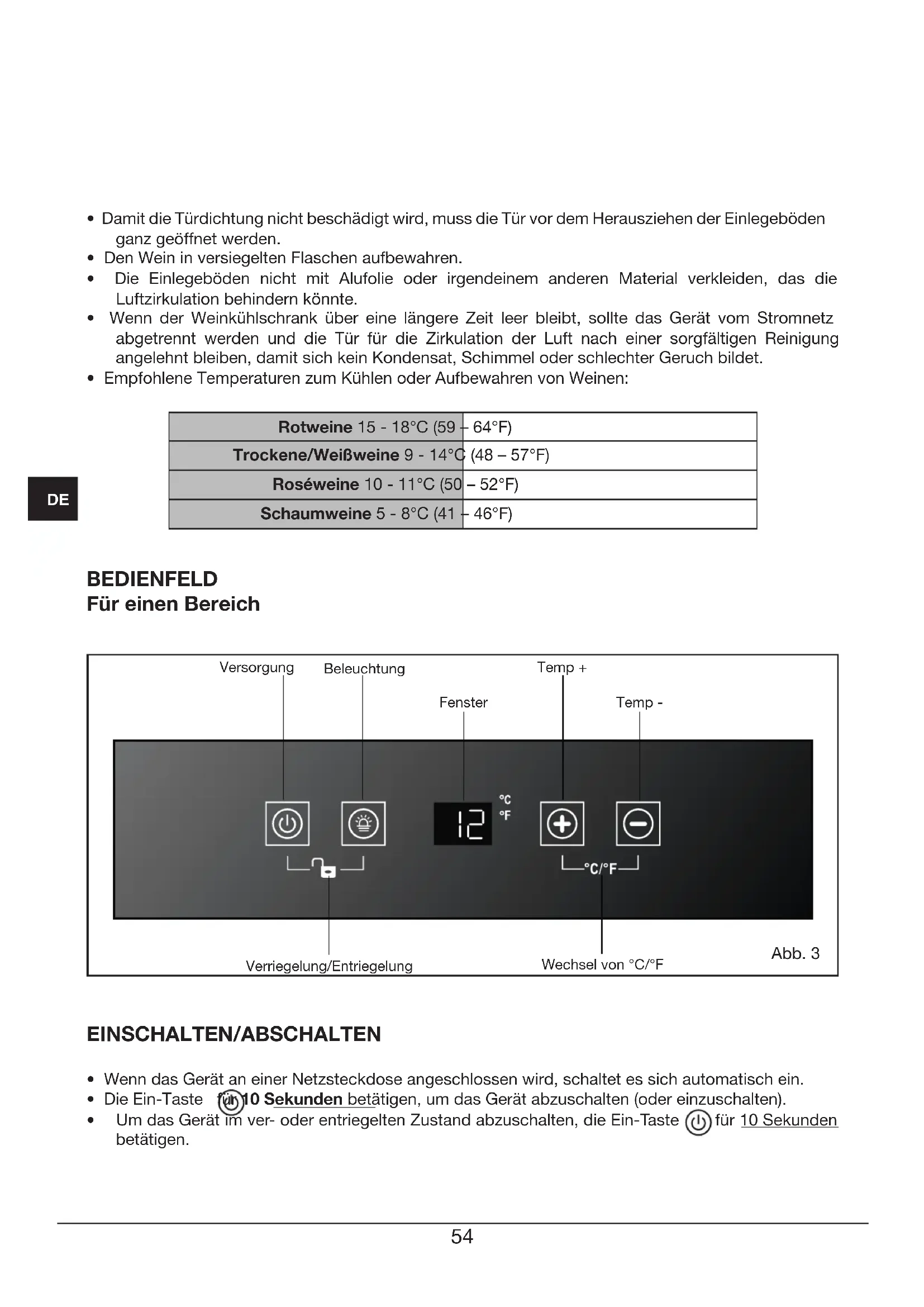 - Empfohlene Temperaturen zum Kühlen oder Aufbewahren von Weinen: Rotweine 15 - 18°C (59 – 64°F) Trockene/Weißweine 9 - 14°C (48 – 57°F) Roséweine 10 - 11°C (50 – 52°F) Schaumweine 5 - 8°C (41 – 46°F) BEDIENFELD Für einen Bereich