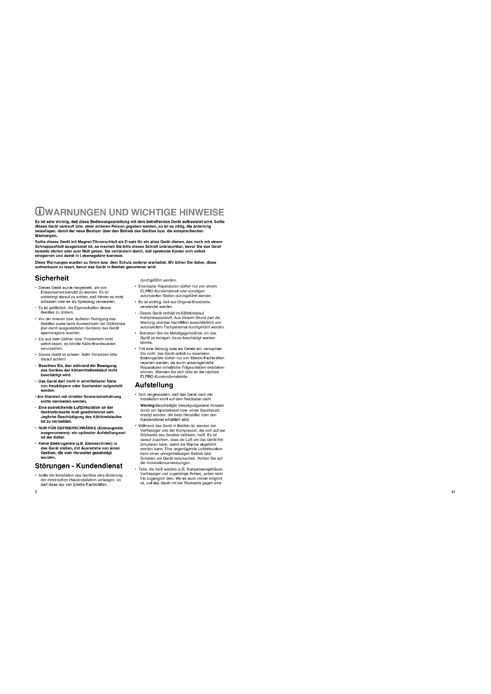Es ist sehr wichtig, da§ diese Bedienungsanleitung mit dem betreffenden GerŠt aufbewahrt wird. Sollte dieses GerŠt verkauft bzw. einer anderen Person gegeben werden, so ist es nštig, die Anleitung beizufŸgen, damit der neue Besitzer Ÿber den Betrieb des GerŠtes bzw. die entsprechenden Warnungen. Sollte dieses GerŠt mit Magnet-TŸrverschlu§ als Ersatz fŸr ein altes GerŠt dienen, das noch mit einem Schnappschlo§ ausgerŸstet ist, so machen Sie bitte dieses Schlo§ unbrauchbar, bevor Sie das GerŠt beiseite stellen oder zum MŸll geben. Sie verhindern damit, da§ spielende Kinder sich selbst einsperren und damit in Lebensgefahr kommen. Diese Warnungen wurden zu Ihrem bzw. dem Schutz anderer erarbeitet. Wir bitten Sie daher, diese aufmerksam zu lesen, bevor das GerŠt in Betrieb genommen wird. Sicherheit ¥ Dieses GerŠt wurde hergestellt, um von Erwachsenen benutzt zu werden. Es ist unbedingt darauf zu achten, da§ Kinder es nicht anfassen oder es als Spielzeug verwenden. ¥ Es ist gefŠhrlich, die Eigenschaften dieses GerŠtes zu Šndern. ¥ Vor der inneren bzw. Šu§eren Reinigung des GerŠtes sowie beim Auswechseln der GlŸhlampe (bei damit ausgestatteten GerŠten) das GerŠt spannungslos machen. ¥ Eis aus dem Gefrier- bzw. Frosterfach nicht sofort essen, es kšnnte KŠlte-Brandwunden verursachen. ¥ Dieses GerŠt ist schwer. Beim Versetzen bitte darauf achten! ¥ Beachten Sie, dan wŠhrend der Bewegung des GerŠtes der KŠltemittelkreislauf nicht beschŠdigt wird. ¥ Das GerŠt darf nicht in unmittelbarer NŠhe von Heizkšrpern oder Gasherden aufgestellt werden. ¥ Ein Standort mit direkter Sonneneinstrahlung sollte vermieden werden. ¥ Eine ausreichende Luftzirkulation an der GerŠterŸckseite mu§ gewŠhrleistet sein. Jegliche BeschŠdigung des KŸhlkreislaufes ist zu vermeiden. ¥ NUR F†R GEFRIERSCHR€NKE (EinbaugerŠte ausgenommen): ein optimaler Aufstellungsort ist der Keller. ¥ Keine ElektrogerŠte (z.B. Eismaschinen) in das GerŠt stellen, mit Ausnahme von jenen GerŠten, die vom Hersteller genehmigt wurden. Stšrungen - Kundendienst ¥ Sollte die Installation des GerŠtes eine €nderung der elektrischen Hausinstallation verlangen, so darf diese nur von Elektro-FachkrŠften durchgefŸhrt werden. ¥ Eventuelle Reparaturen dŸrfen nur von einem ELPRO-Kundendienst oder sonstigen autorisierten Stellen durchgefŸhrt werden. ¥ Es ist wichtig, da§ nur Original-Ersatzteile verwendet werden. ¥ Dieses GerŠt enthŠlt im KŠltekreislauf Kohlenwasserstoff. Aus diesem Grund darf die Wartung und das Nachfiillen ausschlie§lich von autorisiertem Fachpersonal durchgefŸhrt werden. ¥ Benutzen Sie nie MetallgegenstŠnde um das GerŠt zu reinigen, da es beschŠdigt werden kšnnte. ¥ Tritt eine Stšrung oder ein Defekt ein, versuchen Sie nicht, das GerŠt selbst zu reparieren. ElektrogerŠte dŸrfen nur von Elektro-FachkrŠften repariert werden, da durch unsachgemЧe Reparaturen erhebliche FolgeschŠden entstehen kšnnen. Wenden Sie sich bitte an die nŠchste ELPRO-Kundendienststelle. Aufstellung ¥ Sich vergewissern, da§ das GerŠt nach der Installation nicht auf dem Netzkabel steht. Wichtig:BeschŠdigte Versorgungskabel mŸssen durch ein Spezialkabel bzw. einen Spezialsatz ersetzt werden, die beim Hersteller oder den Kundendienst erhŠltlich sind. ¥ WŠhrend das GerŠt in Betrieb ist, werden der VerflŸssiger und der Kompressor, die sich auf der RŸckseite des GerŠtes befinden, hei§. Es ist darauf zuachten, dass die Luft um das GerŠt frei zirkulieren kann, damit die WŠrme abgefŸhrt werden kann. Eine ungenŸgende Luftzirkulation kann einen unregelmŠssigen Betrieb bzw. SchŠden am GerŠt verursachen. Achten Sie auf die Installationsanweisungen. ¥ Teile, die hei§ werden (z.B. KompressorgehŠuse, VerflŸssiger und zugehšrige Rohre), sollen nicht frei zugŠnglich sein. Wo es auch immer mšglich ist, soll das GerŠt mit der RŸckseite gegen eine