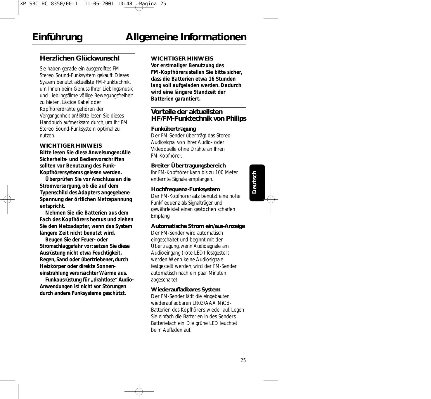 11-06-2001 10:48 Einführung Pagina 25 Allgemeine Informationen Herzlichen Glückwunsch! Sie haben gerade ein ausgereiftes FM Stereo Sound-Funksystem gekauft. Dieses System benutzt aktuellste FM-Funktechnik, um Ihnen beim Genuss Ihrer Lieblingsmusik und Lieblingsfilme völlige Bewegungsfreiheit zu bieten. Lästige Kabel oder Kopfhörerdrähte gehören der Vergangenheit an! Bitte lesen Sie dieses Handbuch aufmerksam durch, um Ihr FM Stereo Sound-Funksystem optimal zu nutzen. WICHTIGER HINWEIS Bitte lesen Sie diese Anweisungen:Alle Sicherheits- und Bedienvorschriften sollten vor Benutzung des FunkKopfhörersystems gelesen werden. Überprüfen Sie vor Anschluss an die Stromversorgung, ob die auf dem Typenschild des Adapters angegebene Spannung der örtlichen Netzspannung entspricht. Nehmen Sie die Batterien aus dem Fach des Kopfhörers heraus und ziehen Sie den Netzadapter, wenn das System längere Zeit nicht benutzt wird. Beugen Sie der Feuer- oder Stromschlaggefahr vor: setzen Sie diese Ausrüstung nicht etwa Feuchtigkeit, Regen, Sand oder übertriebener, durch Heizkörper oder direkte Sonneneinstrahlung verursachter Wärme aus. Funkausrüstung für „drahtlose“ AudioAnwendungen ist nicht vor Störungen durch andere Funksysteme geschützt. WICHTIGER HINWEIS Vor erstmaliger Benutzung des FM-Kopfhörers stellen Sie bitte sicher, dass die Batterien etwa 16 Stunden lang voll aufgeladen werden. Dadurch wird eine längere Standzeit der Batterien garantiert. Vorteile der aktuellsten HF/FM-Funktechnik von Philips Funkübertragung Der FM-Sender überträgt das StereoAudiosignal von Ihrer Audio- oder Videoquelle ohne Drähte an Ihren FM-Kopfhörer. Breiter Übertragungsbereich Ihr FM-Kopfhörer kann bis zu 100 Meter entfernte Signale empfangen. Deutsch