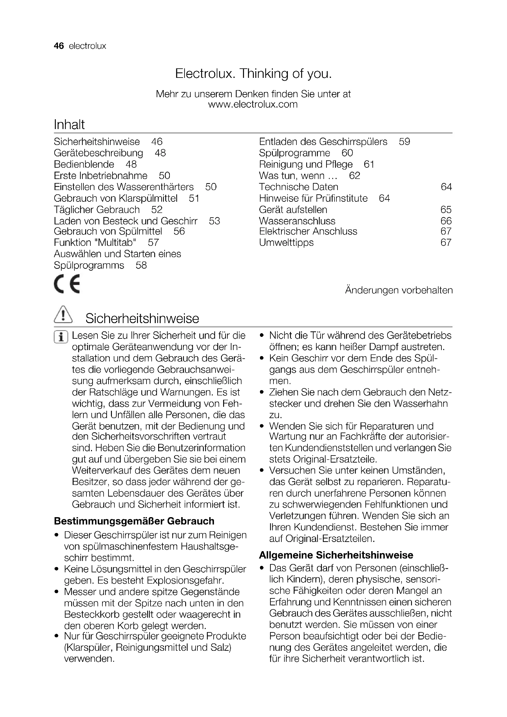 - Éliminez le loquet de la porte, cela évi- tera aux enfants de s'enfermer dans l'appareil et de mettre ainsi leur vie en danger. electrolux 45Electrolux. Thinking of you. Mehr zu unserem Denken finden Sie unter at www.electrolux.com Inhalt Sicherheitshinweise 46 Gerätebeschreibung 48 Bedienblende 48 Erste Inbetriebnahme 50 Einstellen des Wasserenthärters 50 Gebrauch von Klarspülmittel 51 Täglicher Gebrauch 52 Laden von Besteck und Geschirr 53 Gebrauch von Spülmittel 56 Funktion "Multitab" 57 Auswählen und Starten eines Spülprogramms 58 Entladen des Geschirrspülers 59 Spülprogramme 60 Reinigung und Pflege 61 Was tun, wenn … 62 Technische Daten 64 Hinweise für Prüfinstitute 64 Gerät aufstellen 65 Wasseranschluss 66 Elektrischer Anschluss 67 Umwelttipps 67 Änderungen vorbehalten Sicherheitshinweise Lesen Sie zu Ihrer Sicherheit und für die optimale Geräteanwendung vor der In- stallation und dem Gebrauch des Gerä- tes die vorliegende Gebrauchsanwei- sung aufmerksam durch, einschließlich der Ratschläge und Warnungen. Es ist wichtig, dass zur Vermeidung von Feh- lern und Unfällen alle Personen, die das Gerät benutzen, mit der Bedienung und den Sicherheitsvorschriften vertraut sind. Heben Sie die Benutzerinformation gut auf und übergeben Sie sie bei einem Weiterverkauf des Gerätes dem neuen Besitzer, so dass jeder während der ge- samten Lebensdauer des Gerätes über Gebrauch und Sicherheit informiert ist. Bestimmungsgemäßer Gebrauch